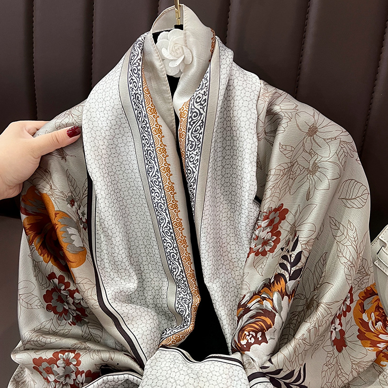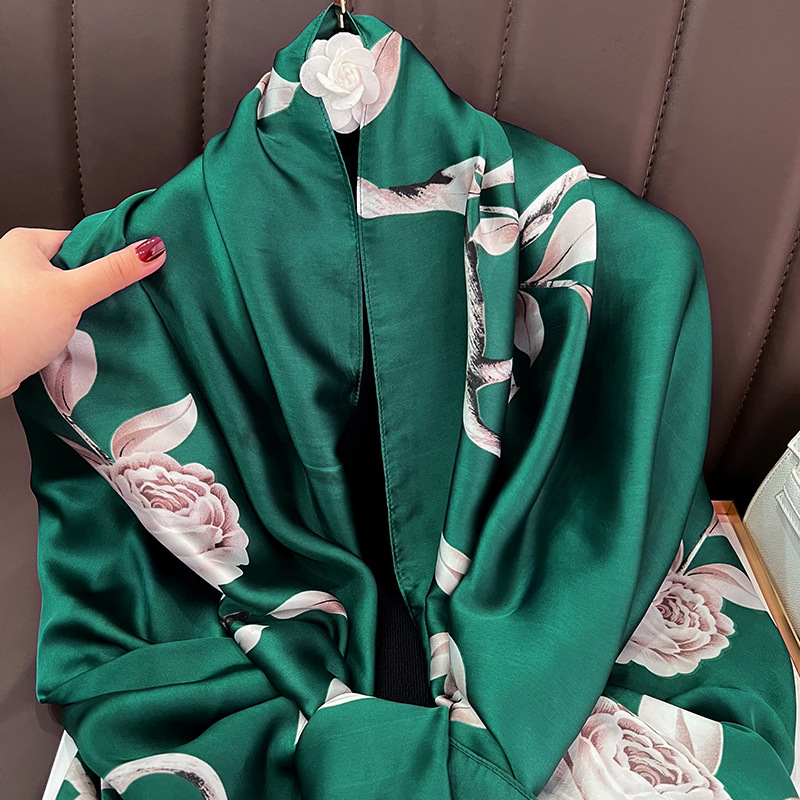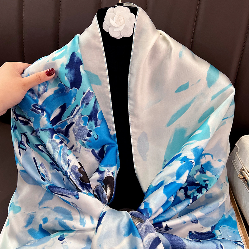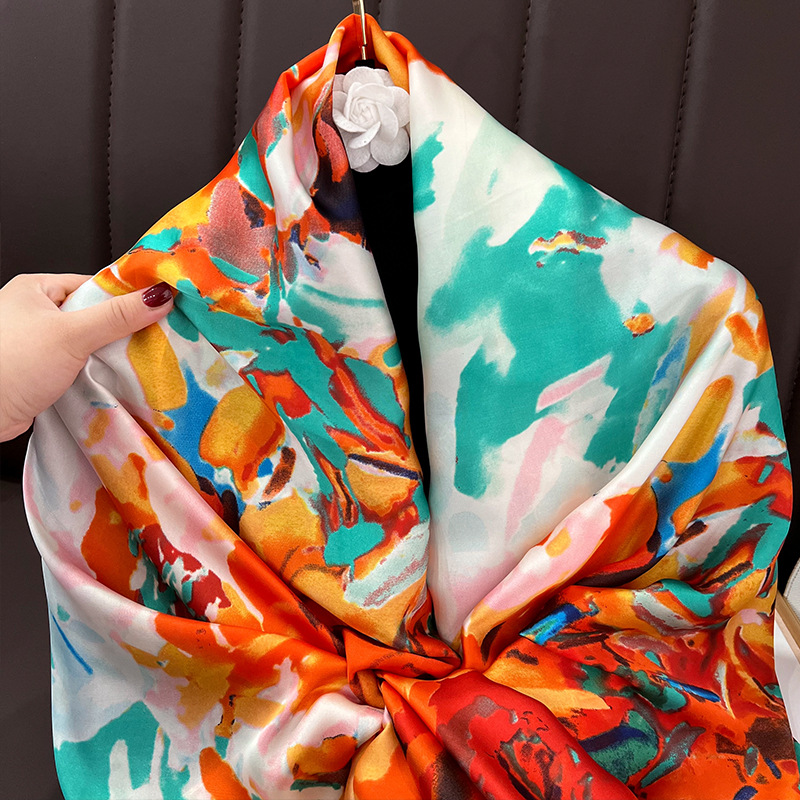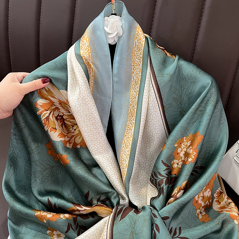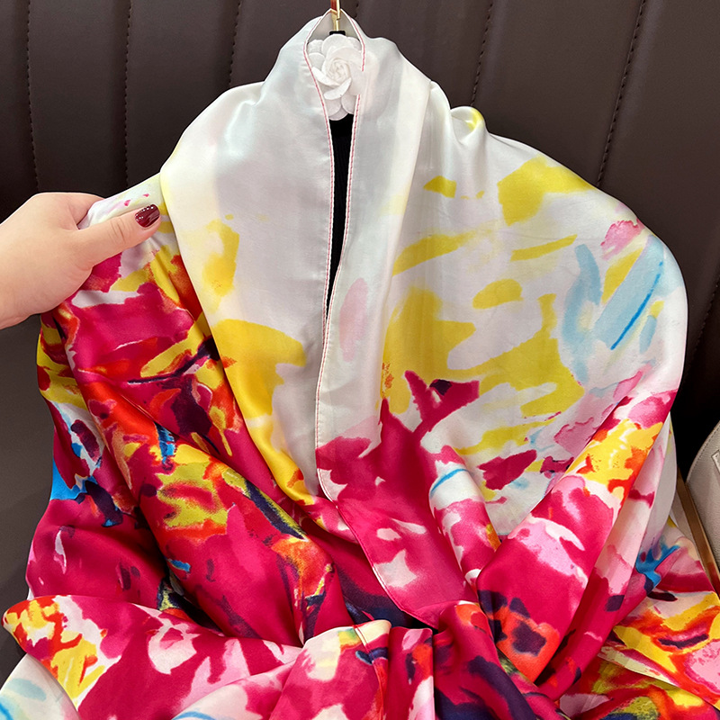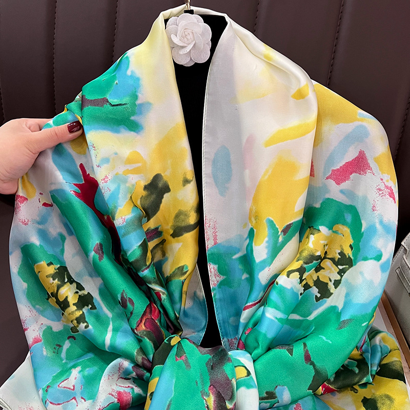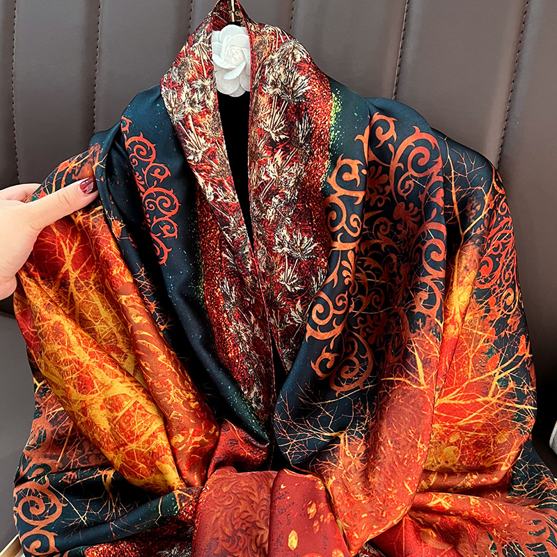 丝巾女春秋新款丽锦缎大长巾韩版时尚印花围巾空调披肩外搭沙滩巾