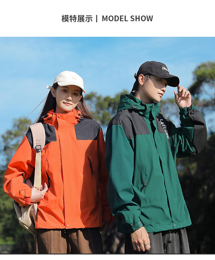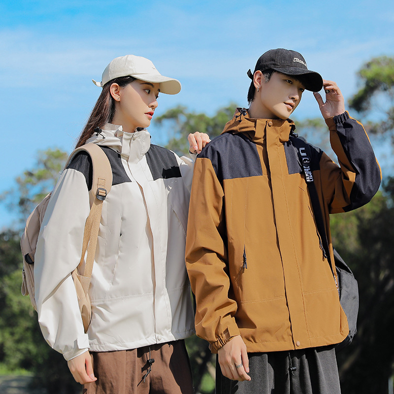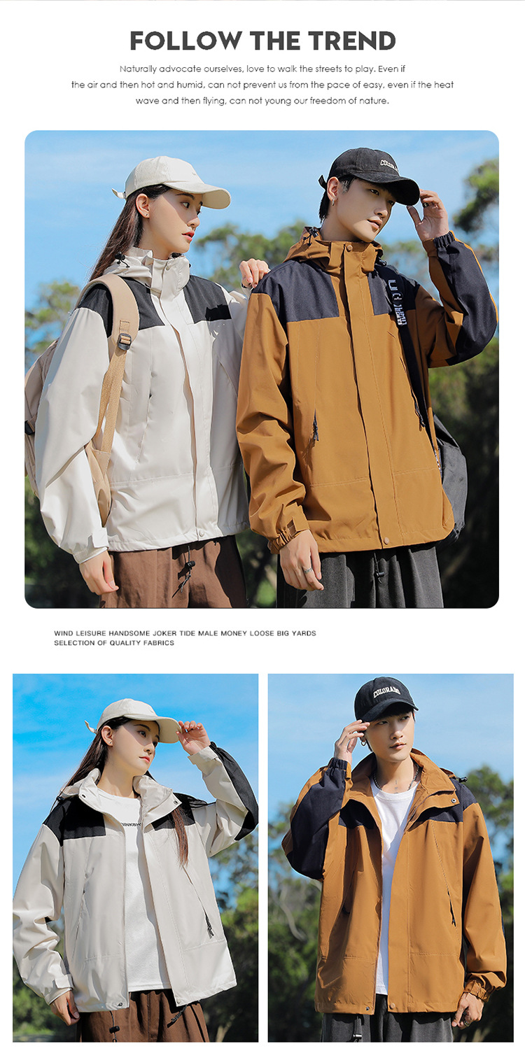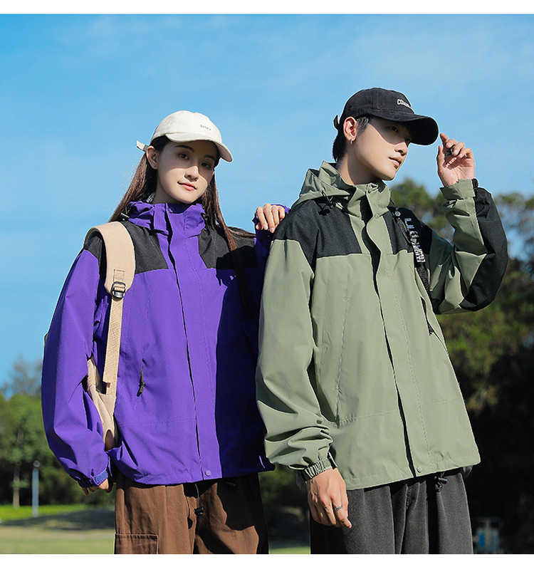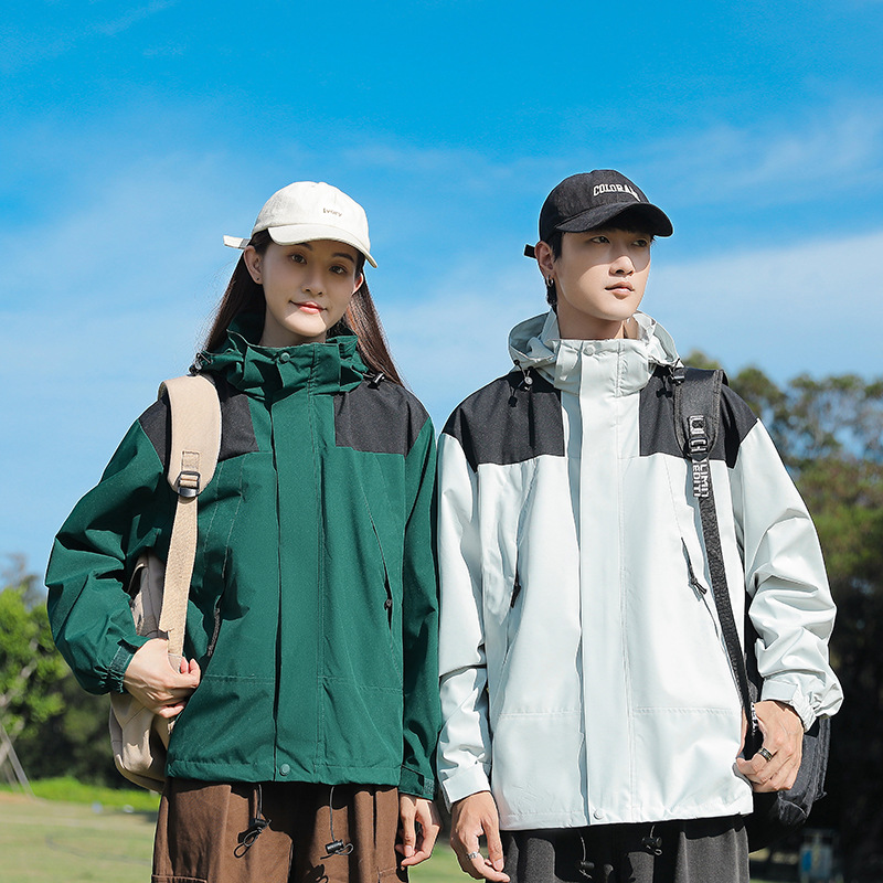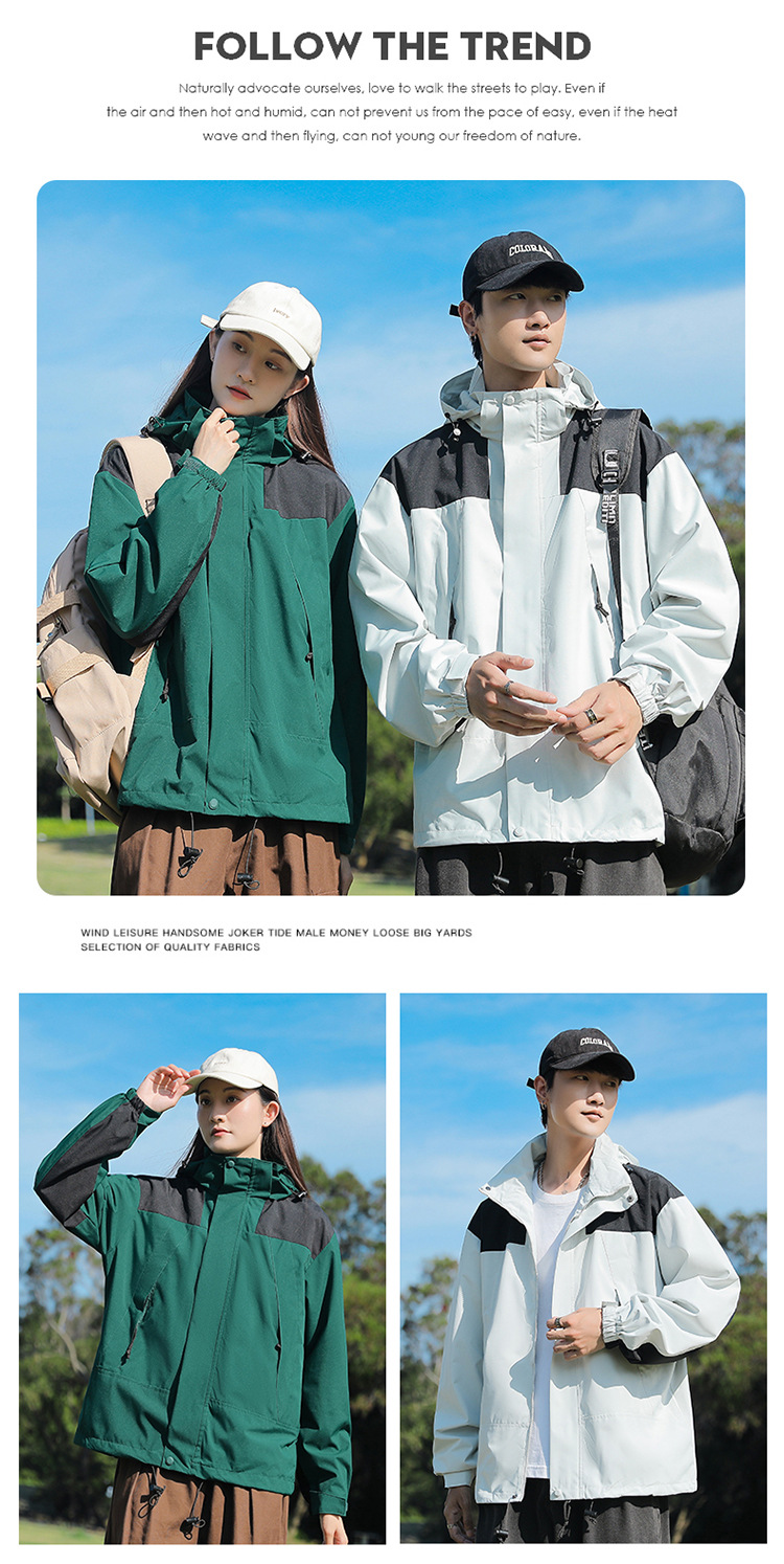 户外运动冲锋衣春秋男女同款开衫连帽上衣拼接情侣防风防水登山服
