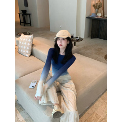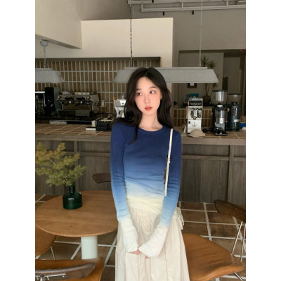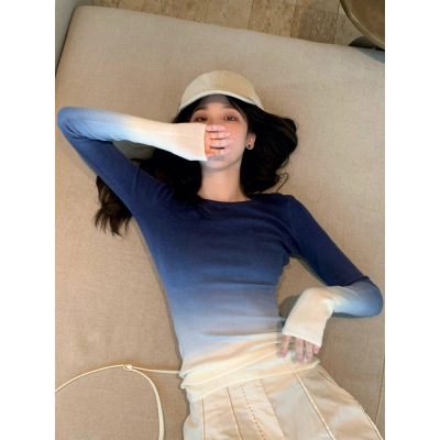 渐变蓝色针织长袖t恤女春秋季甜辣设计感小众修身上衣内搭打底衫