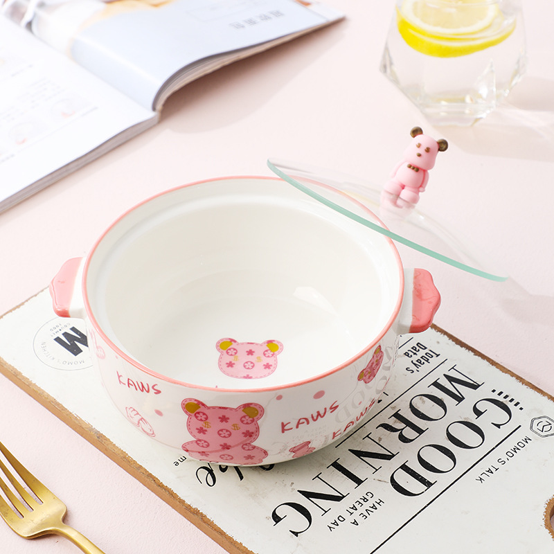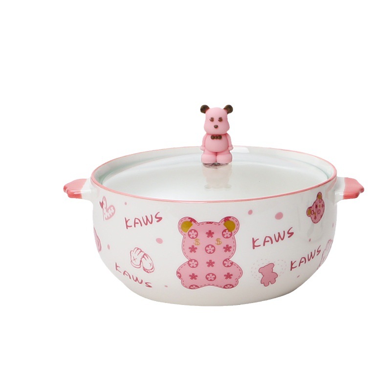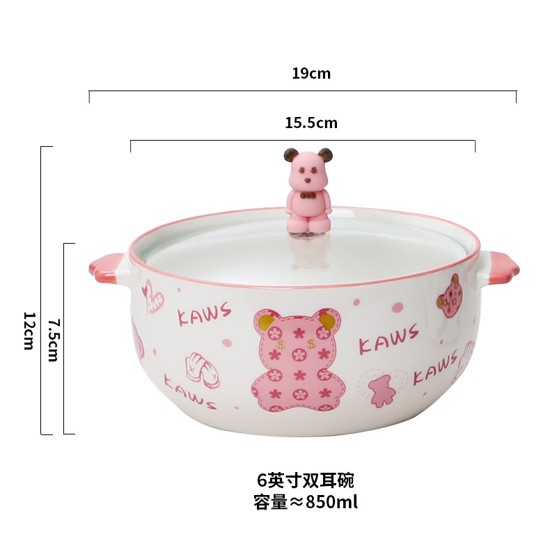 陶瓷盘餐具家用可爱卡通粉萌暴力熊陶瓷带盖汤碗泡面碗微波炉适用