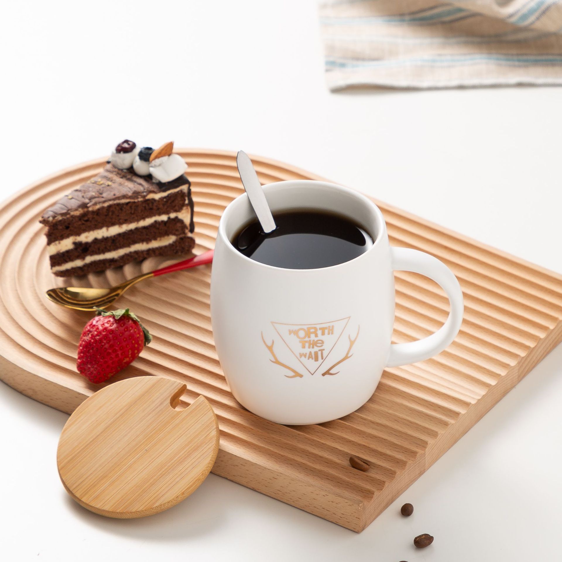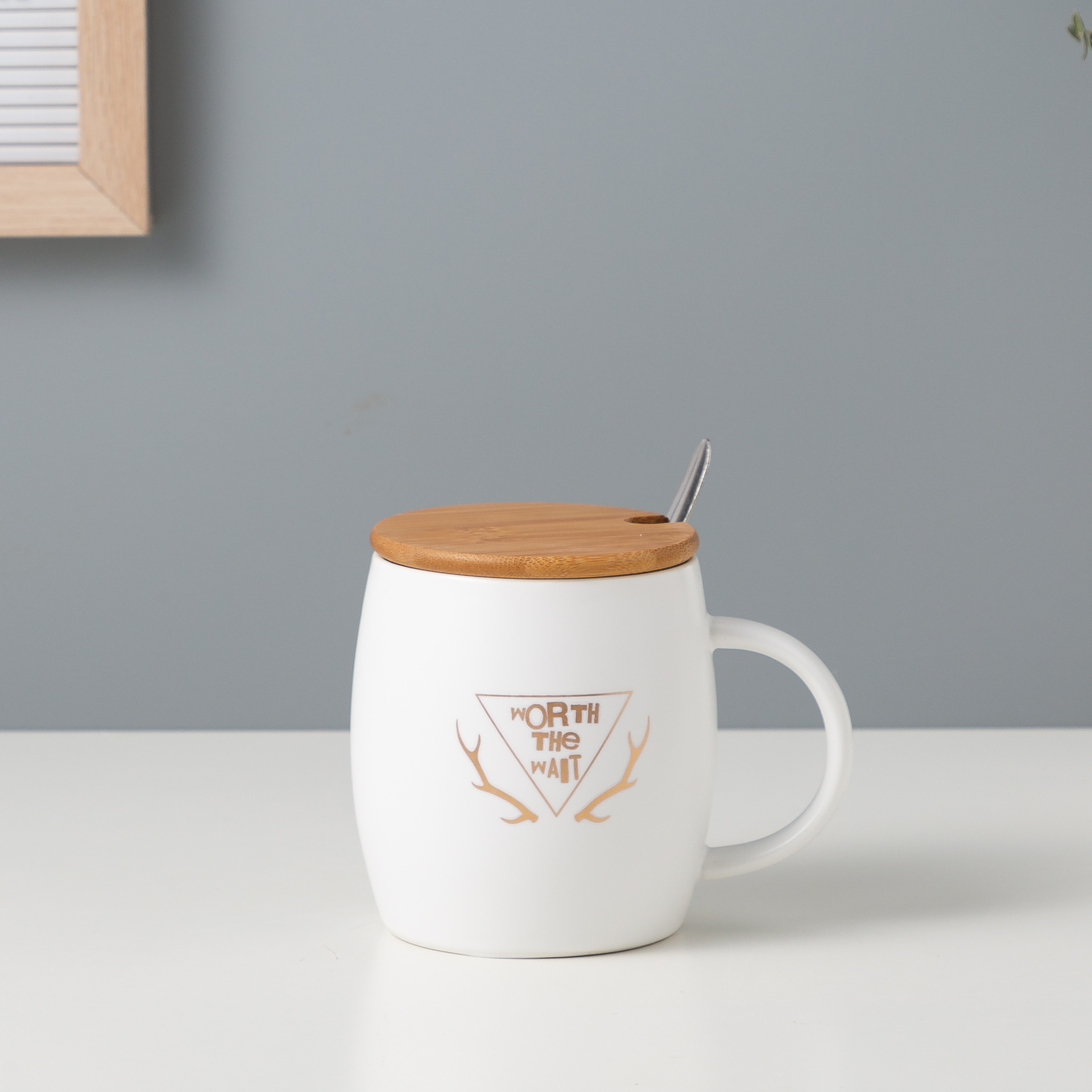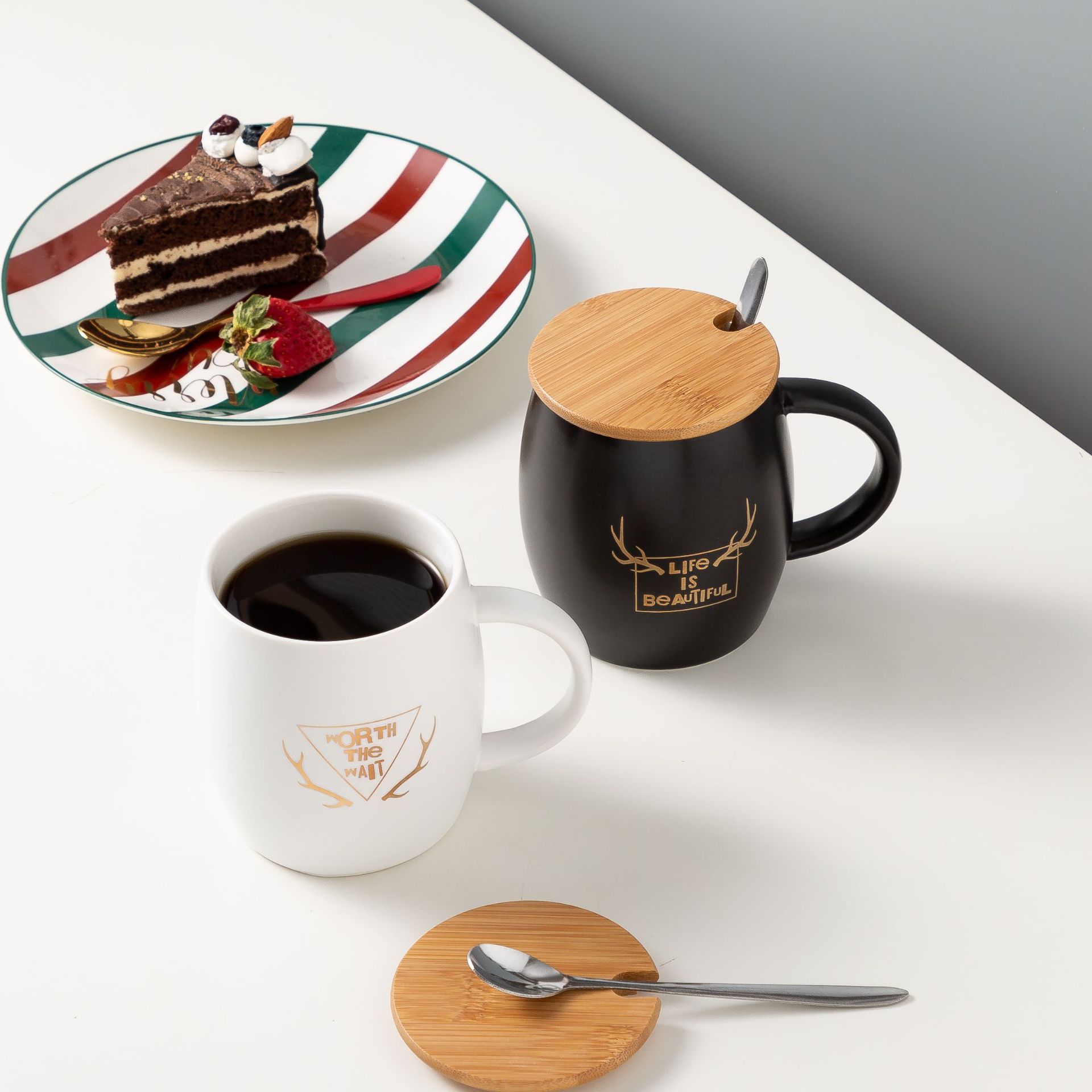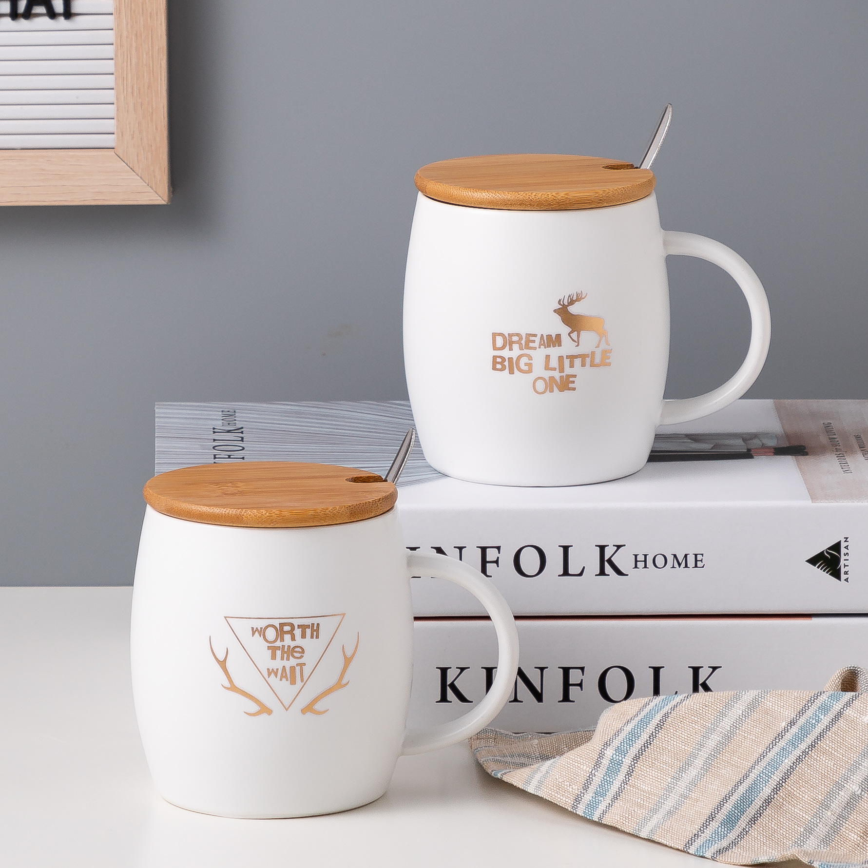 家用高颜值创意简约陶瓷马克水杯带木盖带勺子早餐牛奶杯商务礼品