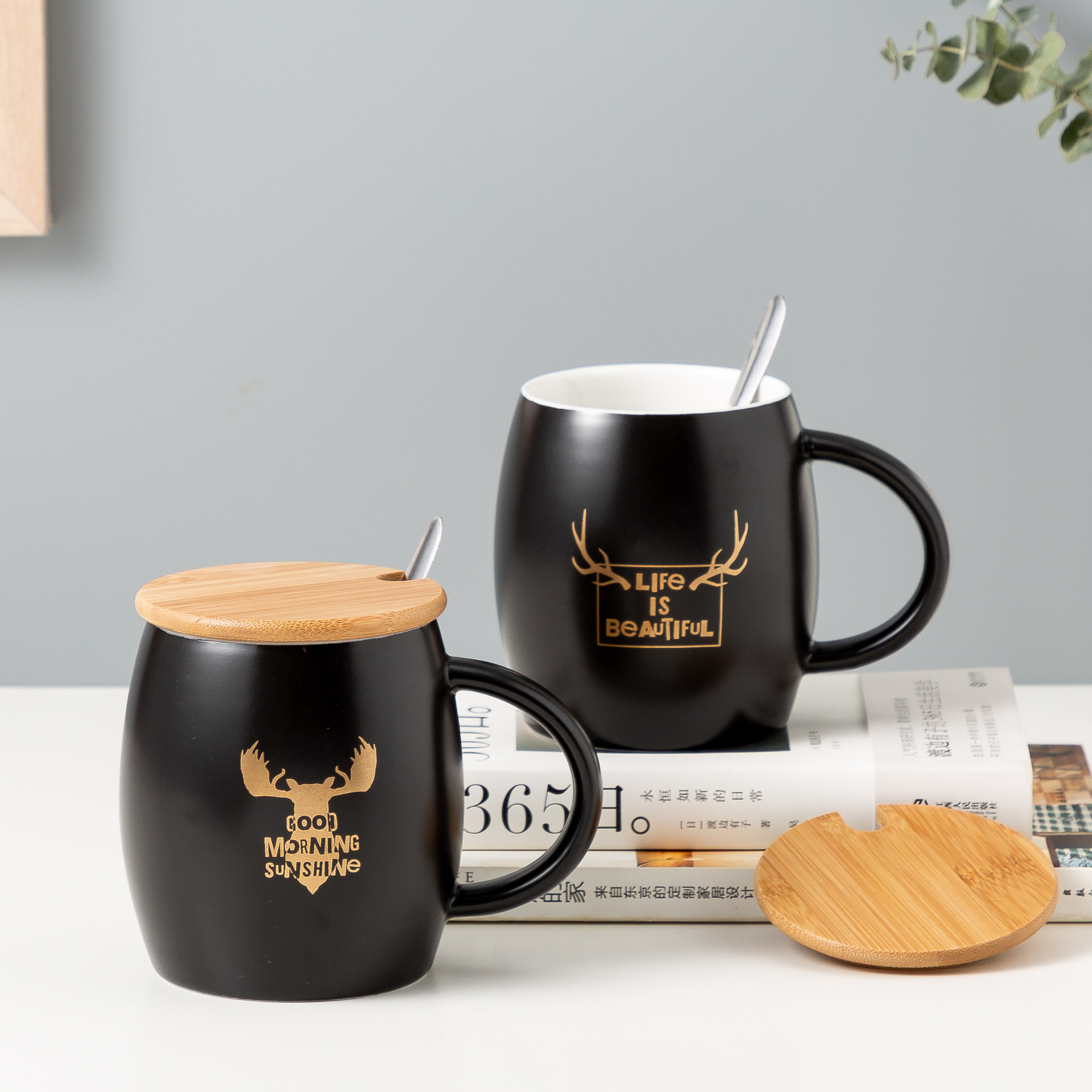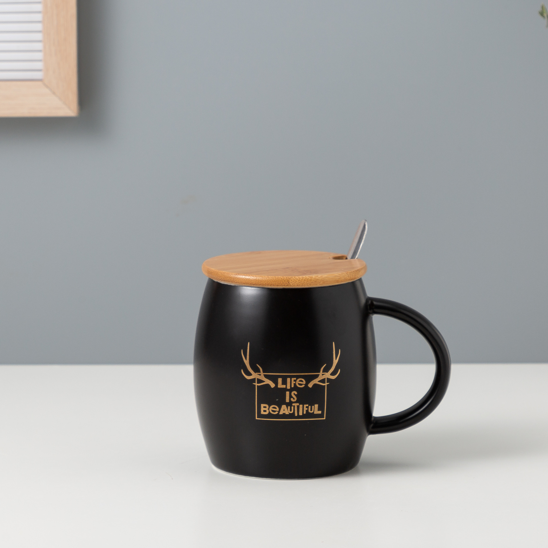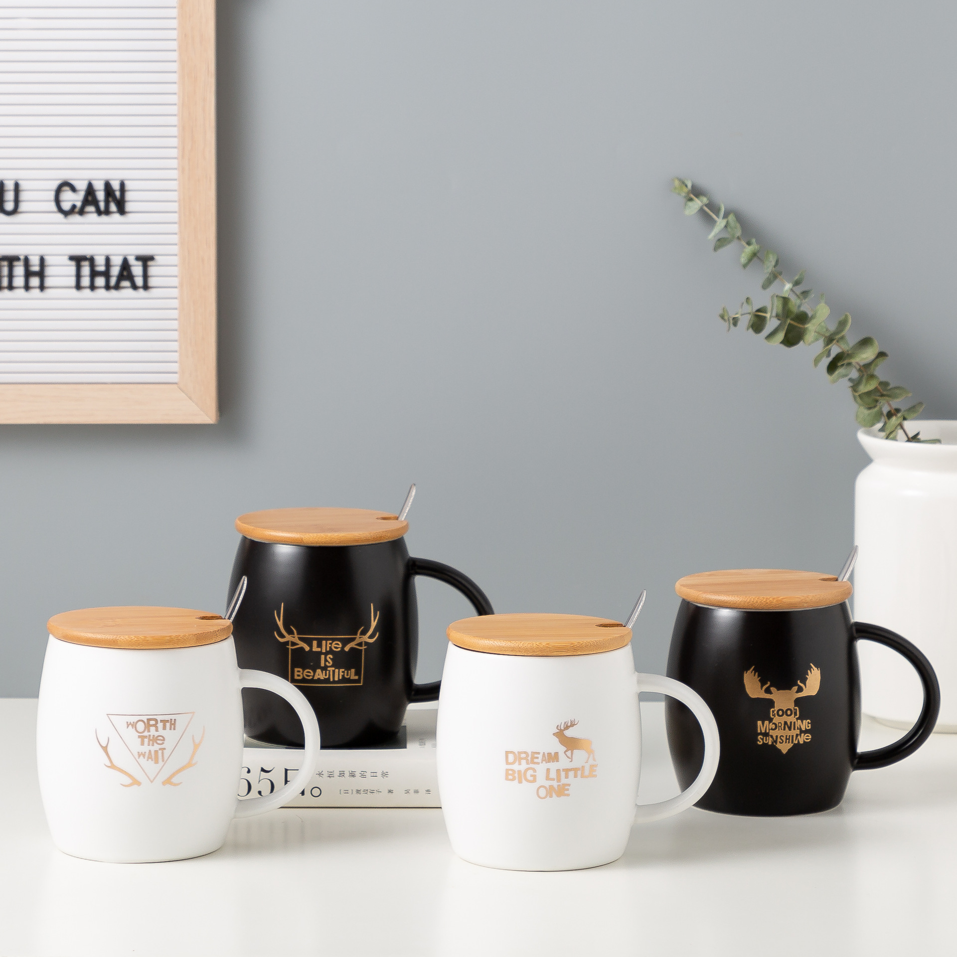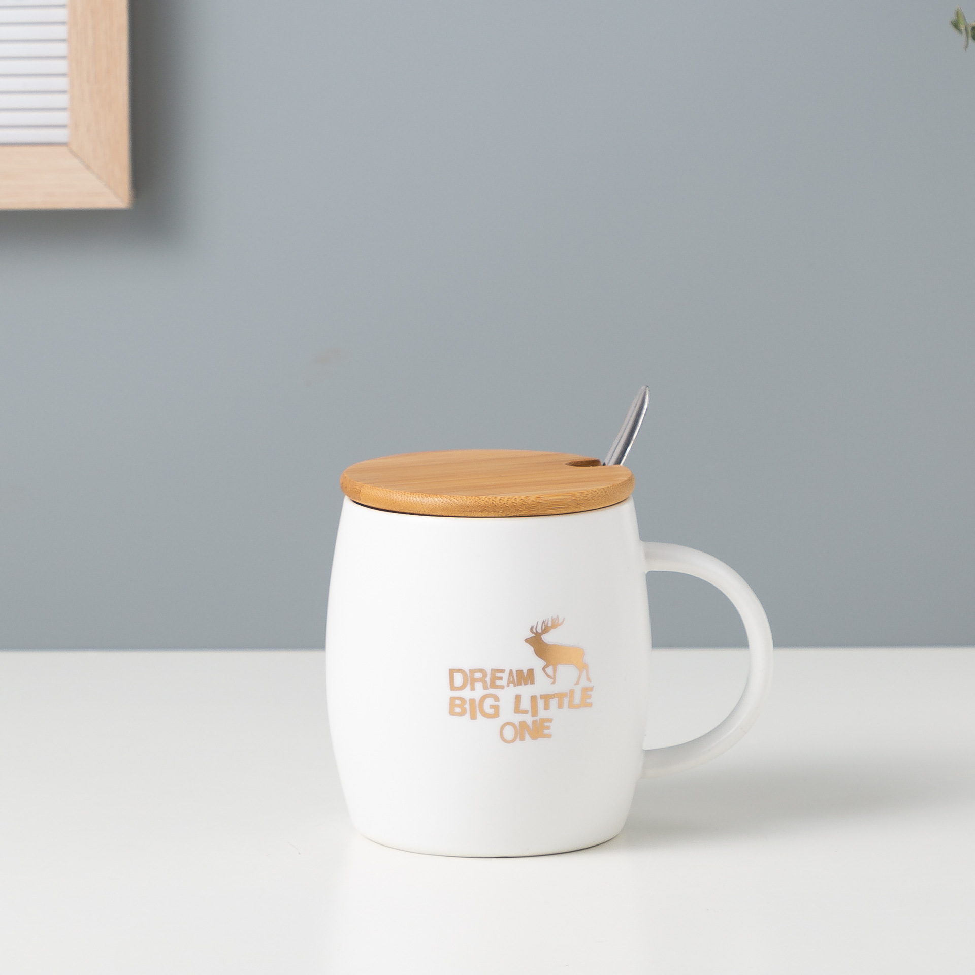 家用高颜值创意简约陶瓷马克水杯带木盖带勺子早餐牛奶杯商务礼品
