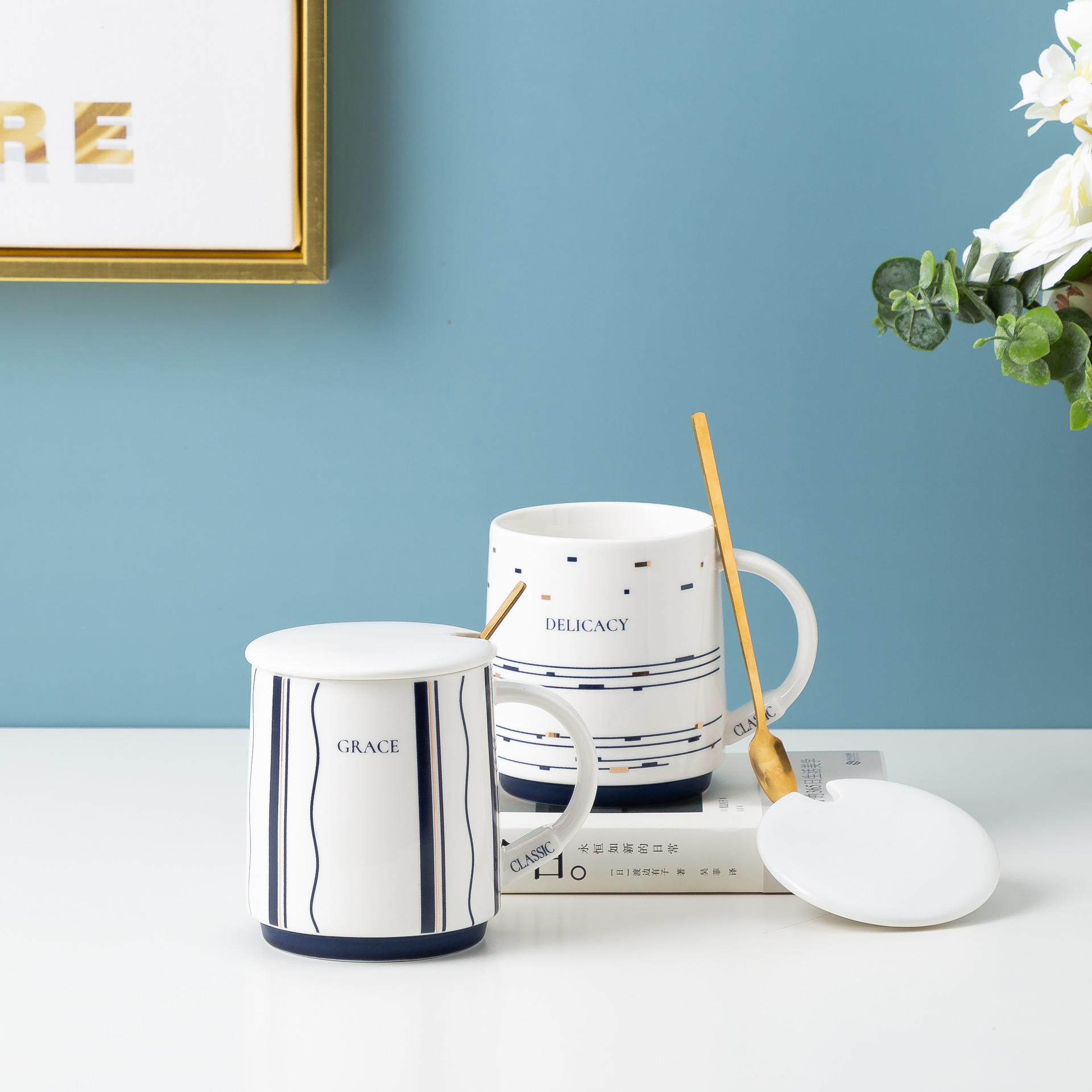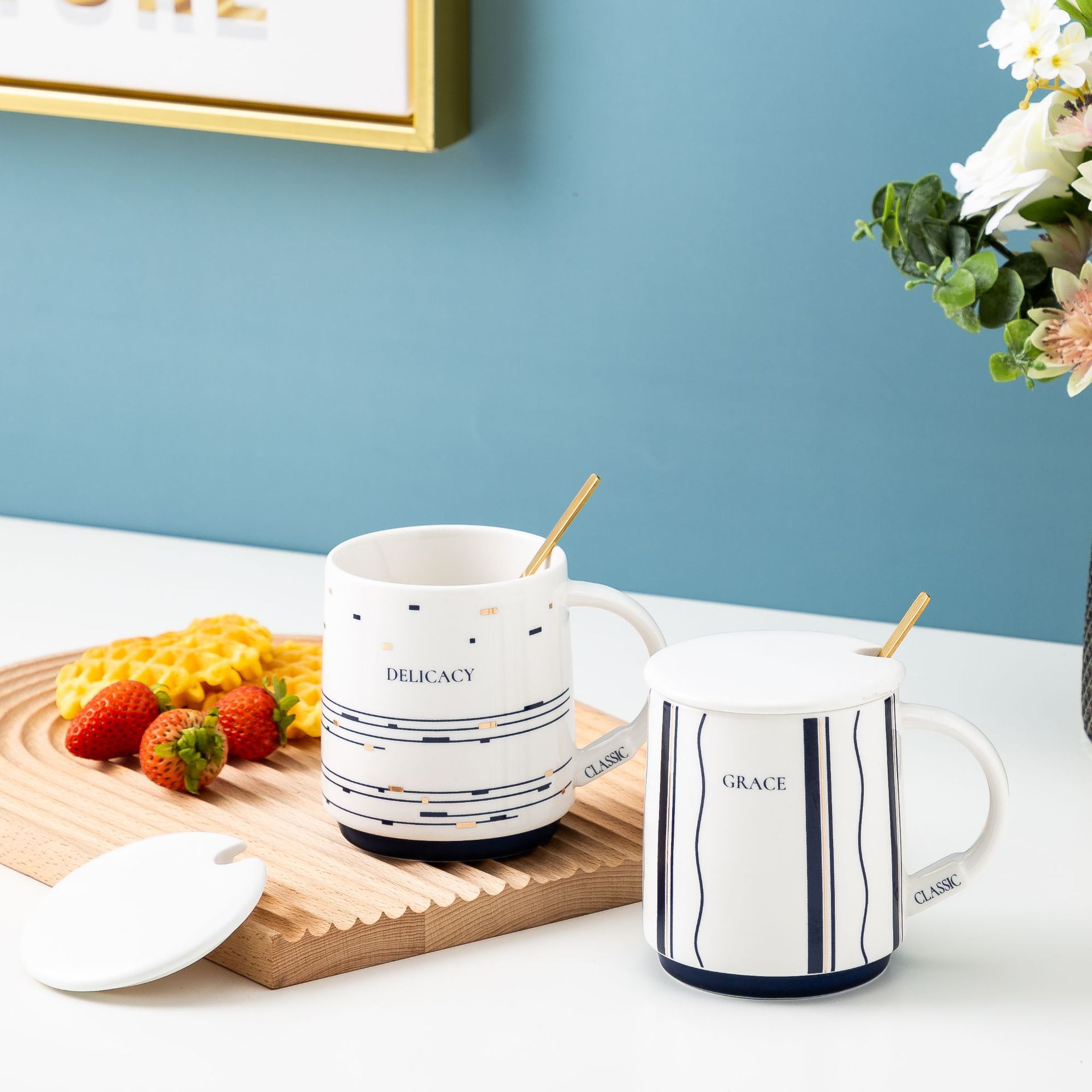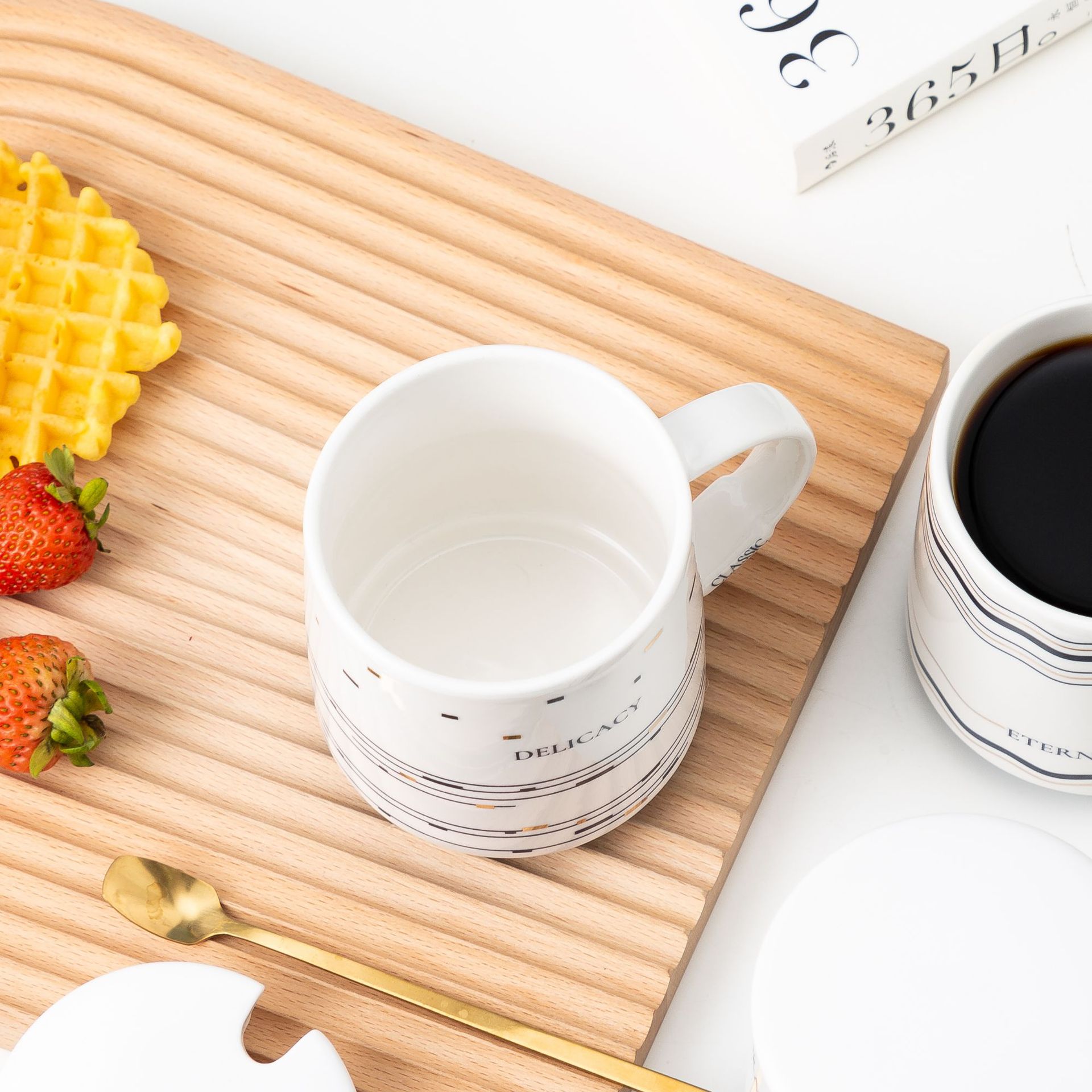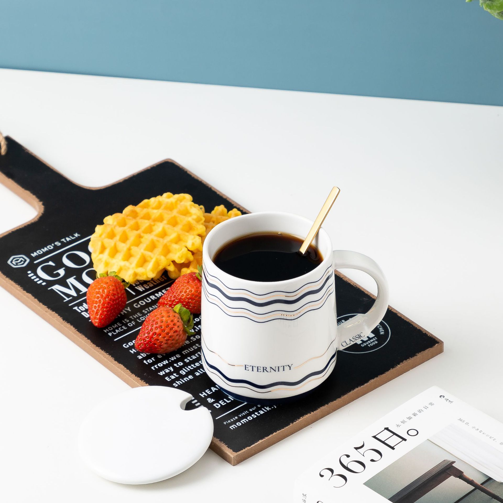 创意高颜值轻奢风线条陶瓷杯带盖勺大容量家用早餐牛奶学生宿舍