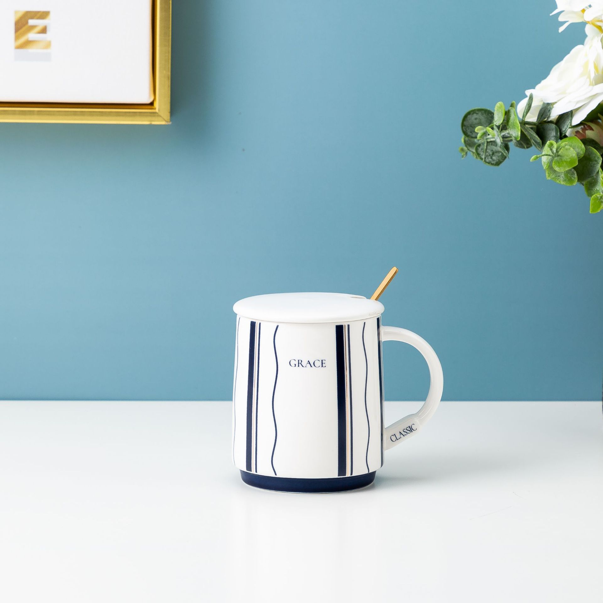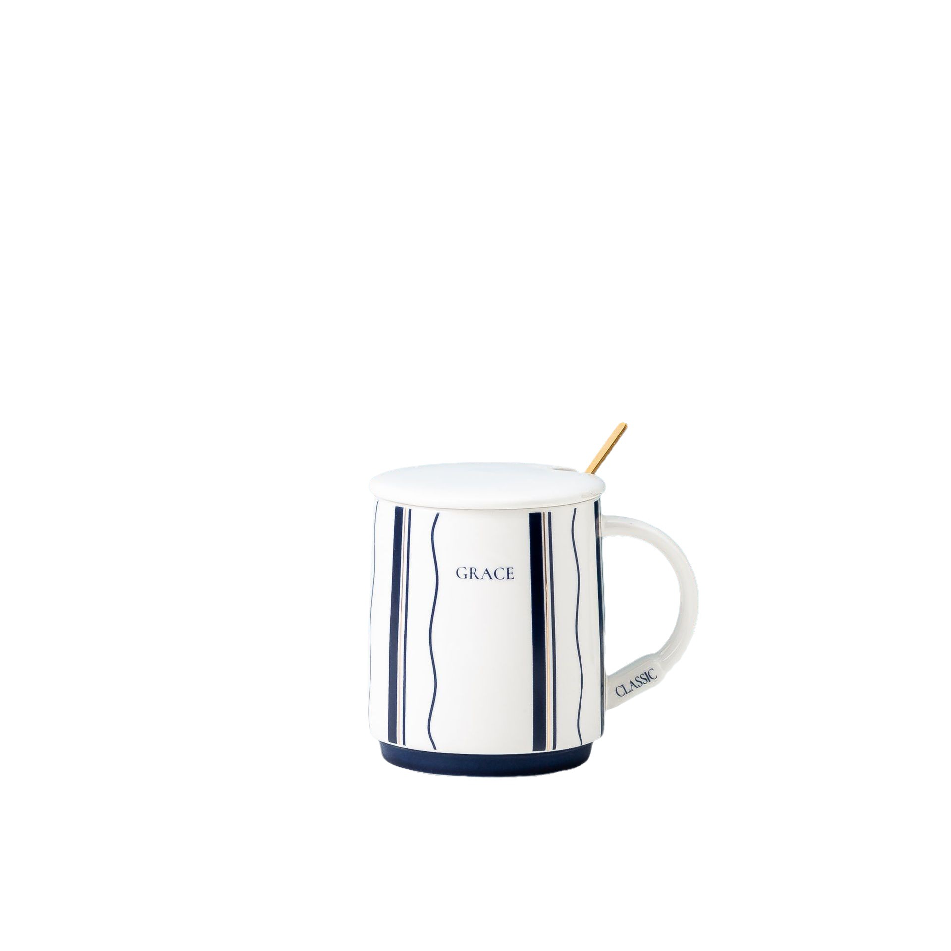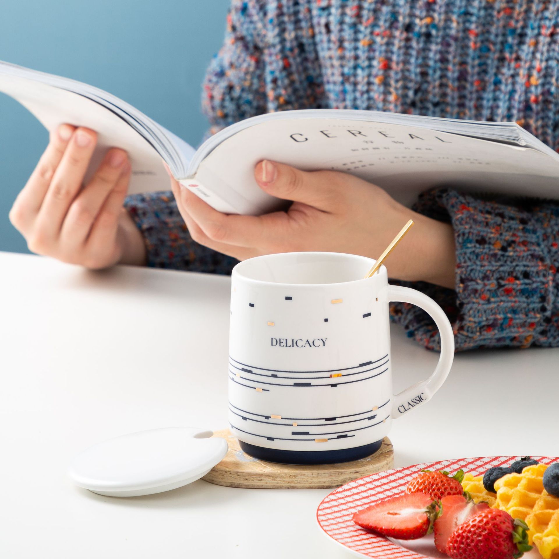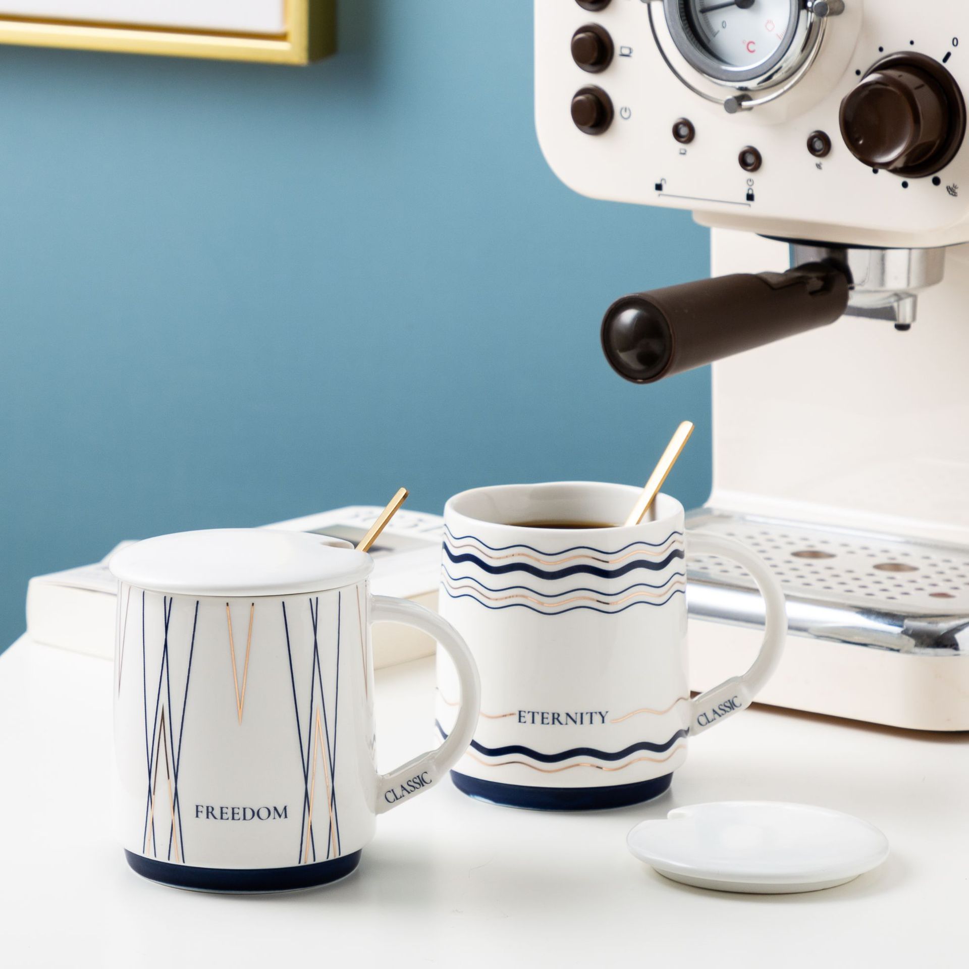 创意高颜值轻奢风线条陶瓷杯带盖勺大容量家用早餐牛奶学生宿舍