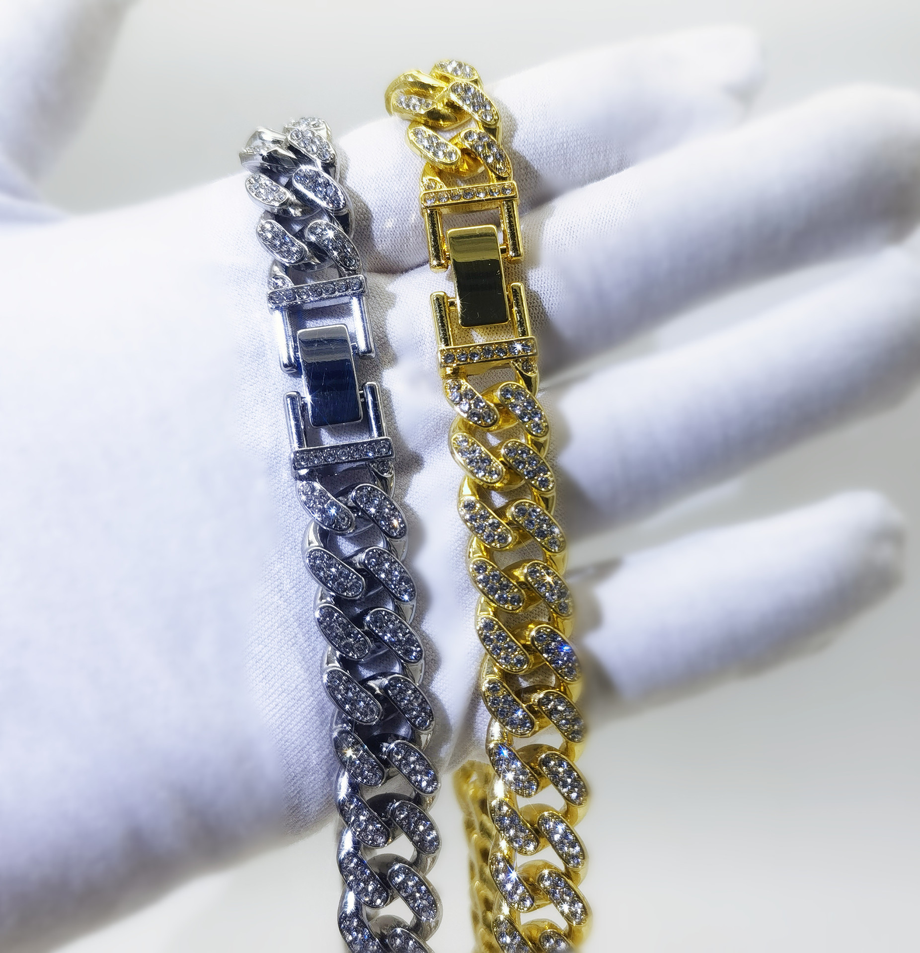 欧美嘻哈潮人13mm平底古巴链镶钻手链男女士hiphop镀金项链跨境