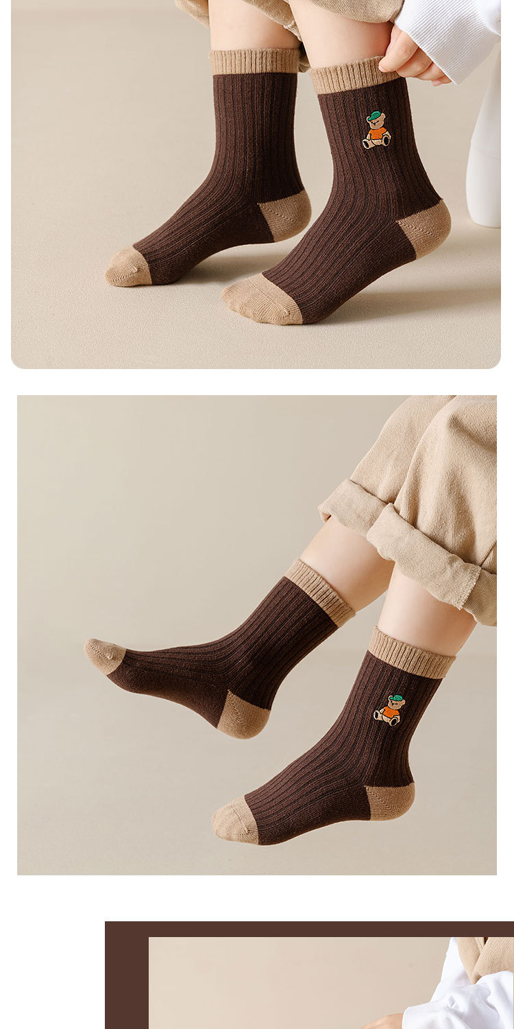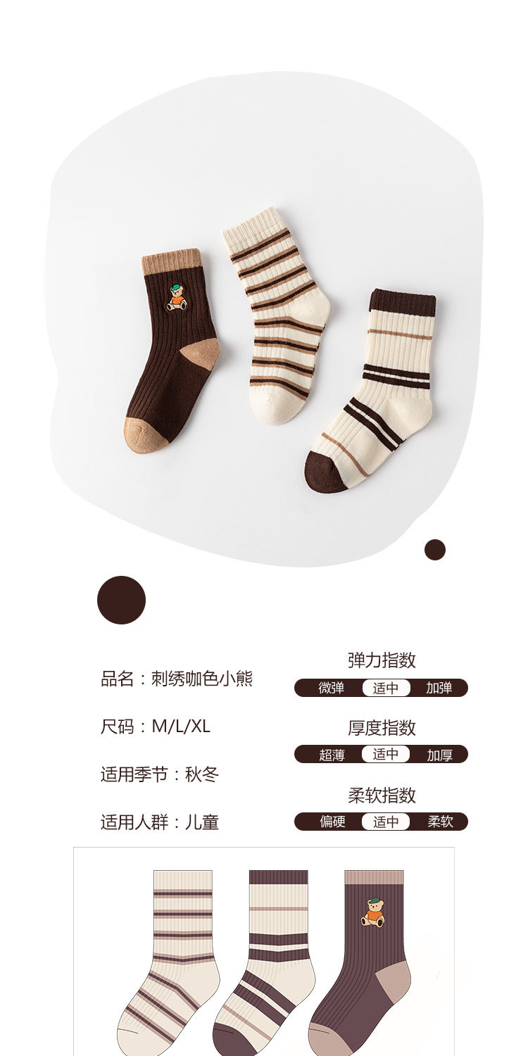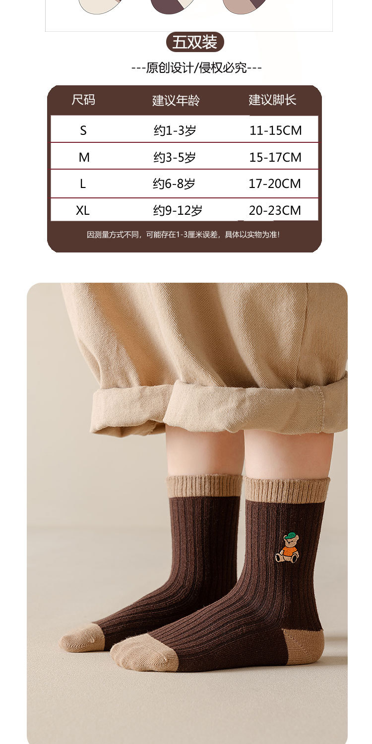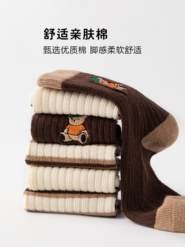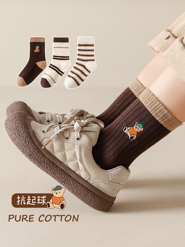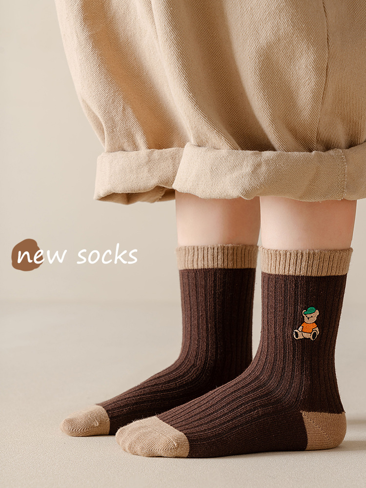 新款儿童袜子秋季中筒袜男女童复古卡通刺绣小熊宝宝袜秋季棉袜