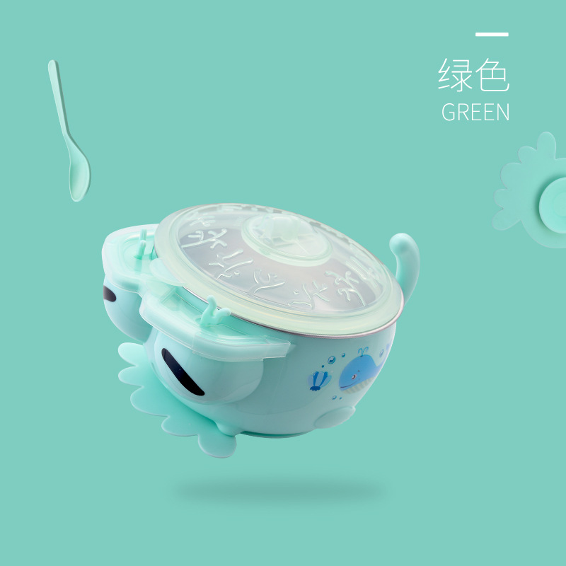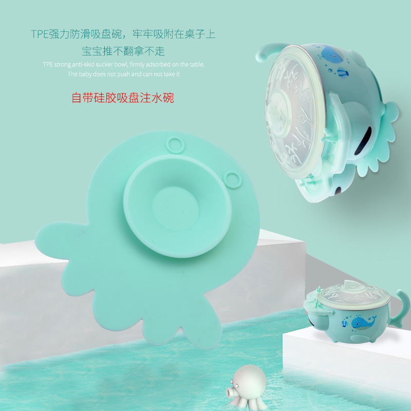七彩童年带吸盘316不锈钢防摔碗萌趣小鱼可注水保温碗儿童辅食碗