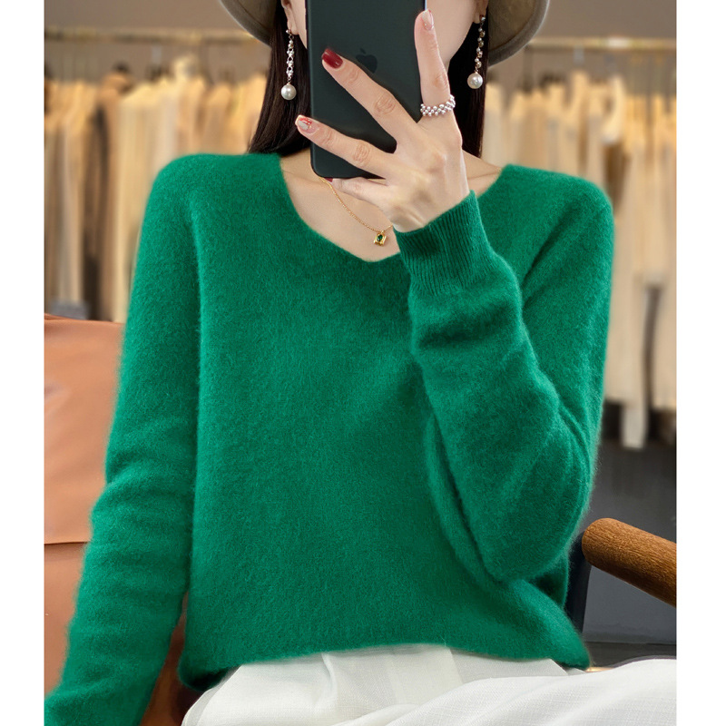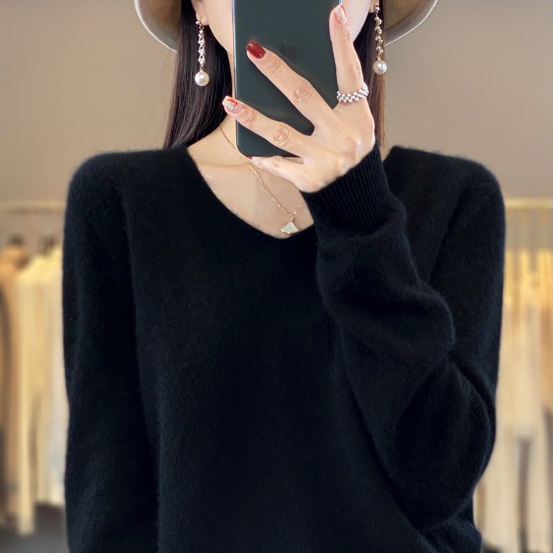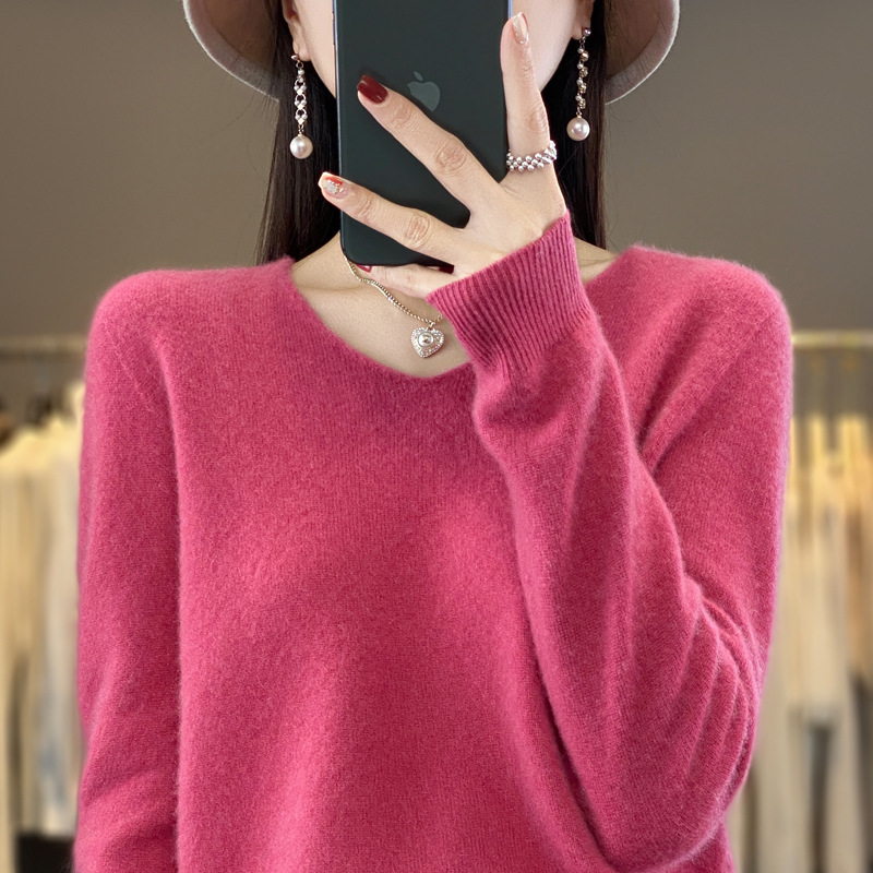 一线成衣100纯羊毛针织衫女V领套头宽松打底衫秋冬季新款纯色毛衣