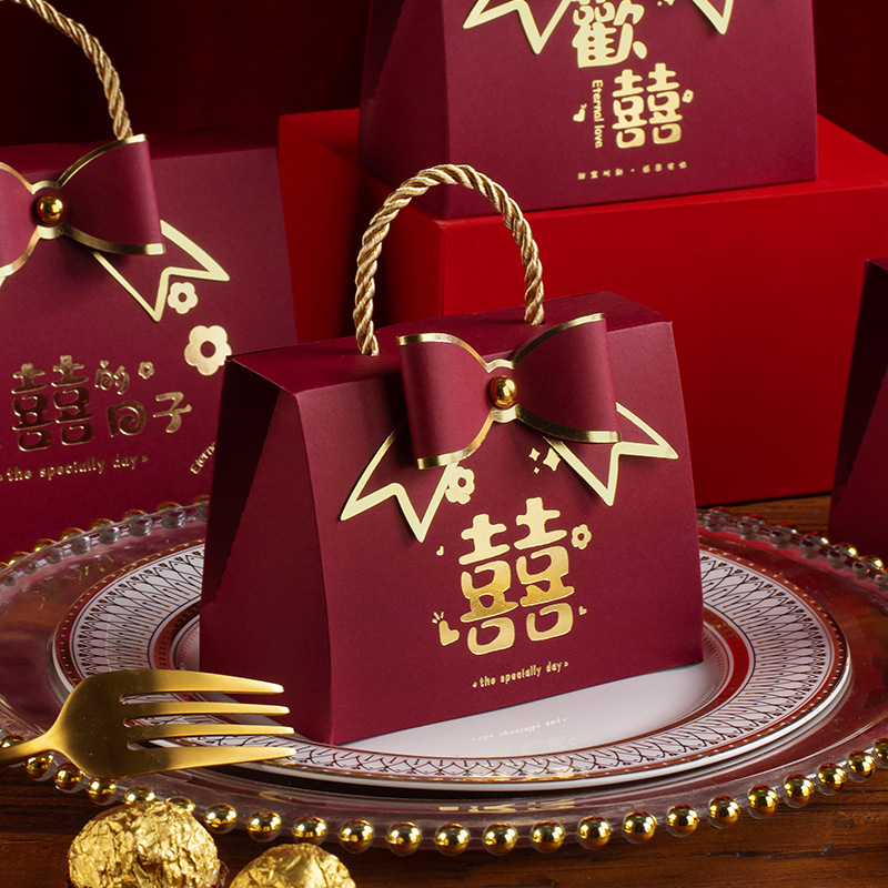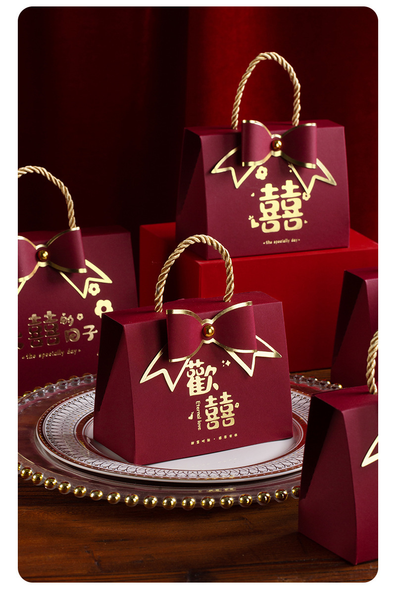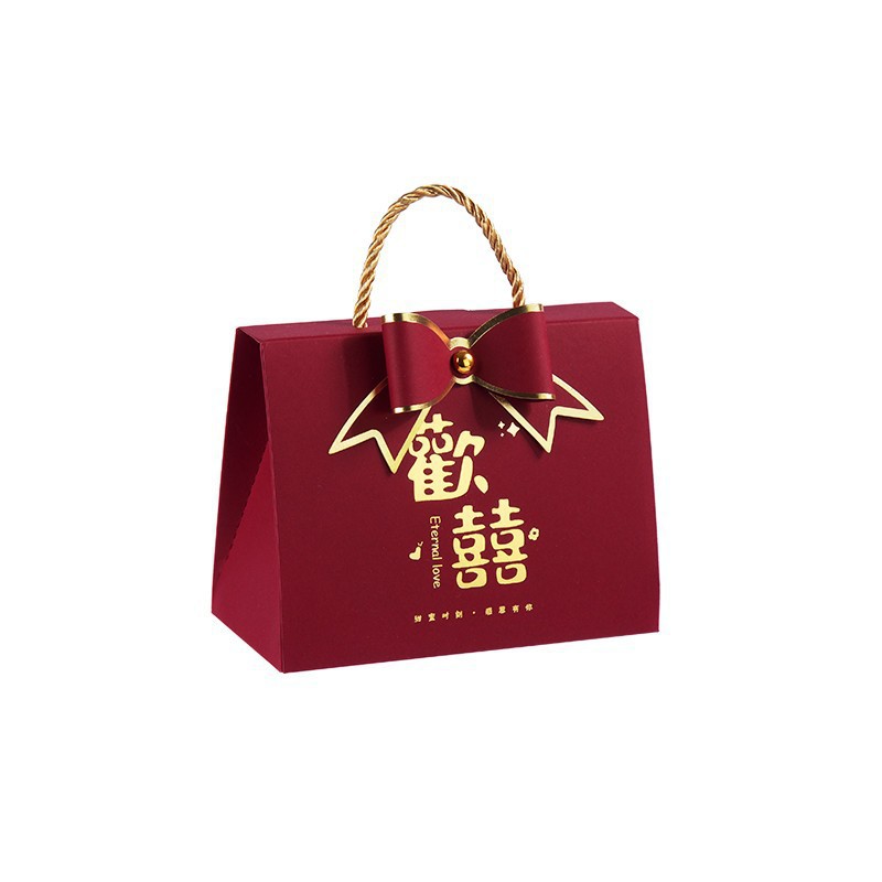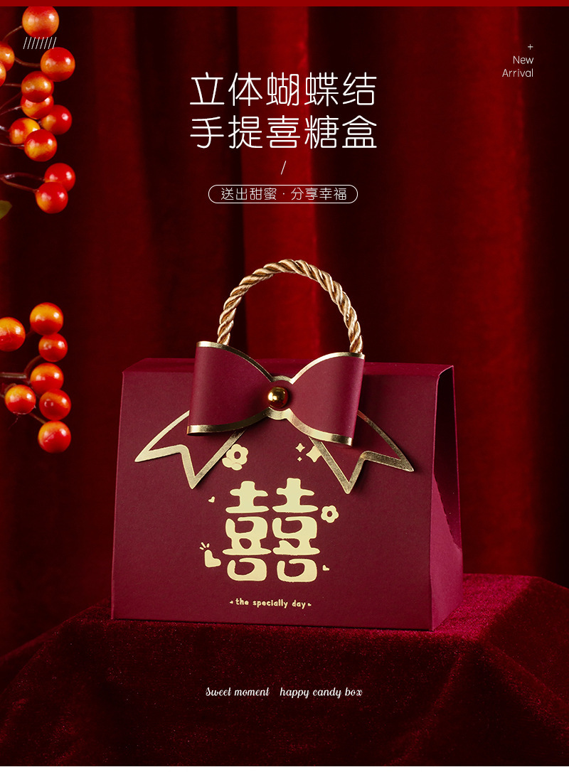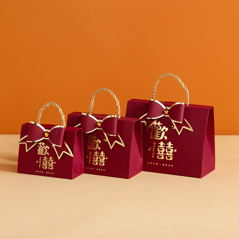 喜庆用品批发新款结婚手提喜糖盒蝴蝶结中式伴手礼礼盒加厚红卡
