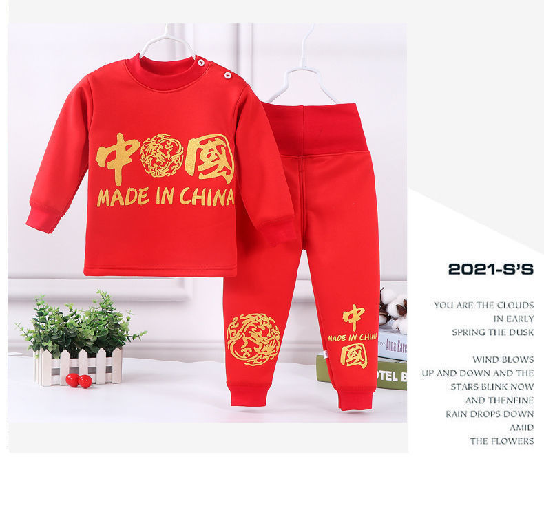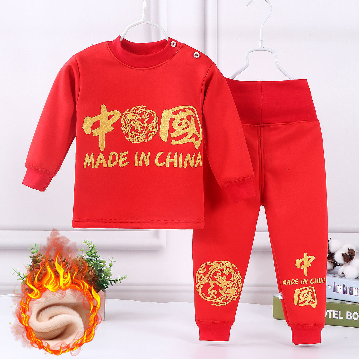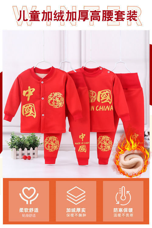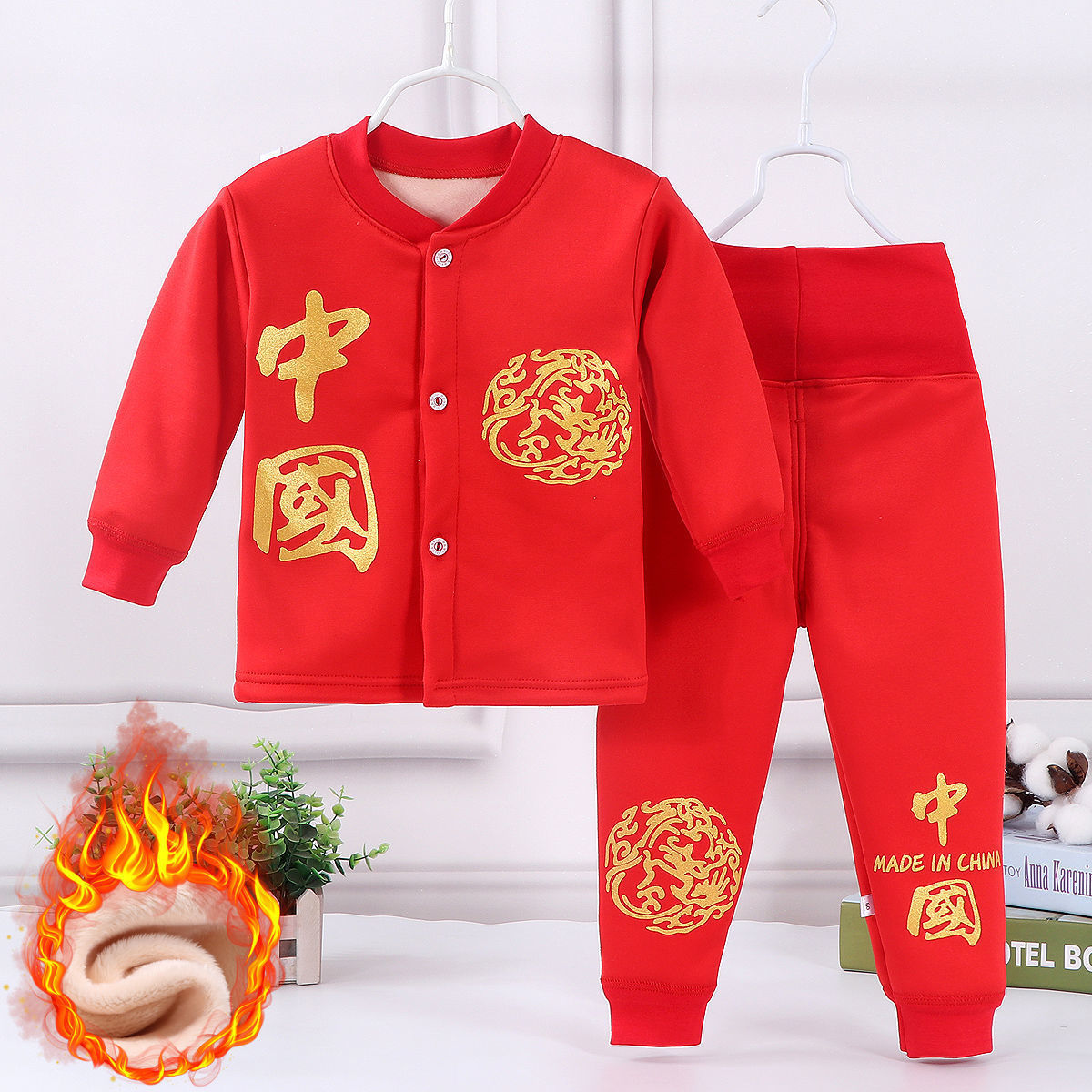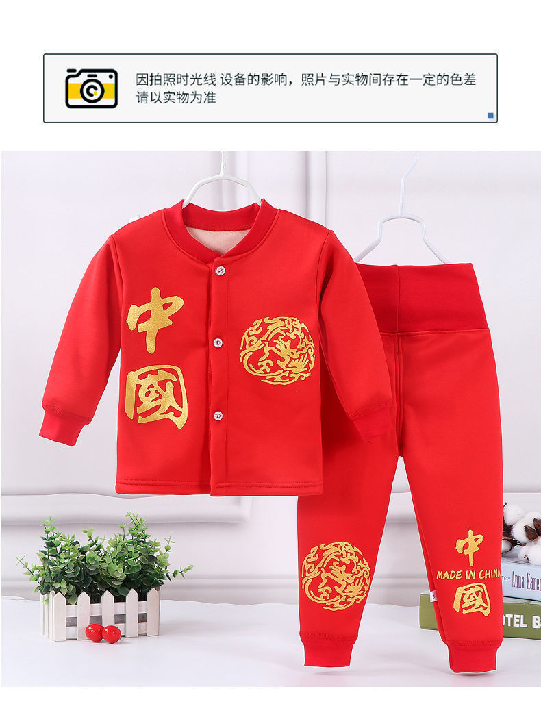 大红喜庆开衫套装可开裆婴幼儿童拜年服保暖套装加绒加厚内衣现货
