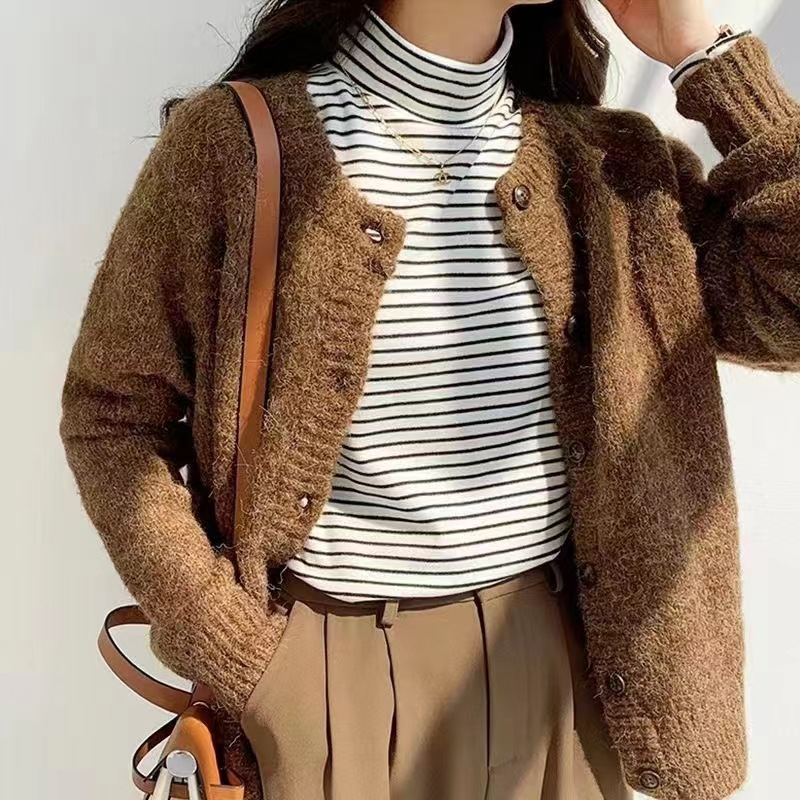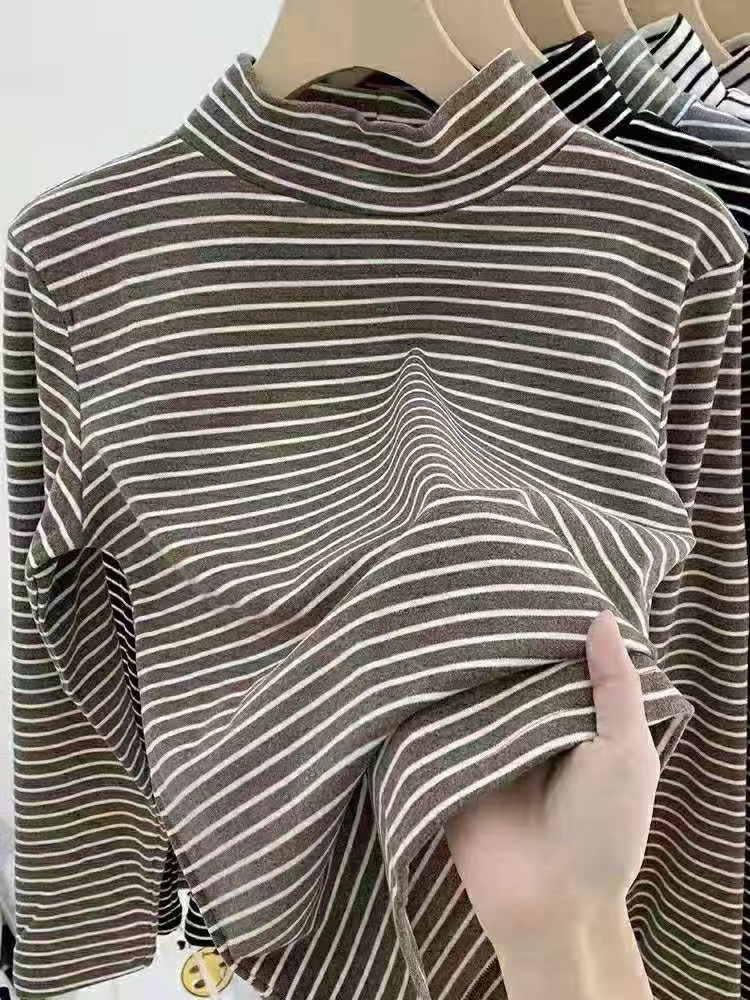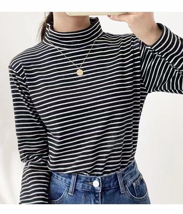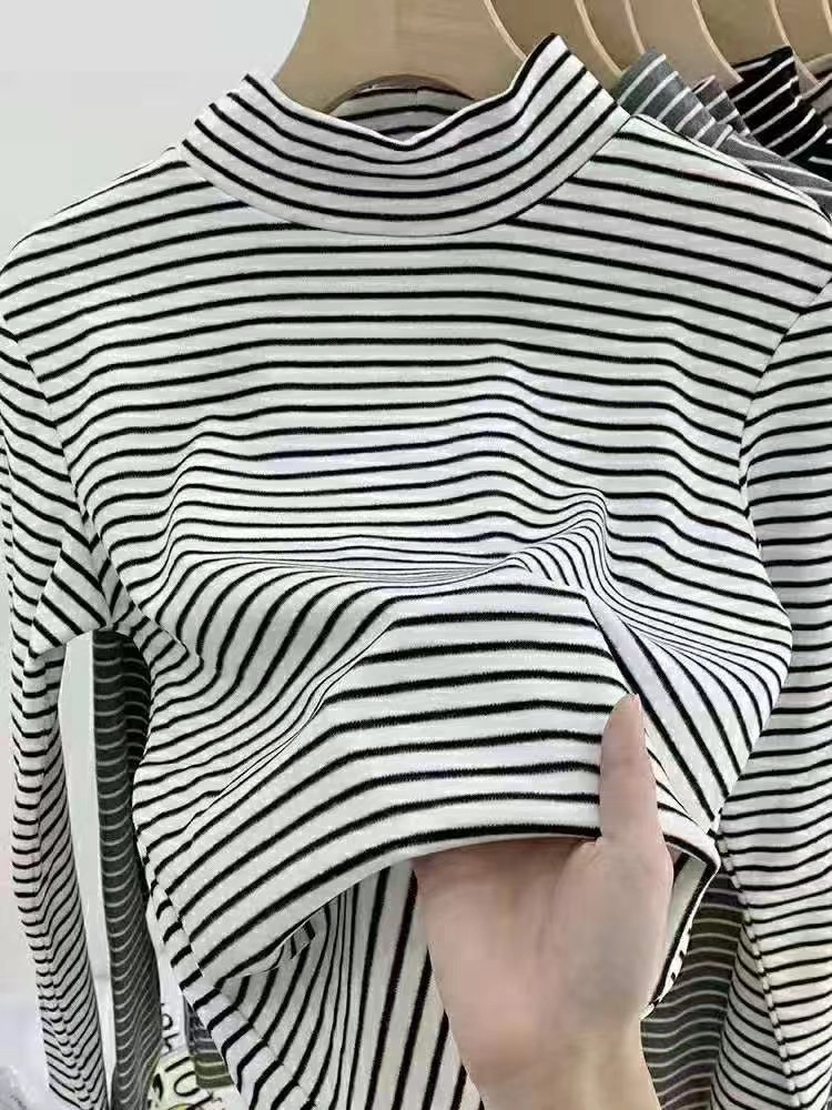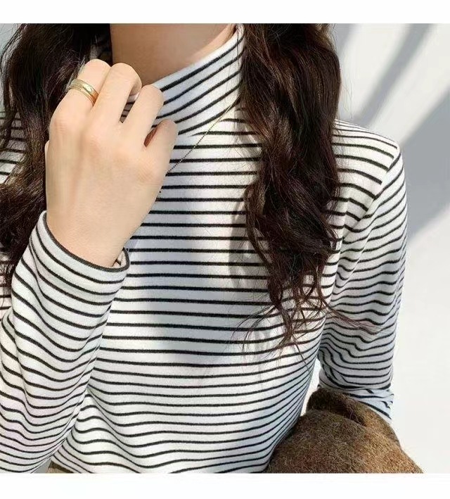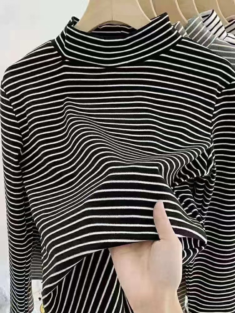 秋冬加厚条纹德绒女士打底衫套头长袖中领女上衣保暖修身外穿T恤