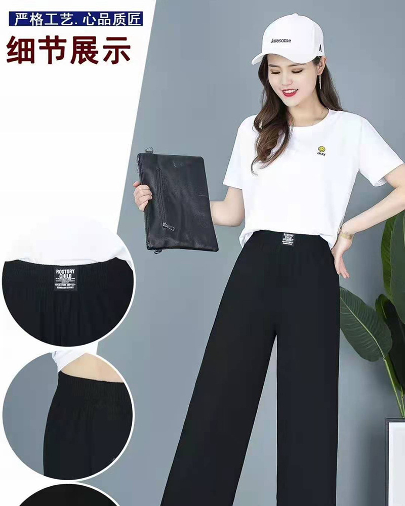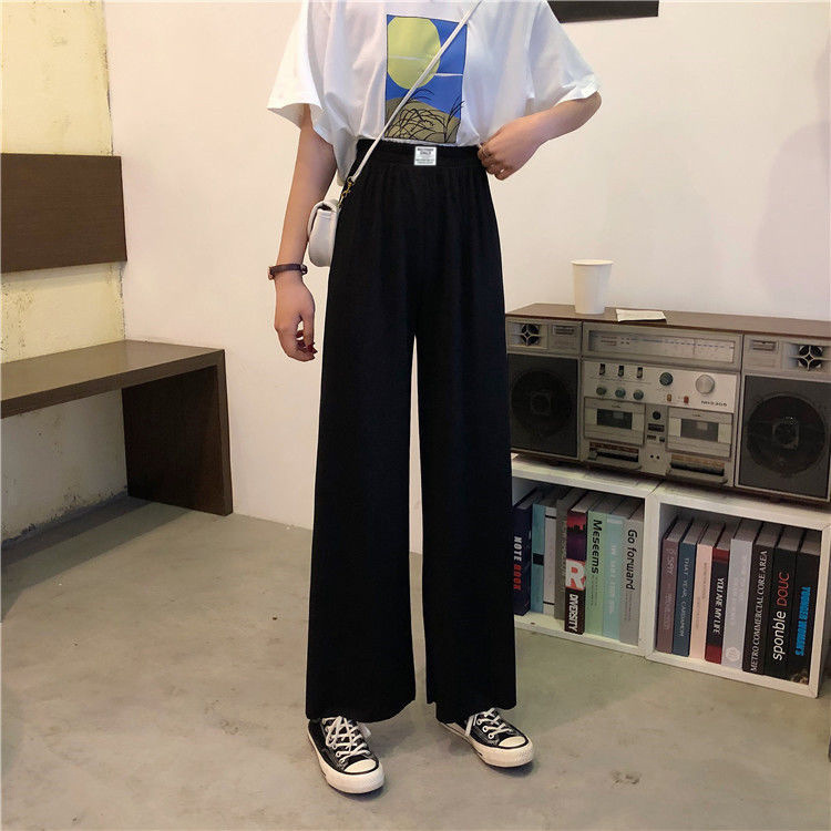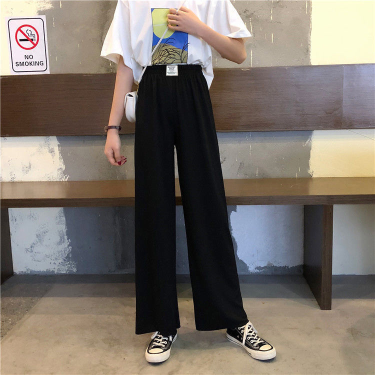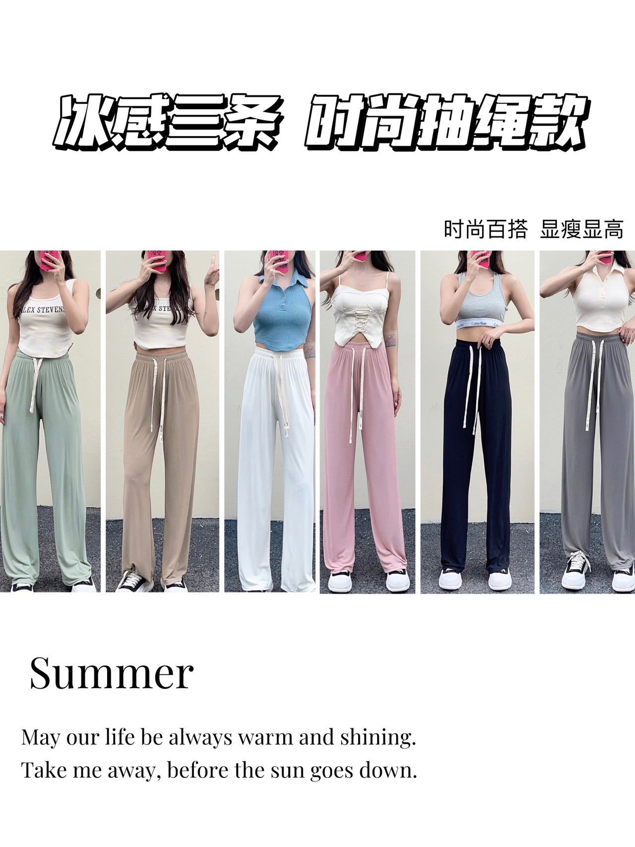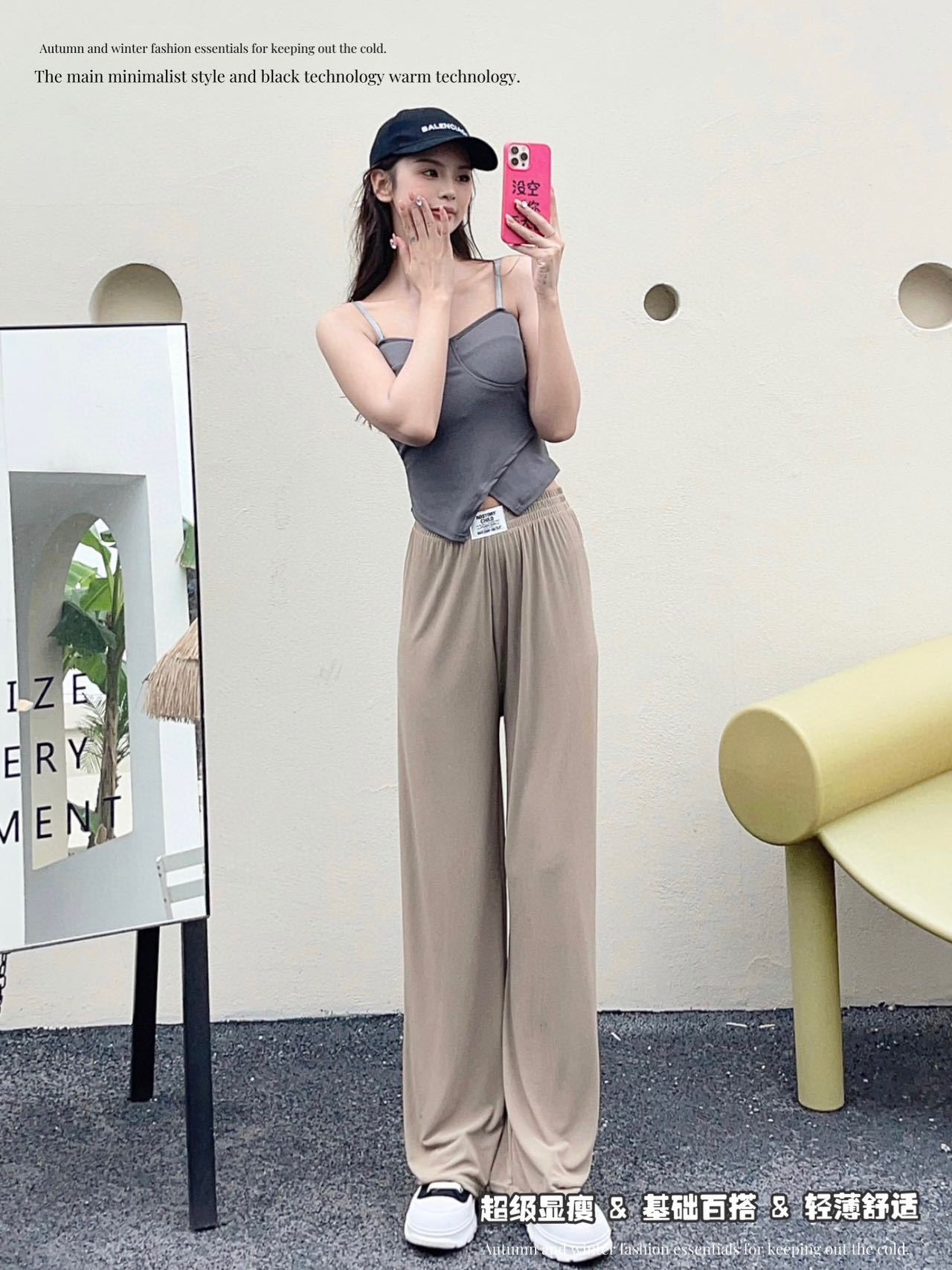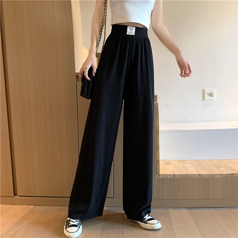 新款冰丝布标阔腿裤休闲女裤韩版宽松高腰夏季直筒纯色长裤子2023