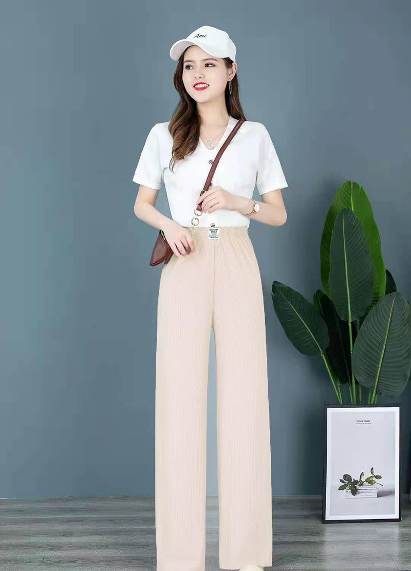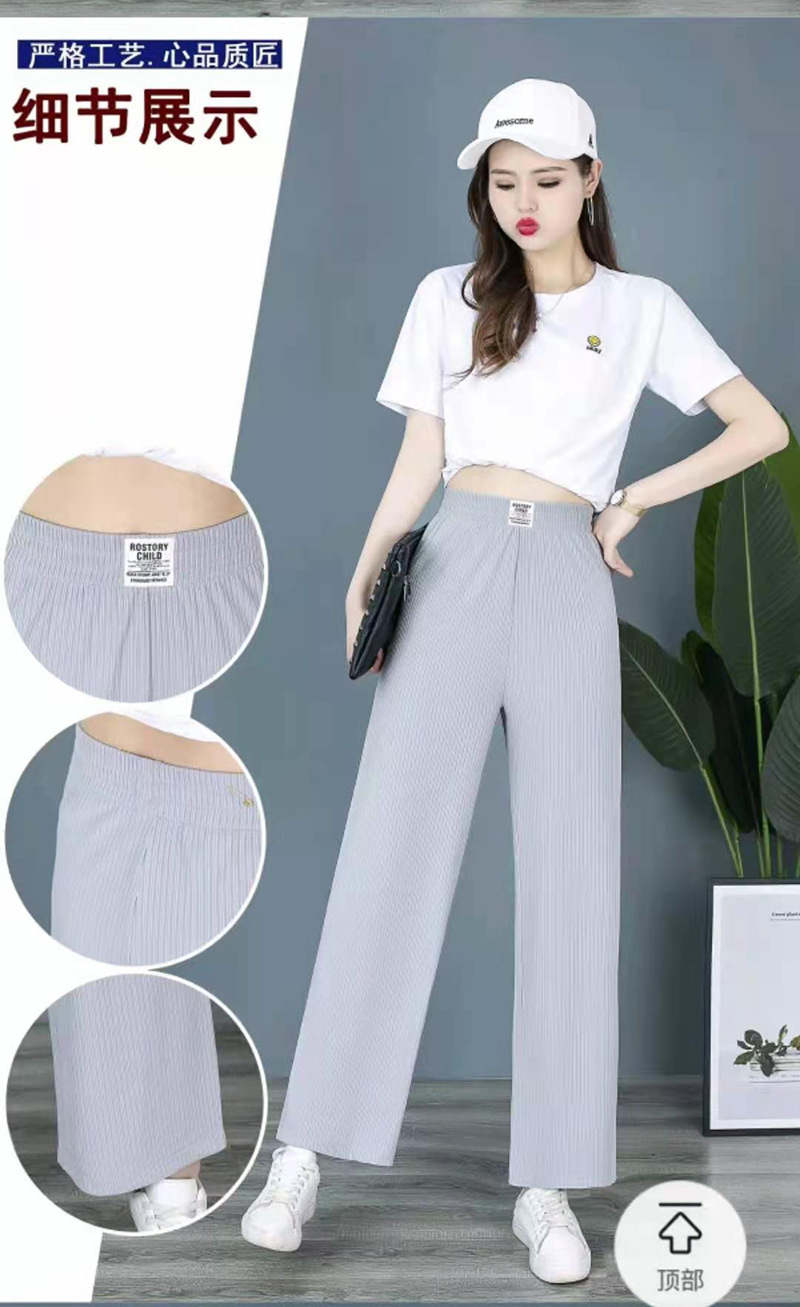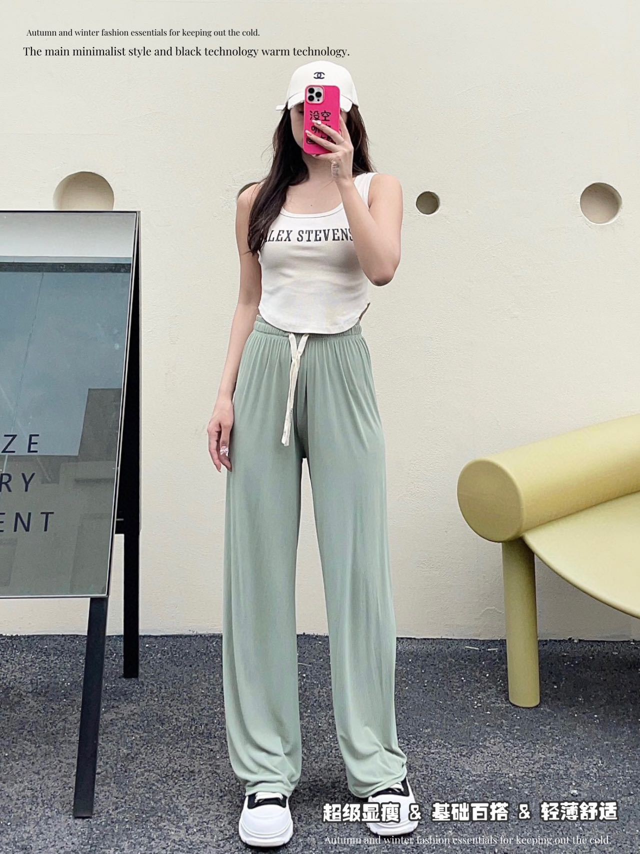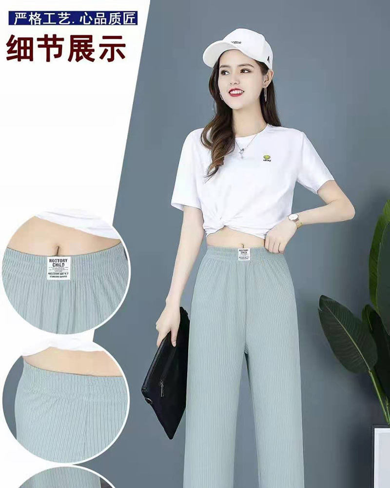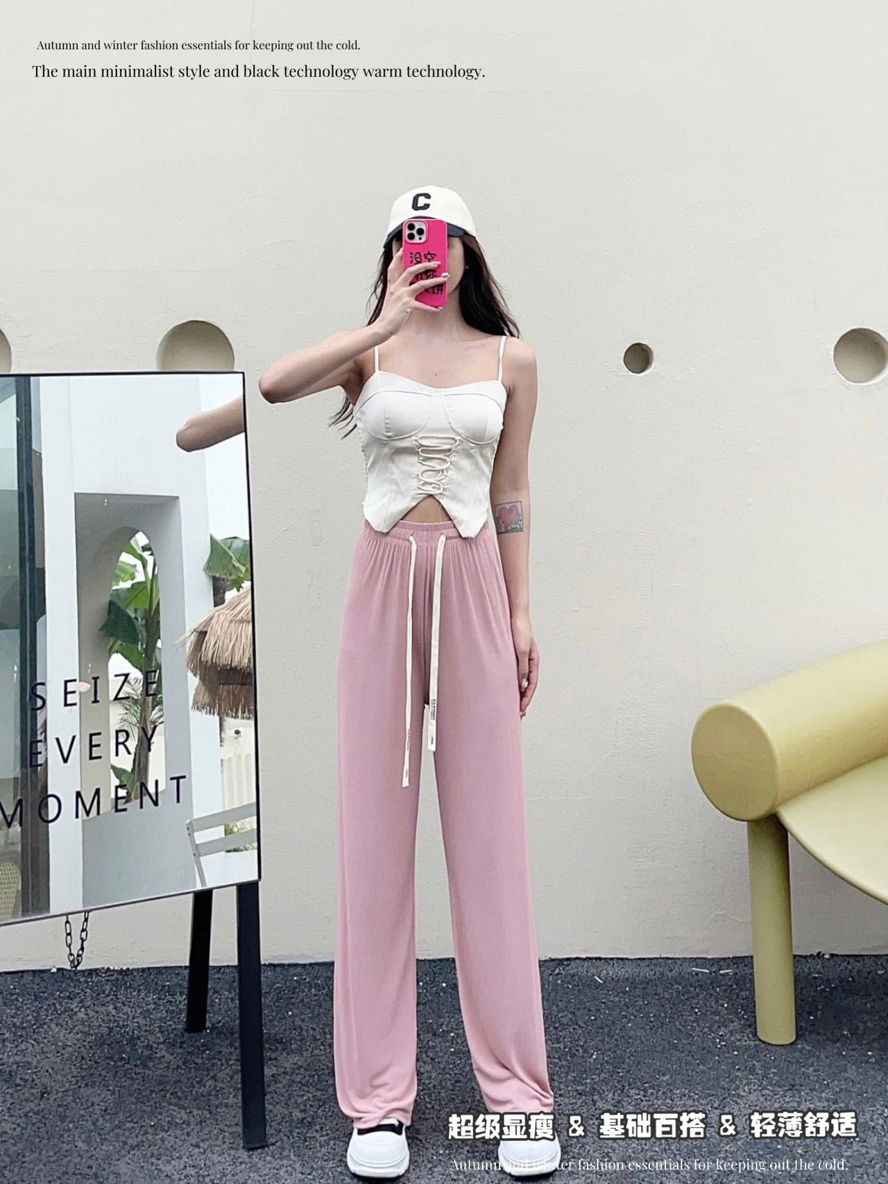 新款冰丝布标阔腿裤休闲女裤韩版宽松高腰夏季直筒纯色长裤子2023