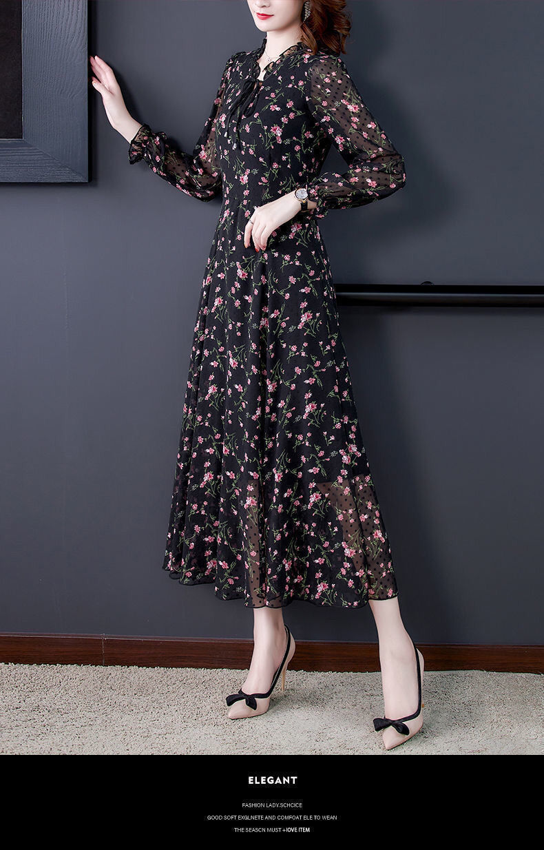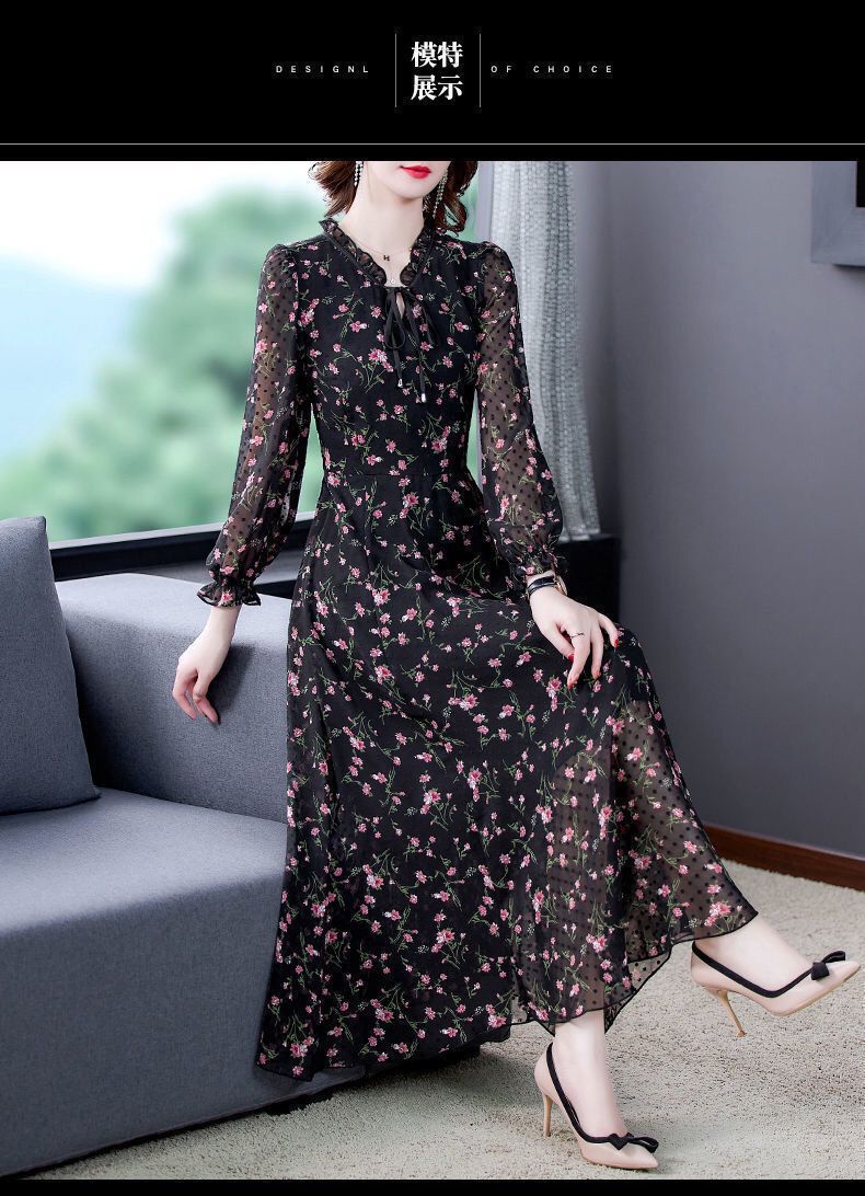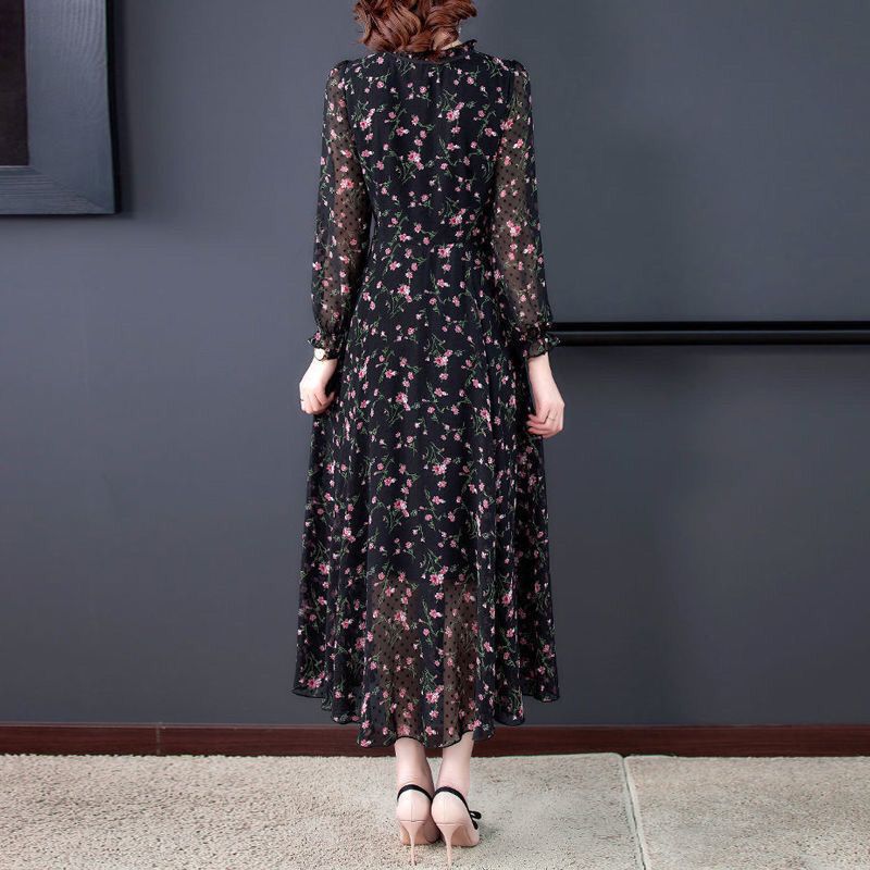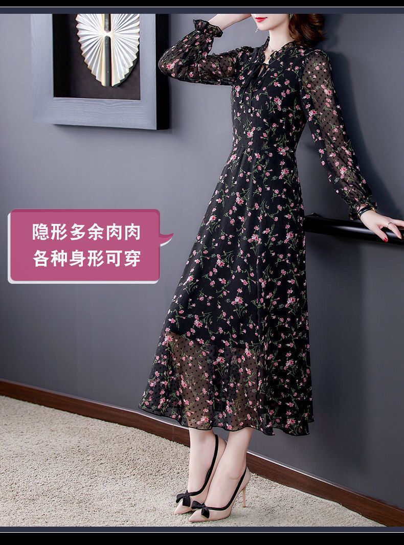 新款春秋长袖雪纺印花连衣裙中长款大码遮肚显瘦妈妈装洋气法式裙