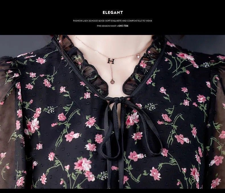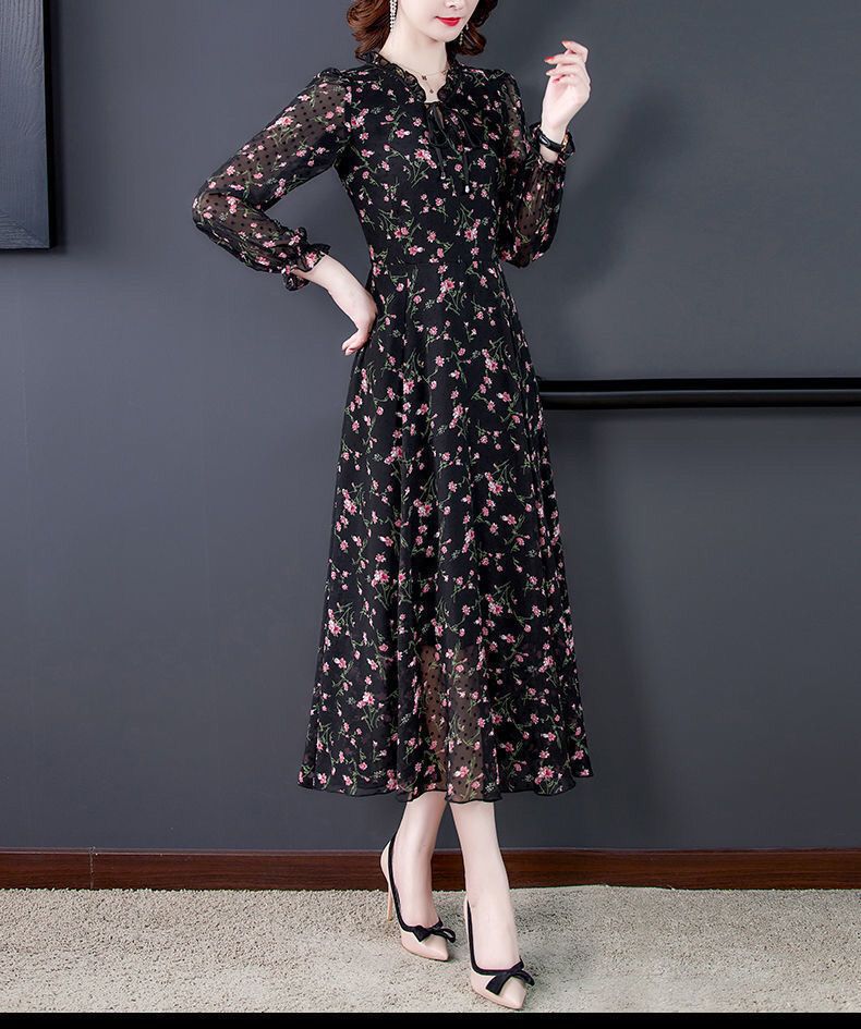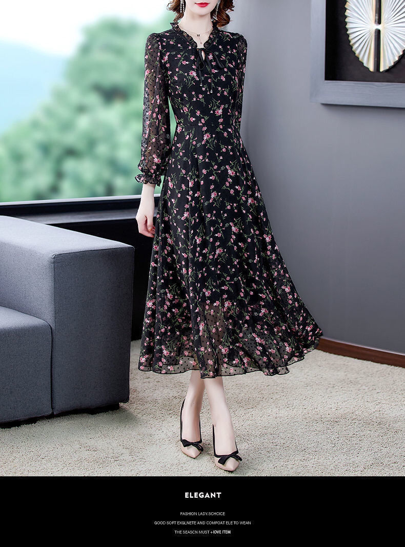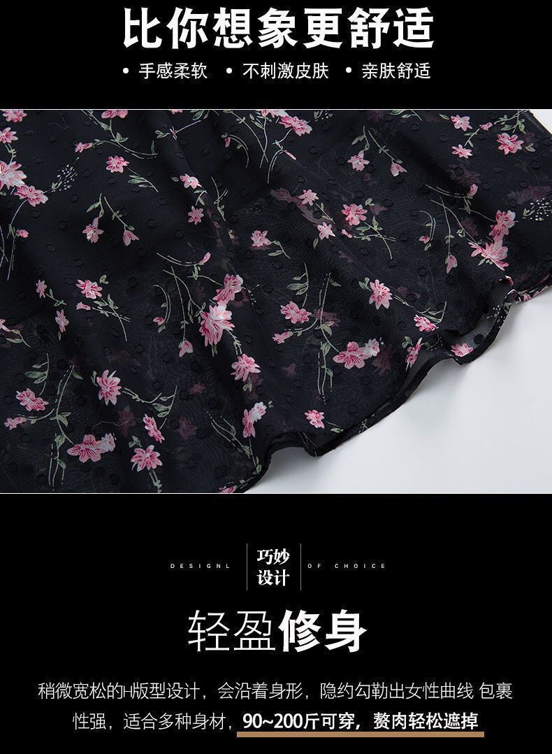 新款春秋长袖雪纺印花连衣裙中长款大码遮肚显瘦妈妈装洋气法式裙