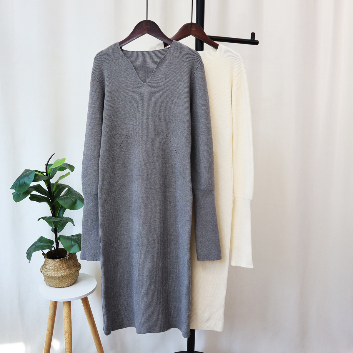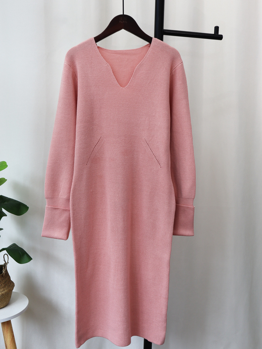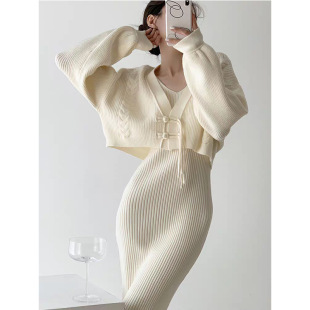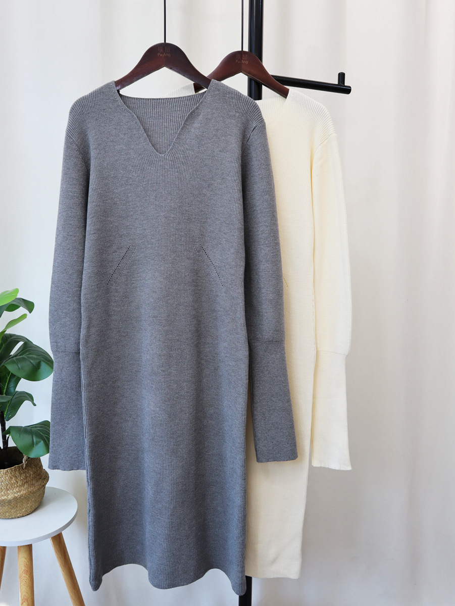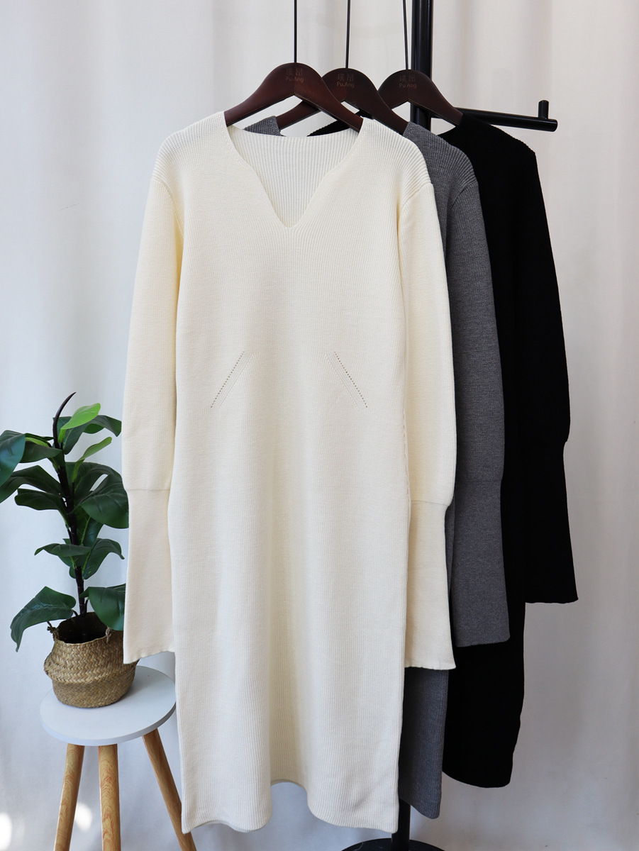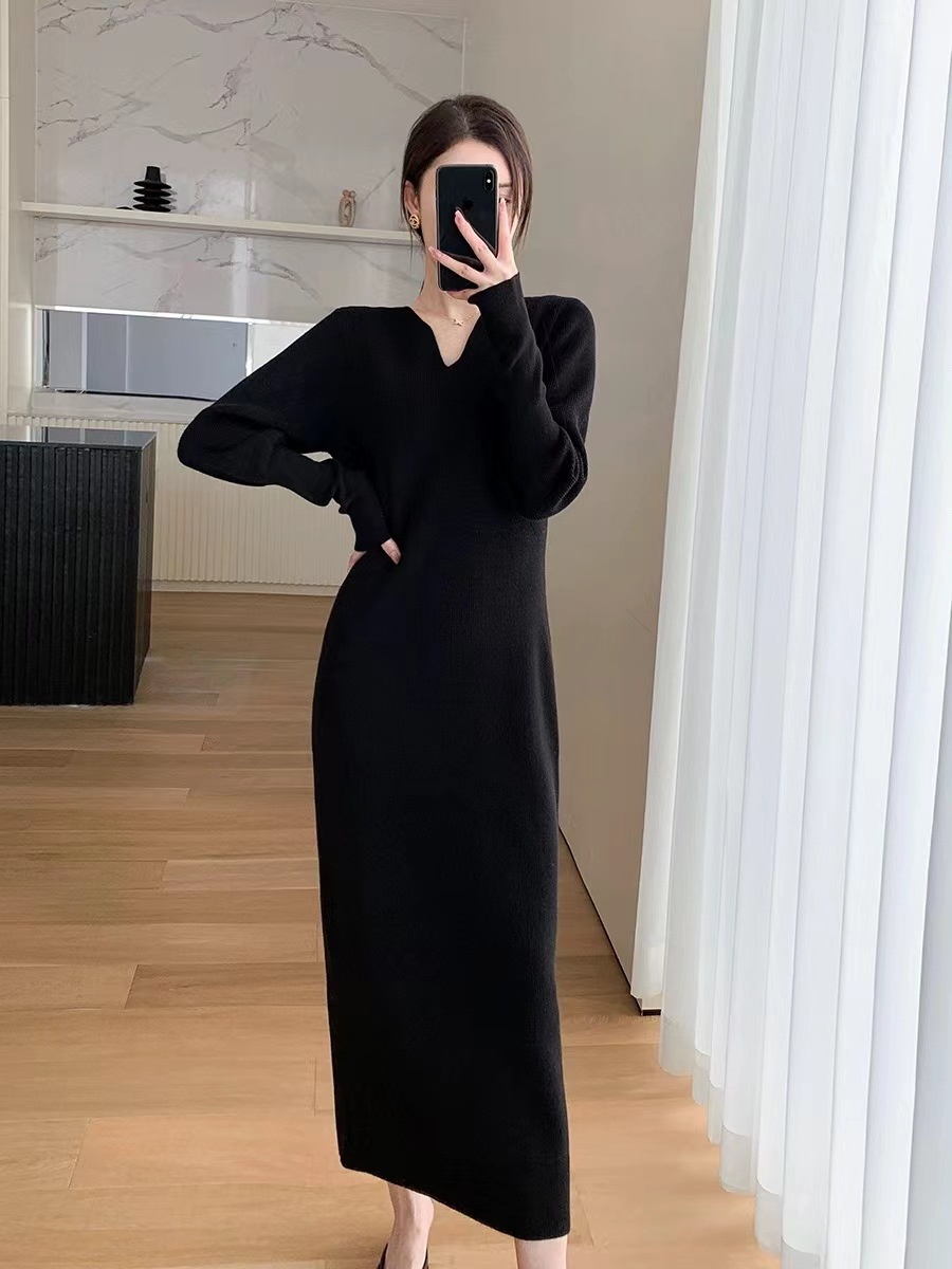 2023秋冬新款V领法式配大衣内搭毛衣打底裙女气质长款针织连衣裙