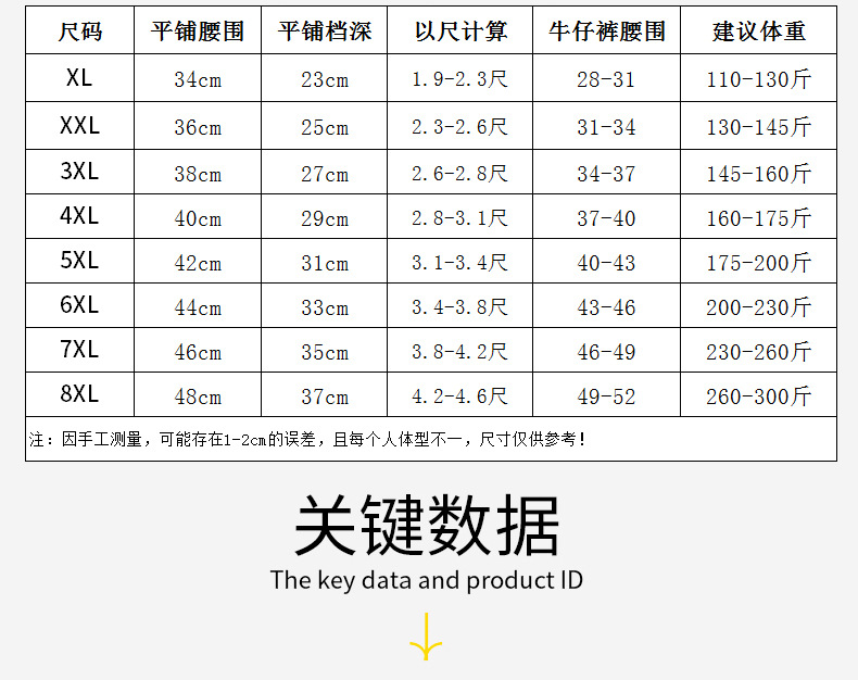 | 7XL Recommended 115.00 Kg-130.00 kg(7XL 建议230-260斤) | USD $3.27 | 1830 piece available |