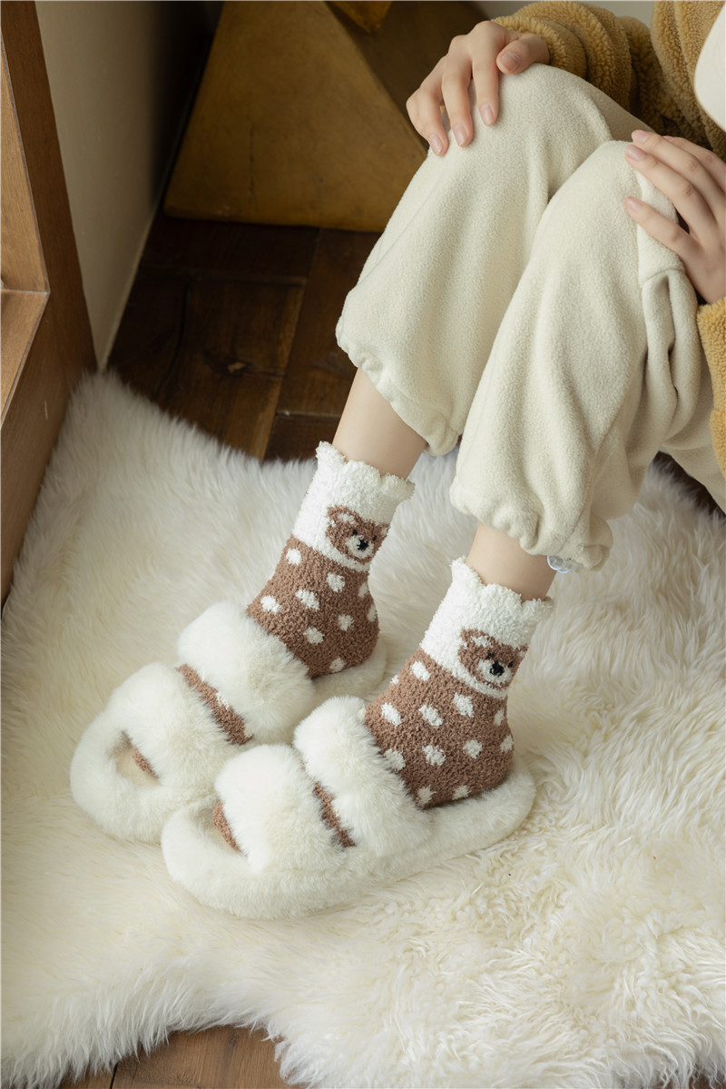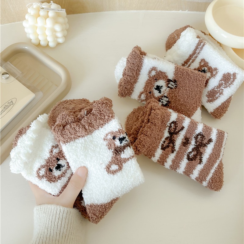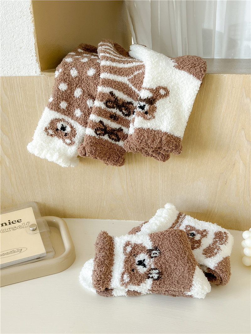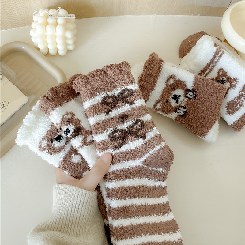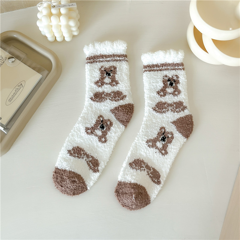 珊瑚绒袜子女咖色系小熊女中筒袜冬季加绒加厚保暖地板袜睡眠女袜