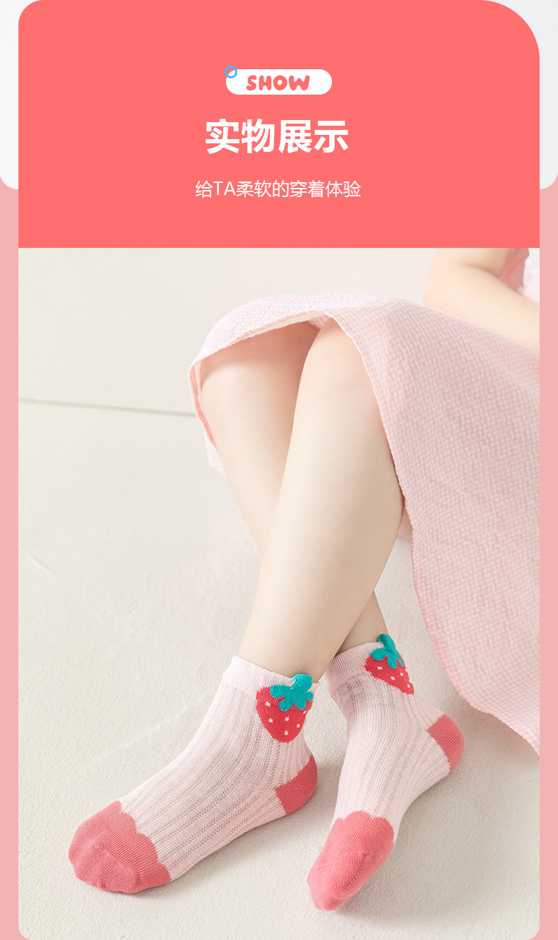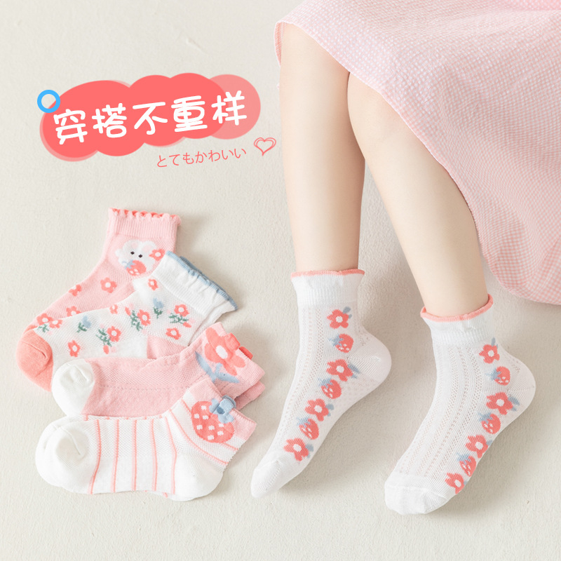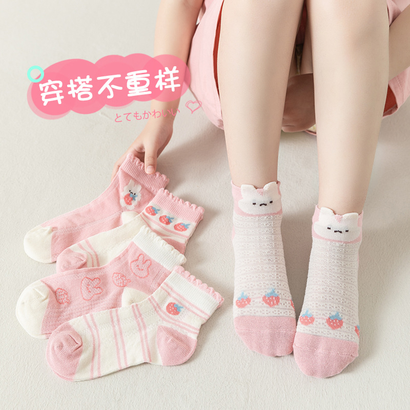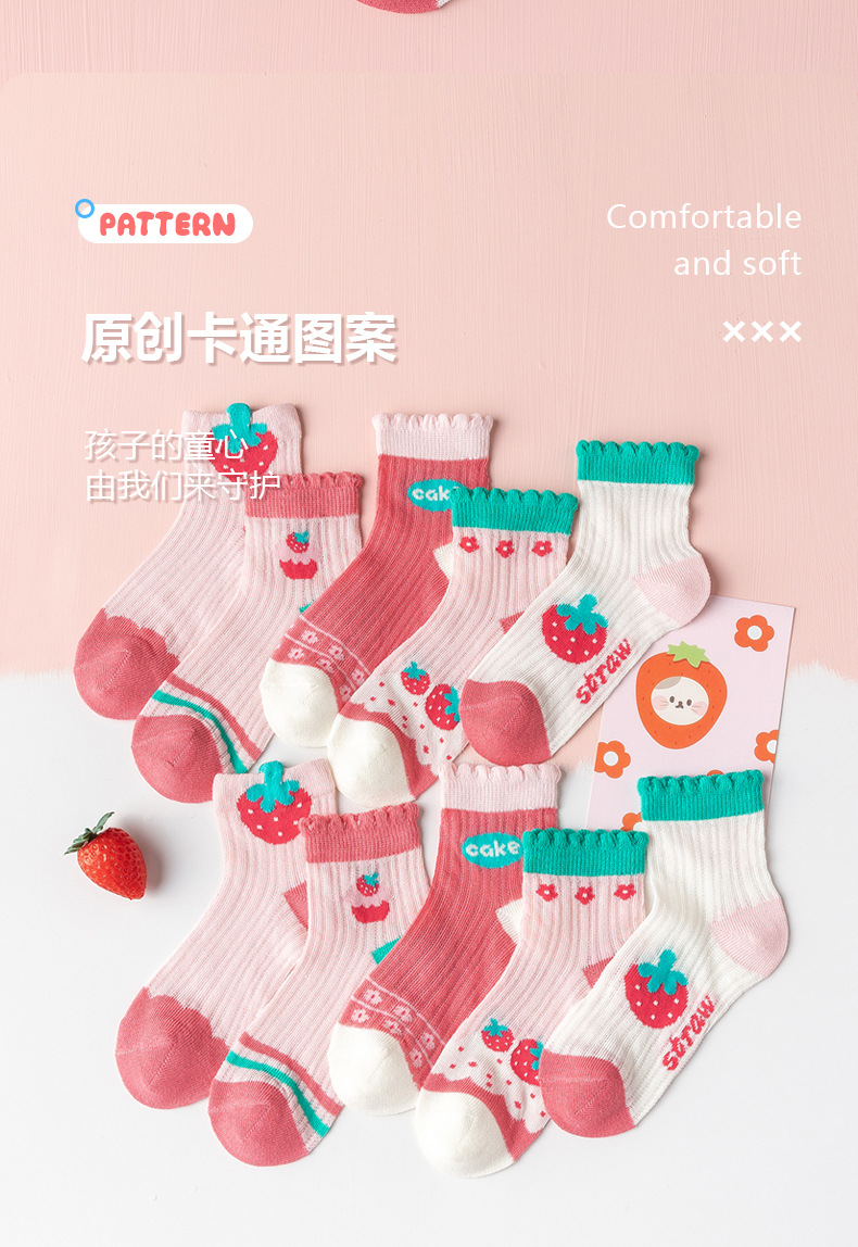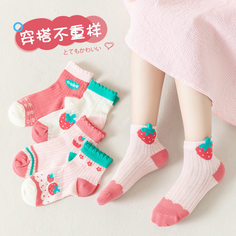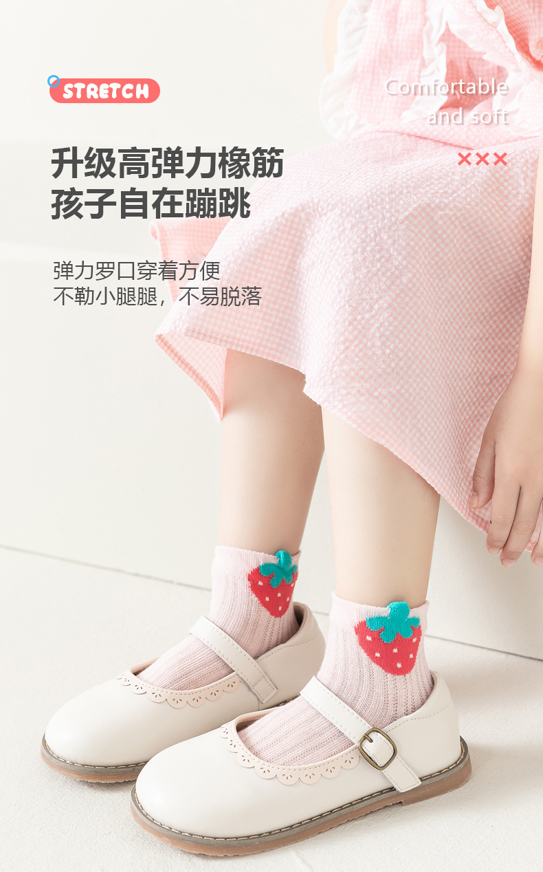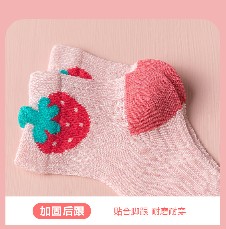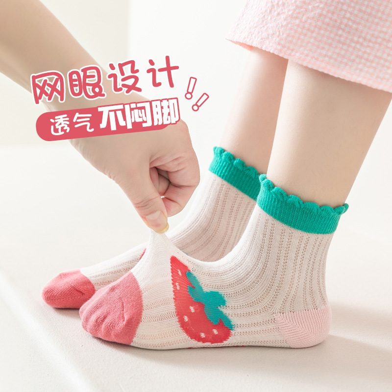 儿童袜子女童中大童春秋薄款小孩宝宝中筒袜可爱草莓网眼透气棉袜