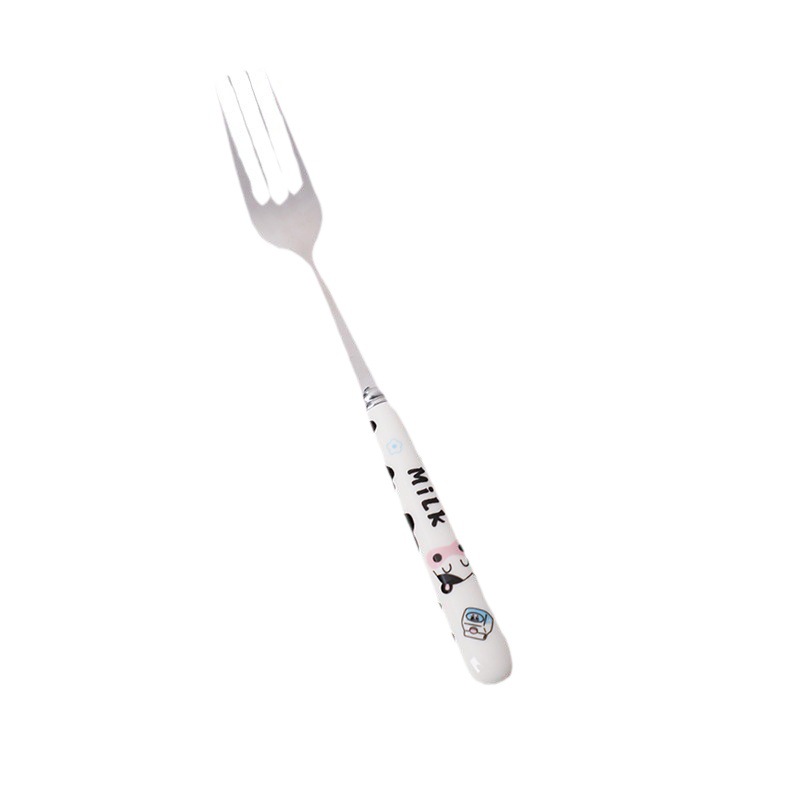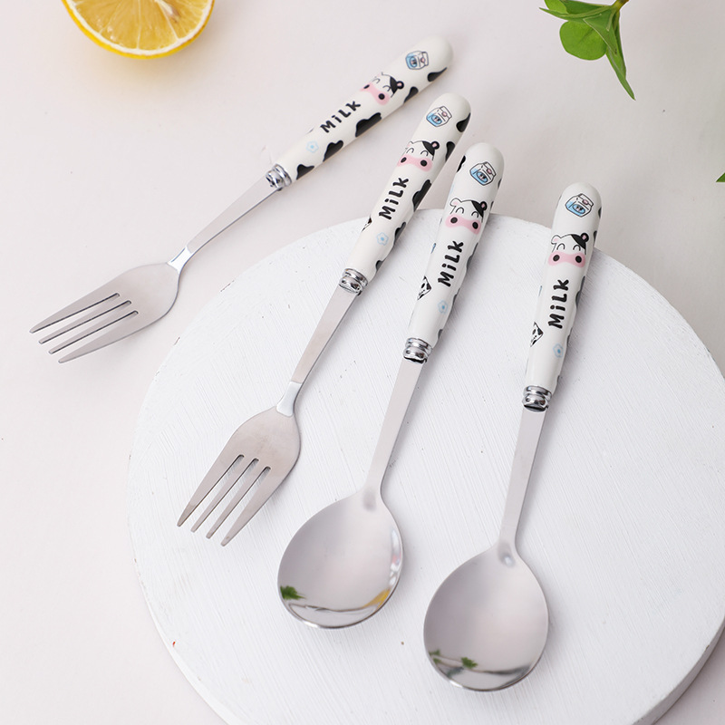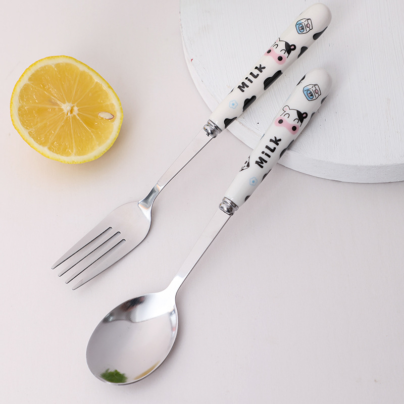 【2只装】创意可爱风奶牛勺学生宿舍家用陶瓷不锈钢叉勺便携餐具