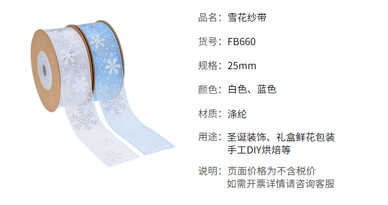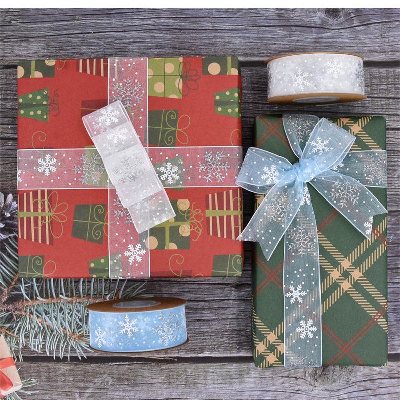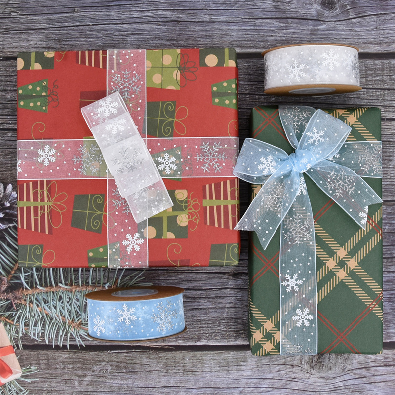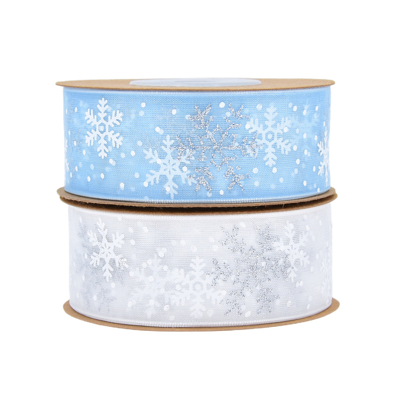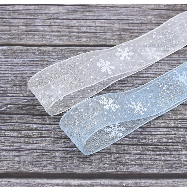 亚马逊新款撒银粉雪花纱带雪纺 手工制作发夹圣诞节礼盒圣诞丝带