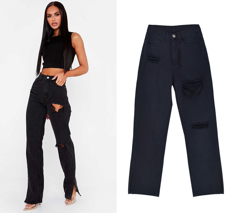 欧美女装高腰显高瘦直筒牛仔长裤拖地裤破洞脚口开叉垂感微喇叭裤