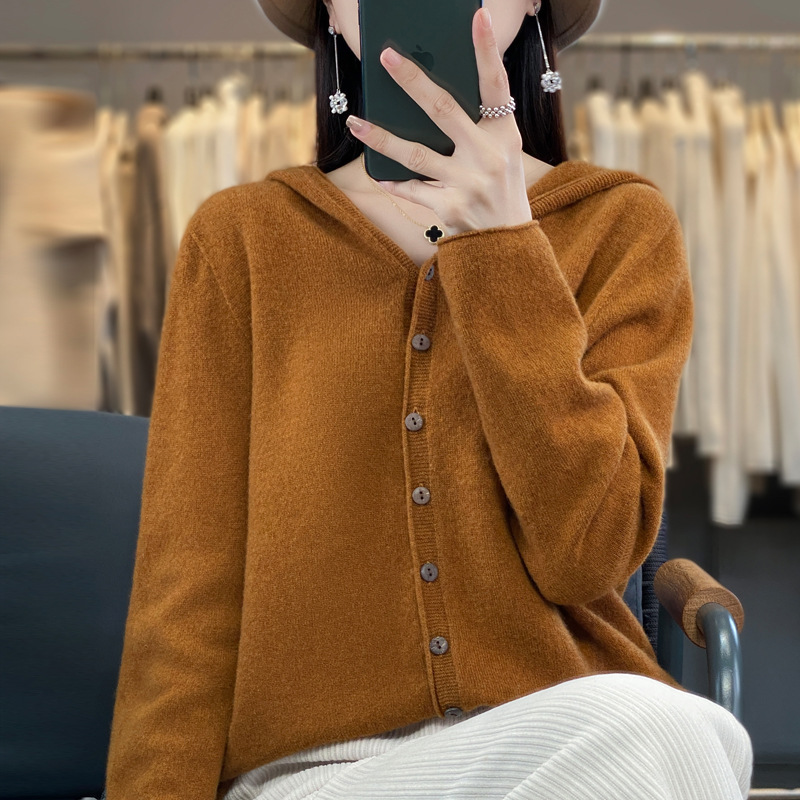 澳洲美丽诺100纯羊毛针织衫女一线成衣无缝连帽开衫羊绒毛衣外套