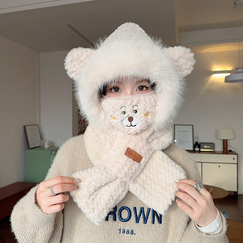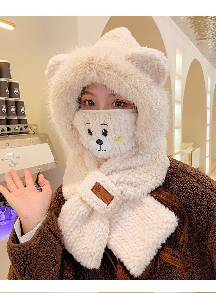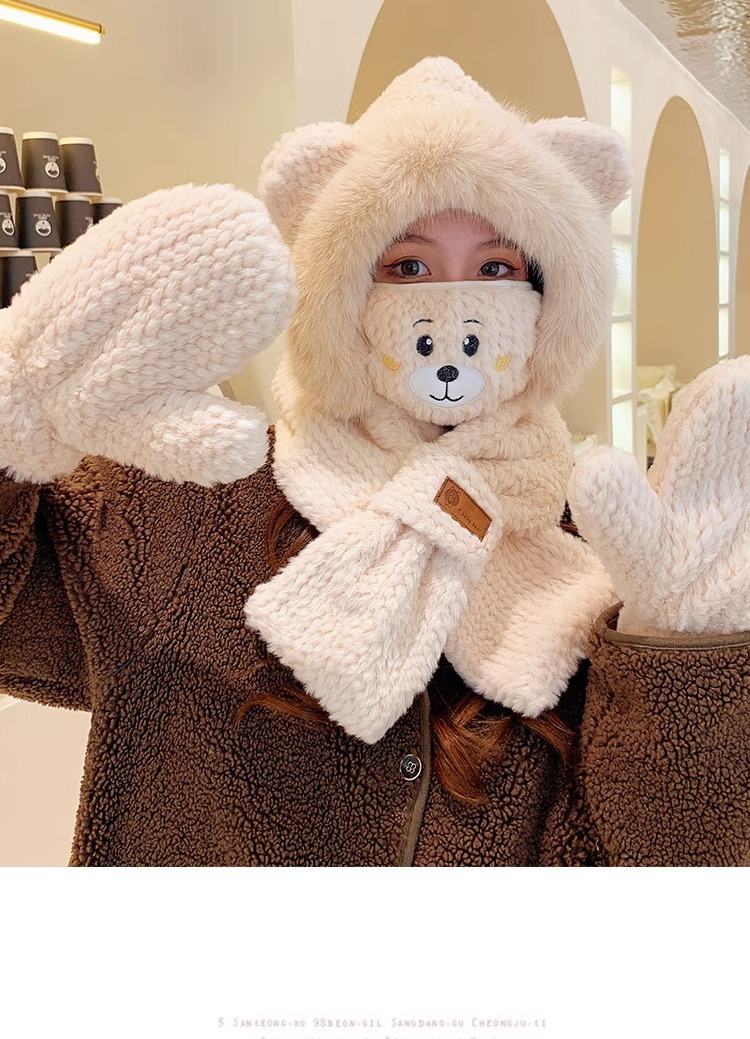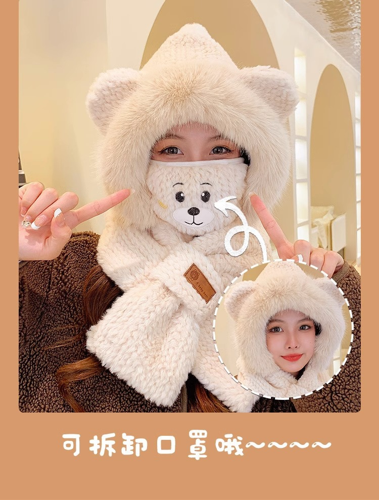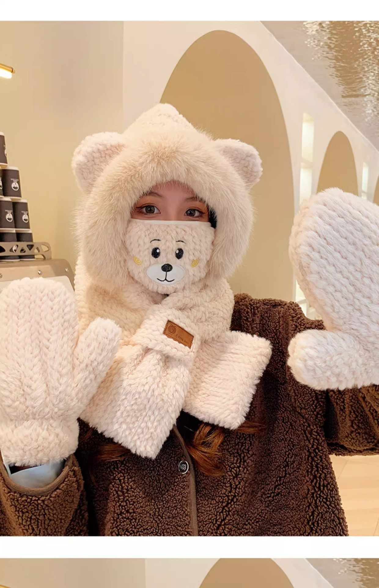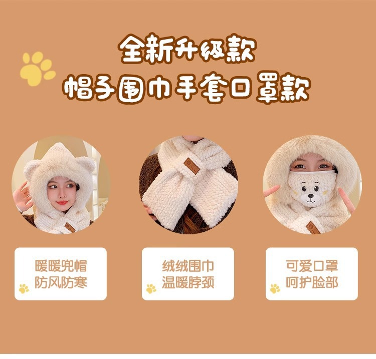 小熊帽子围巾手套口罩一体三件套女冬季骑车防寒保暖百搭可爱连帽