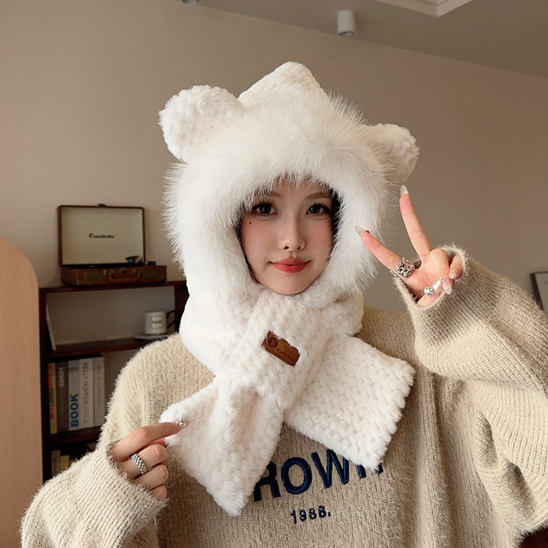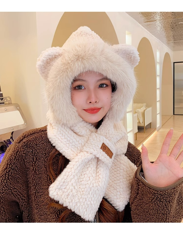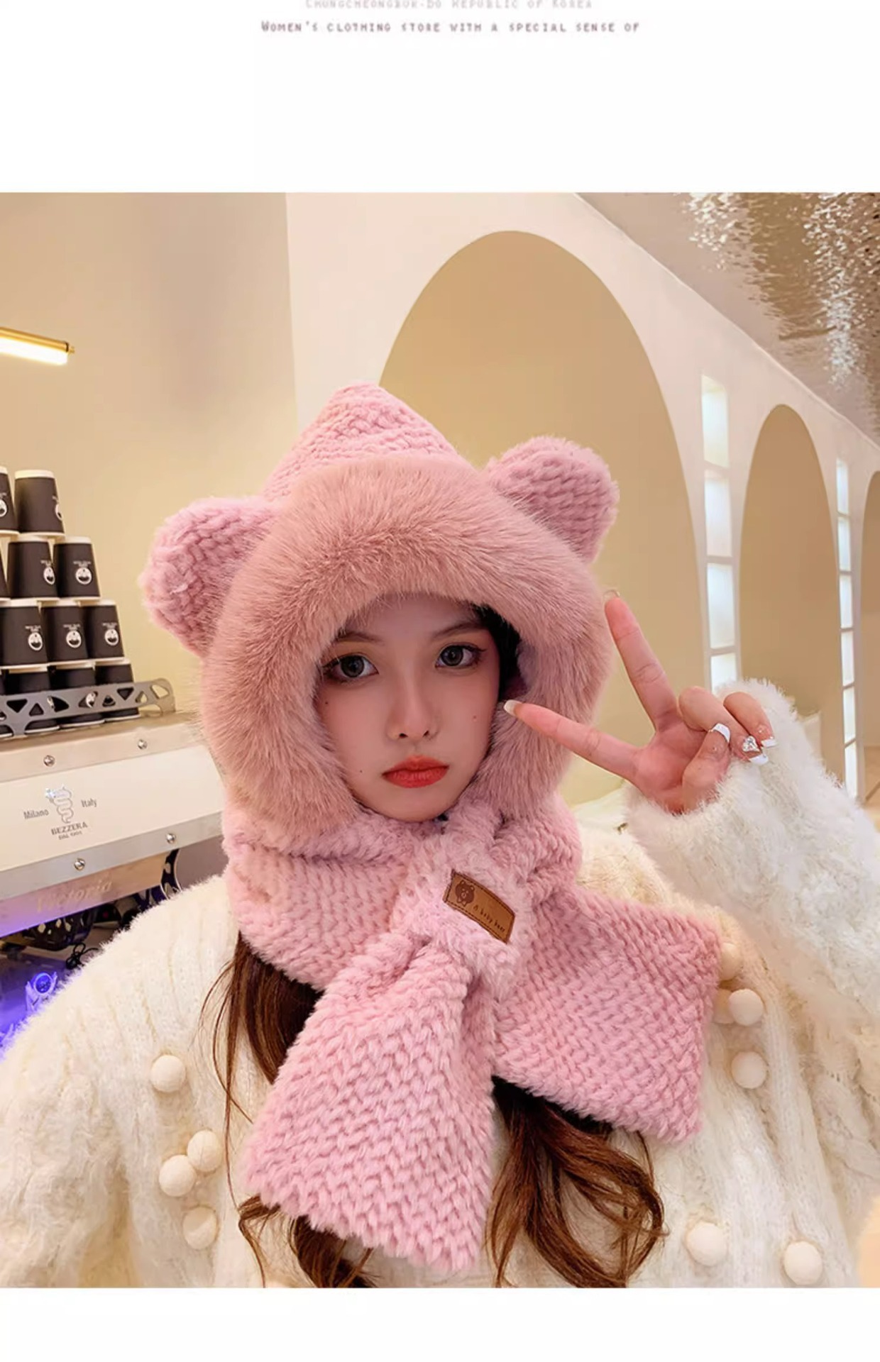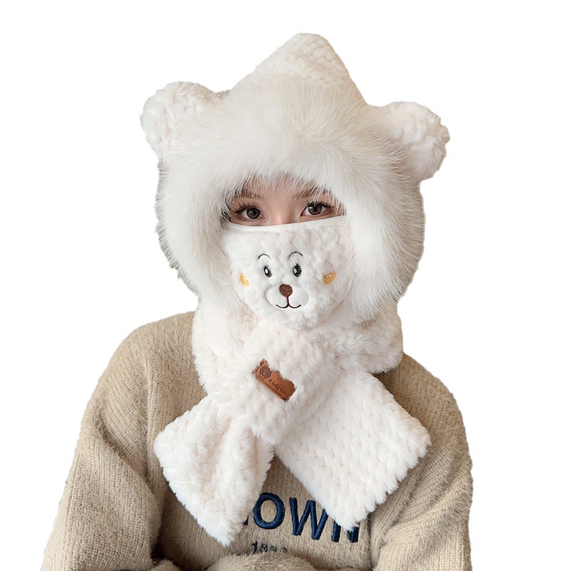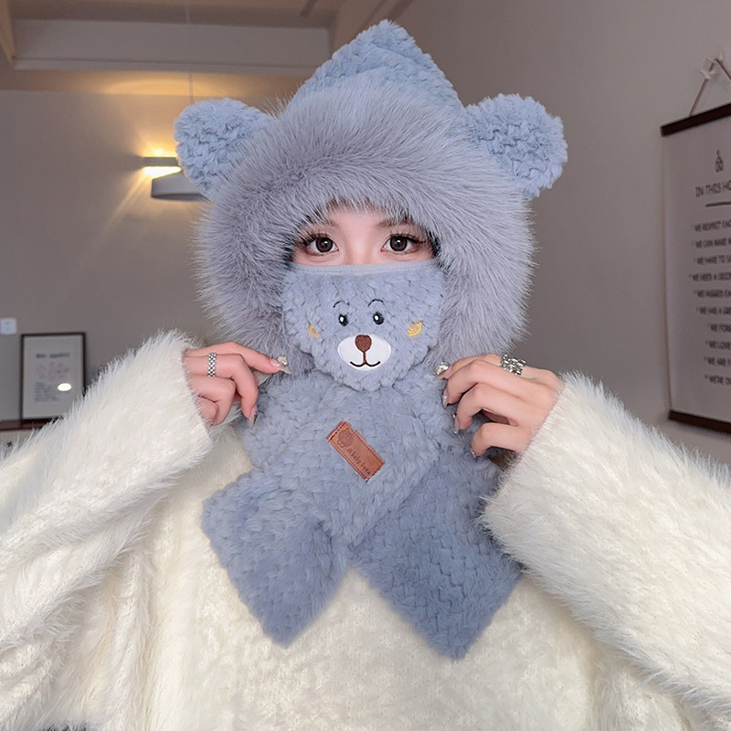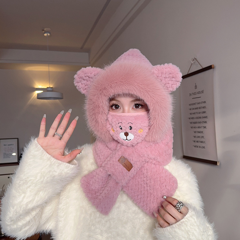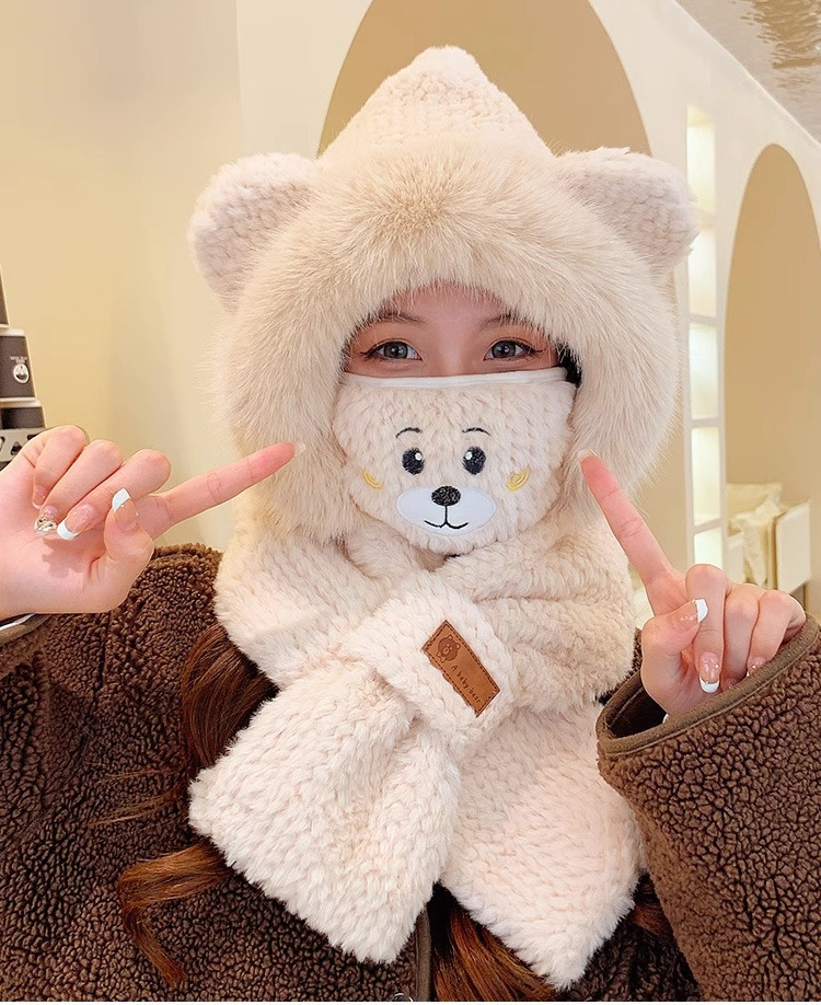 小熊帽子围巾手套口罩一体三件套女冬季骑车防寒保暖百搭可爱连帽