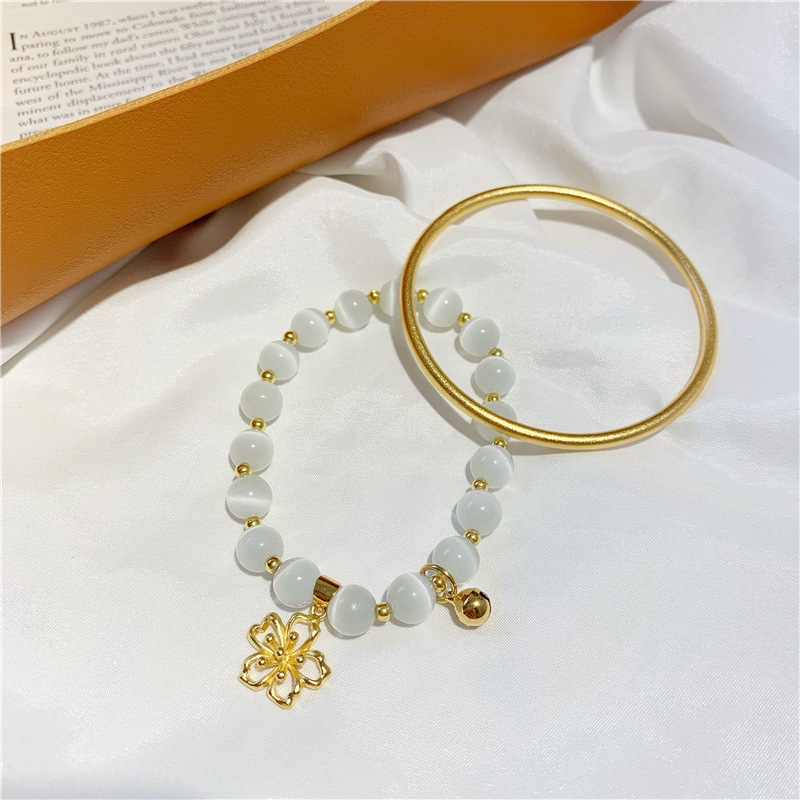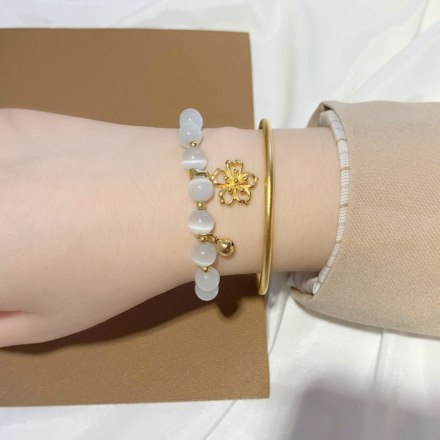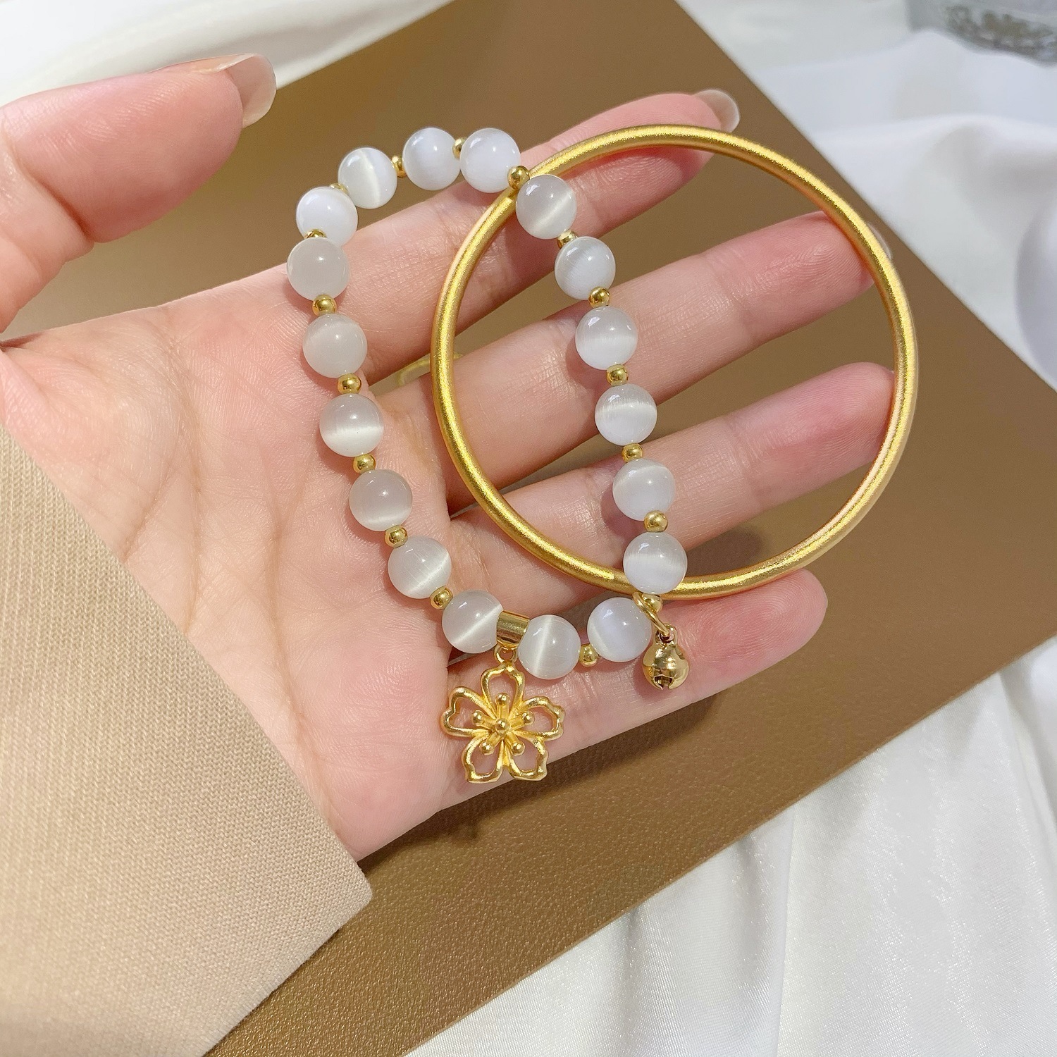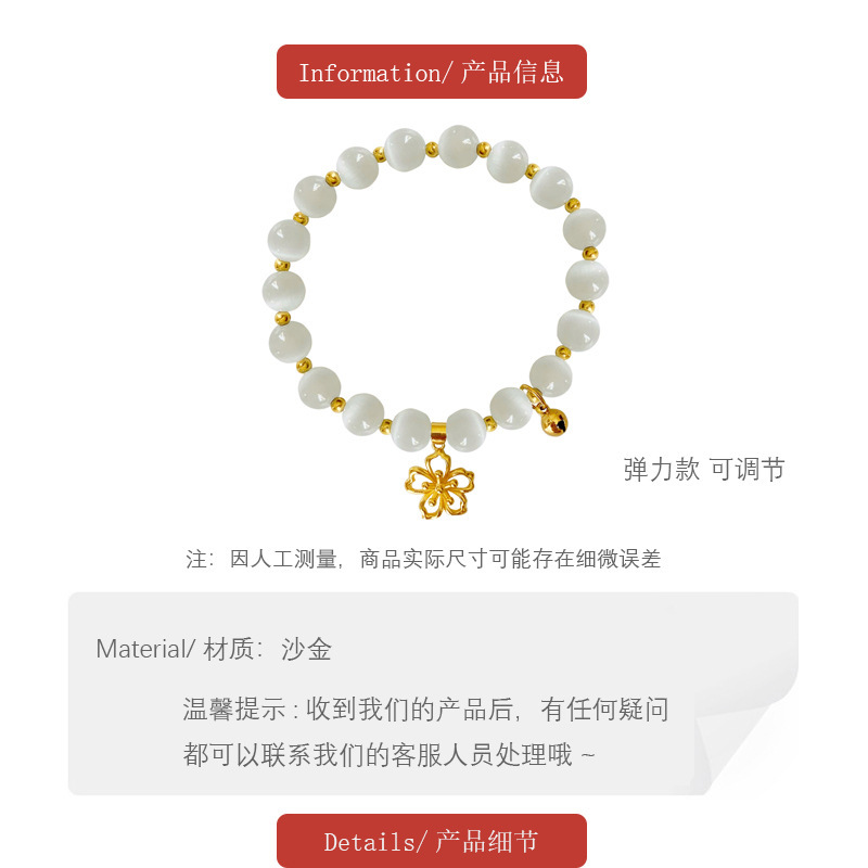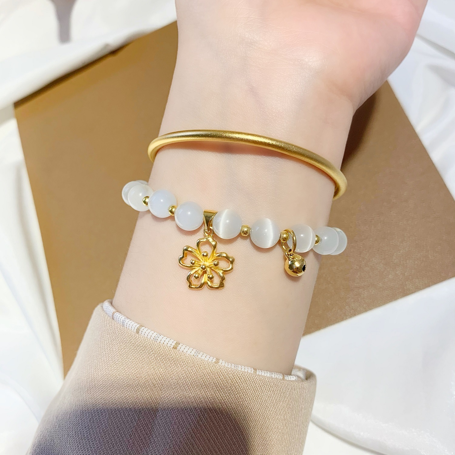 猫眼石小花朵铃铛吊坠手环串珠首饰沙金传承手镯弹力手链女两件套