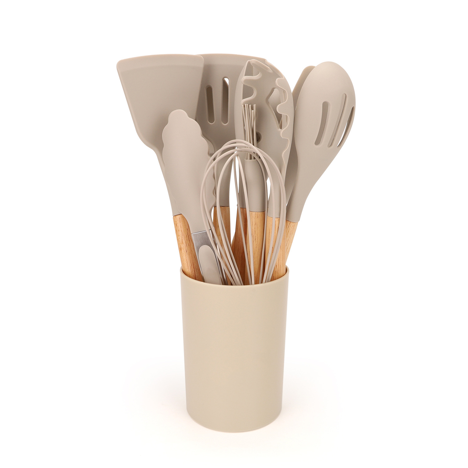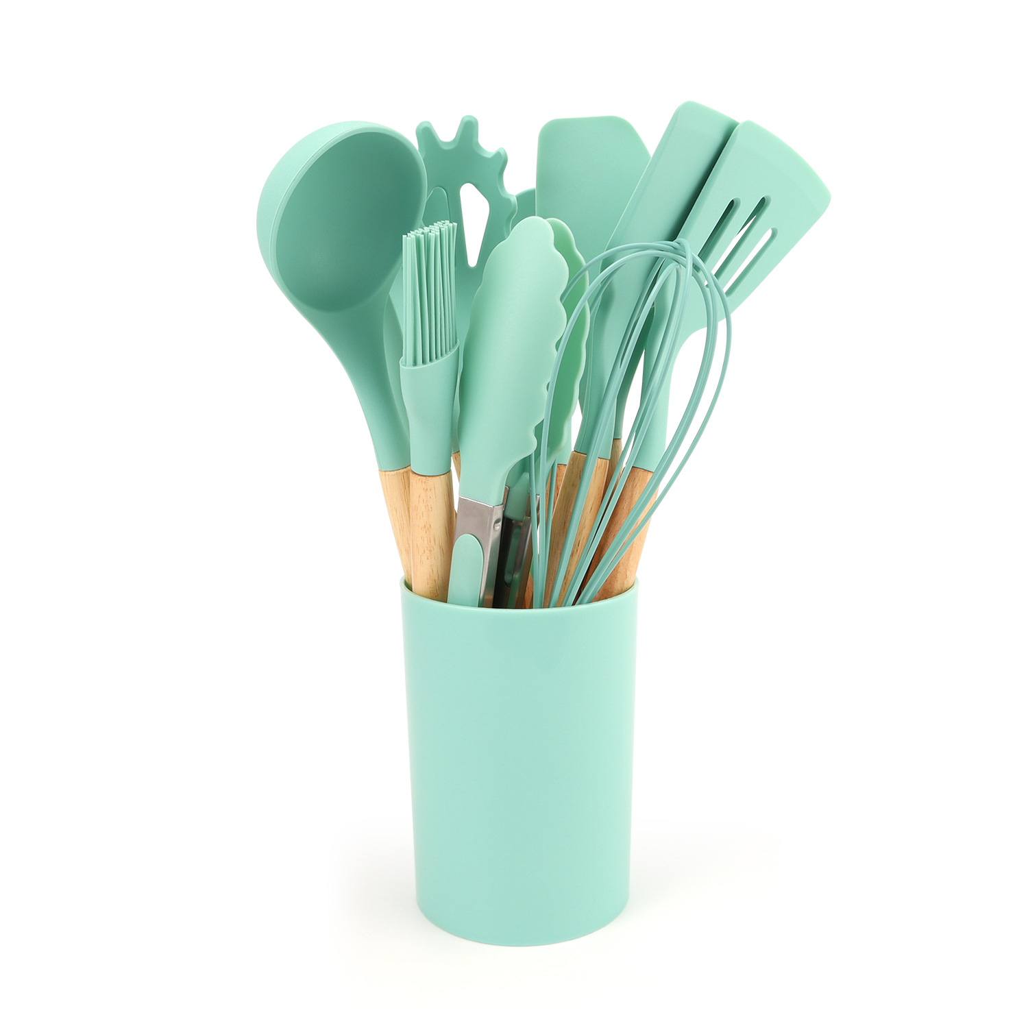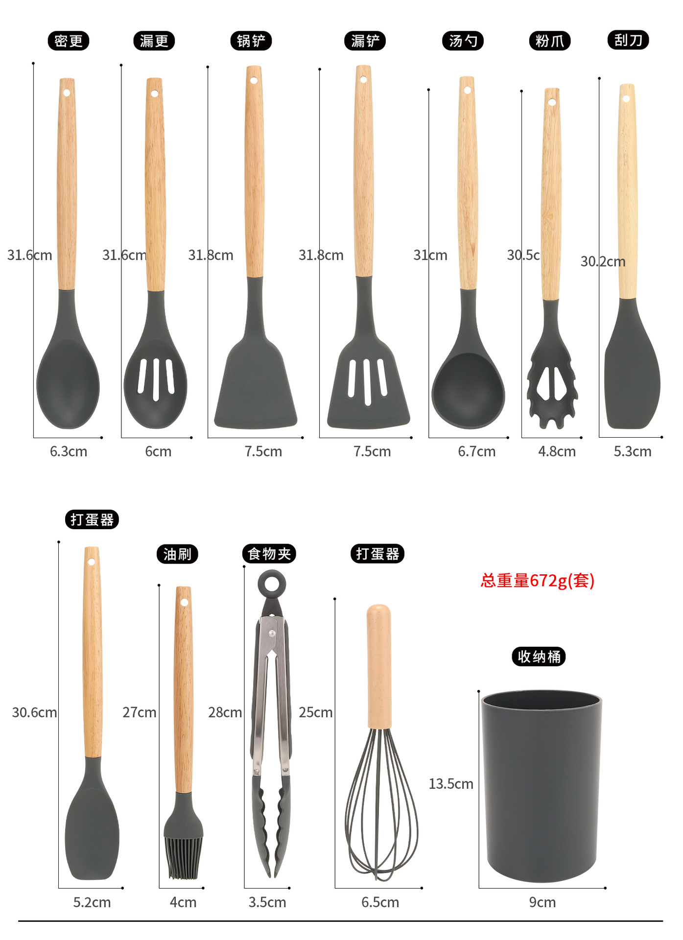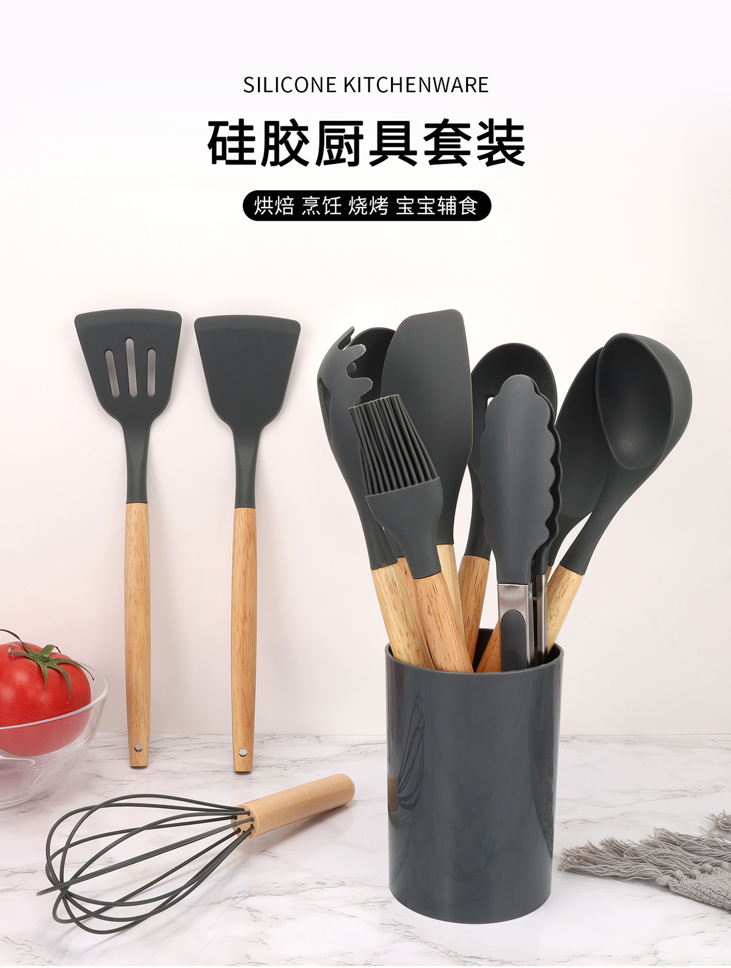 出口烹饪不粘锅收纳桶装木柄硅胶厨具轻木柄12件套不粘锅铲勺套装