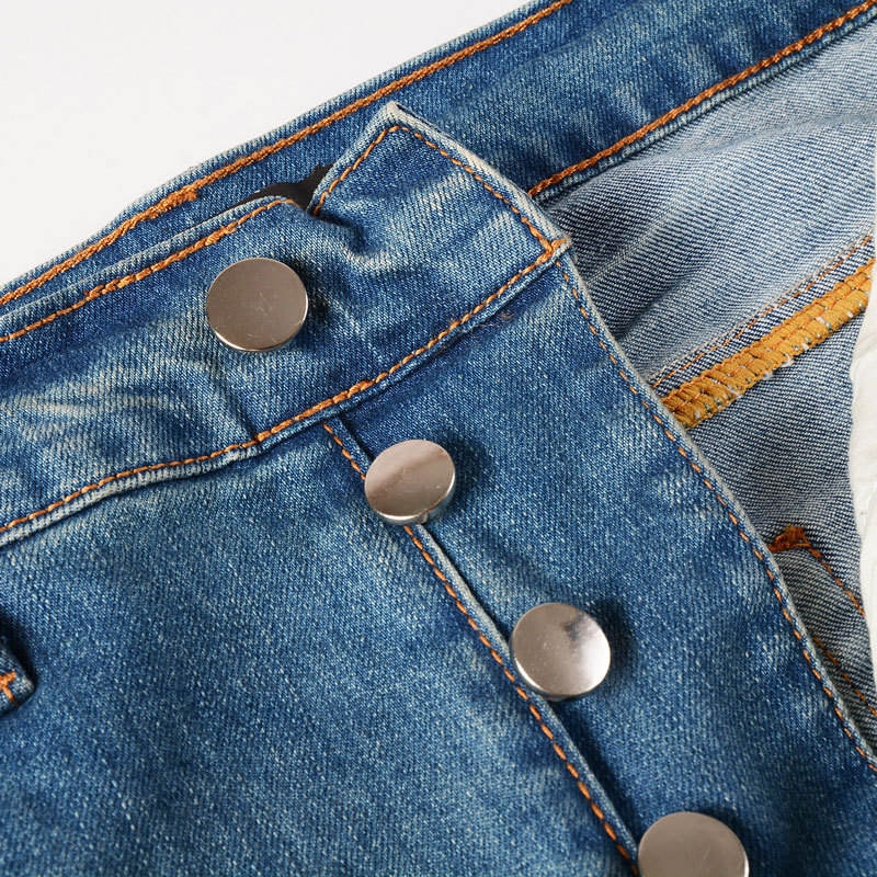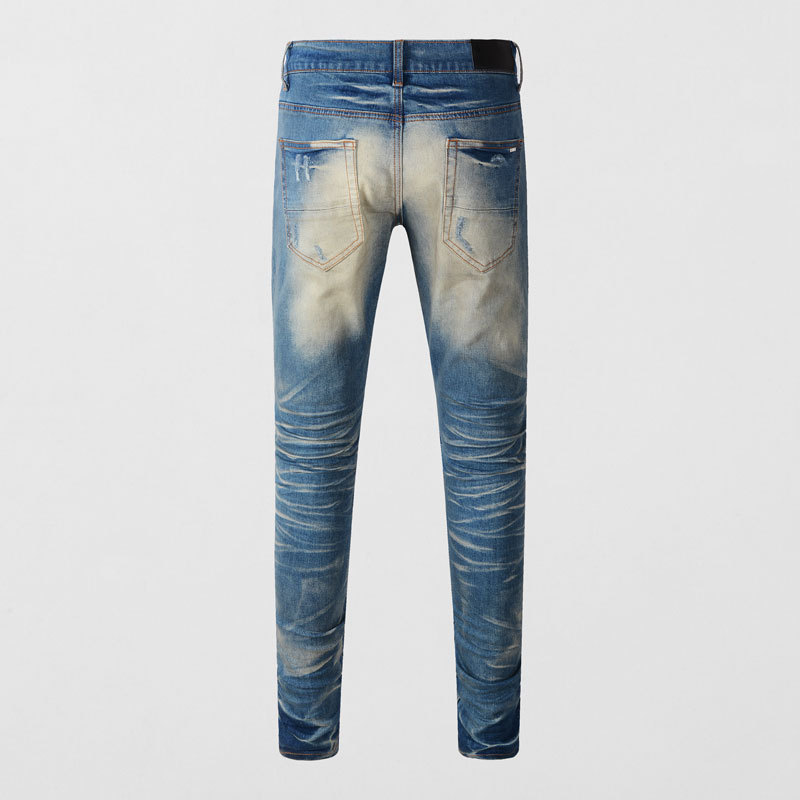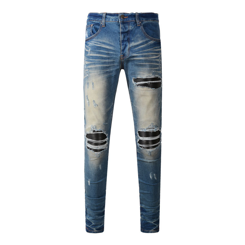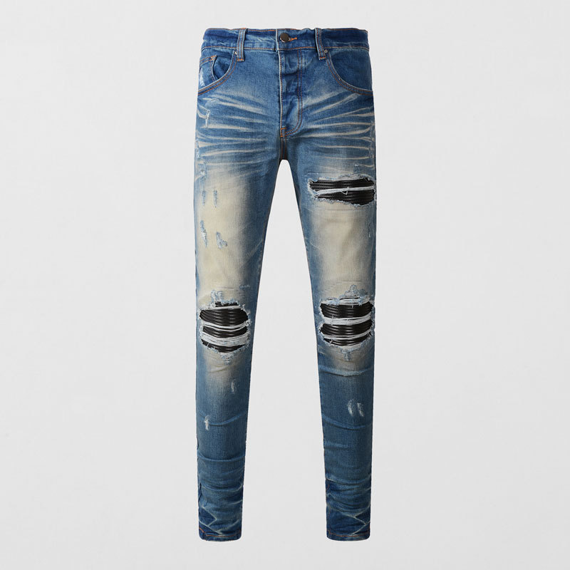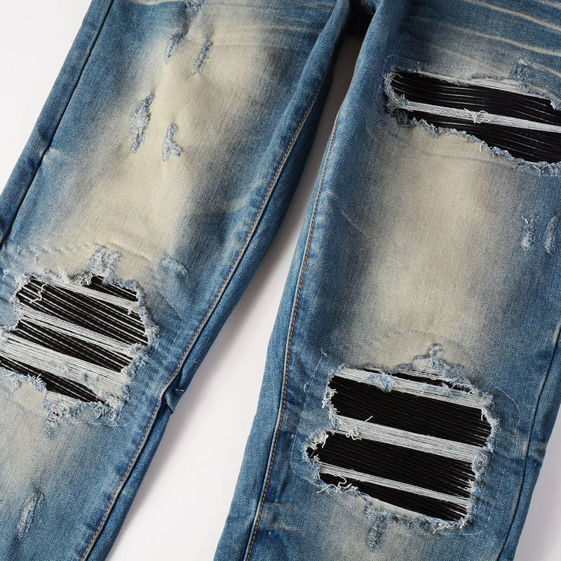 时尚街头潮流男士牛仔裤蓝色水洗做旧破洞补丁弹力修身潮牌男长裤
