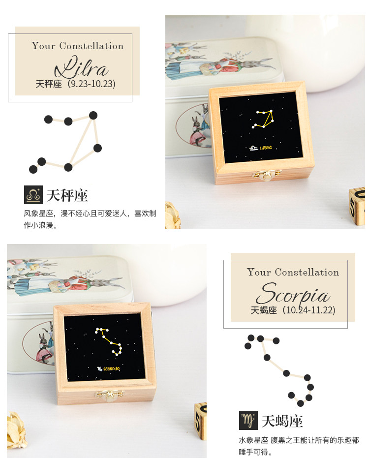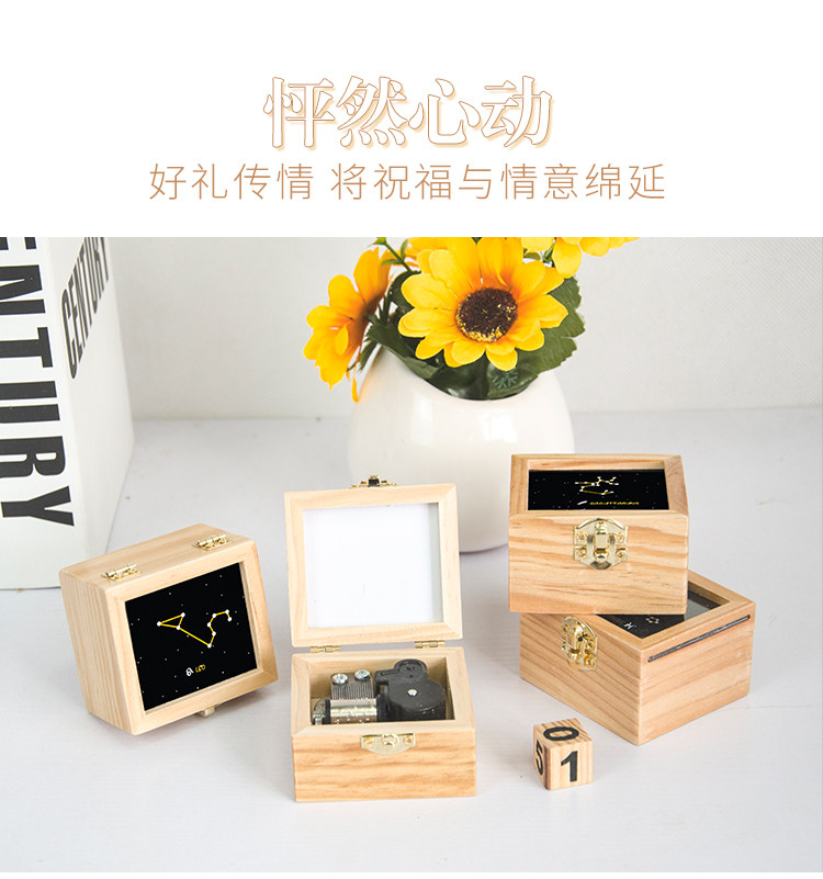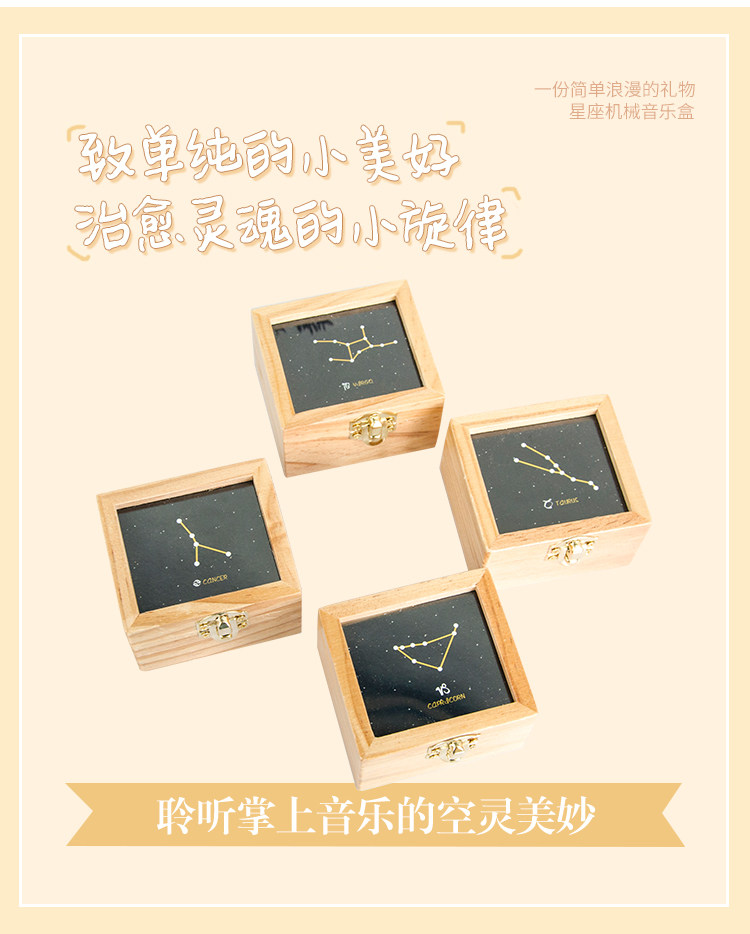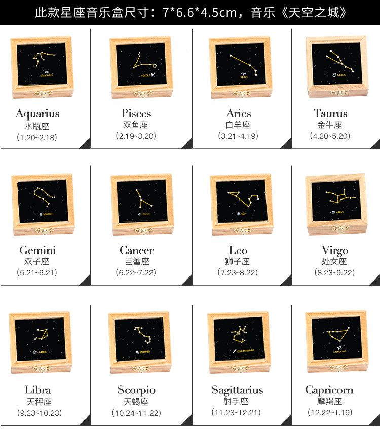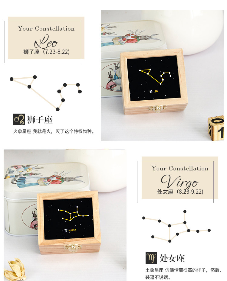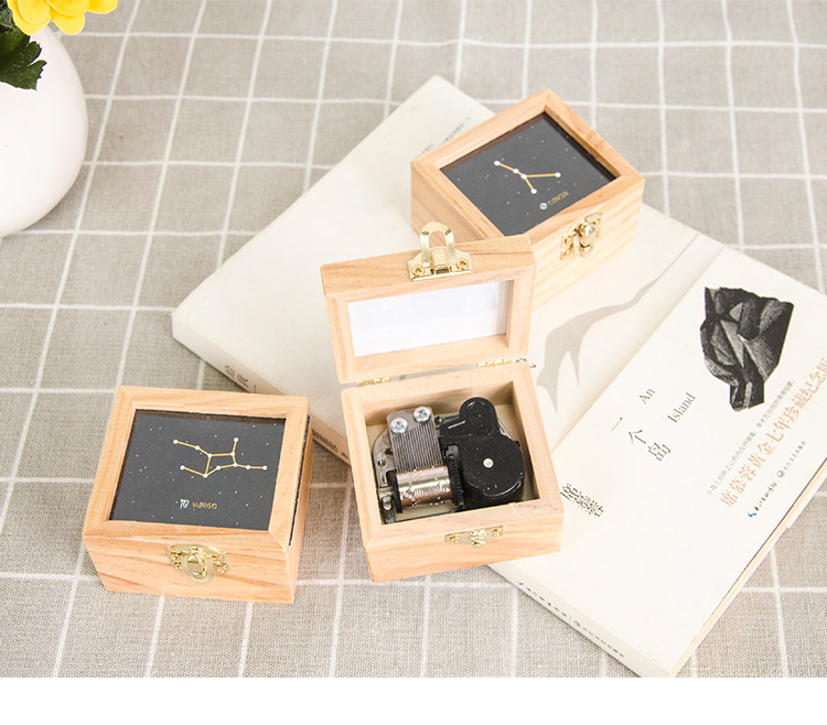zakka创意十二星座音乐盒木质发条手摇旋转八音生日礼物厂家直销