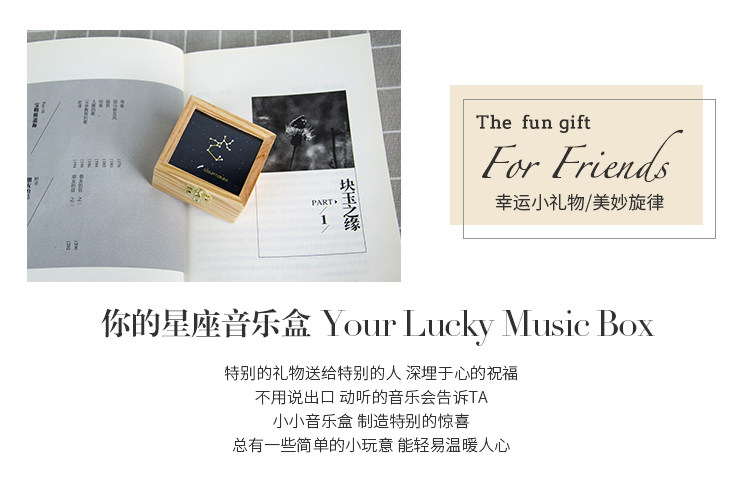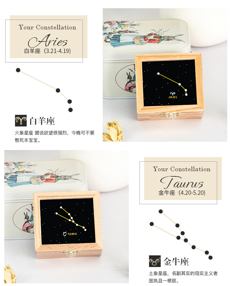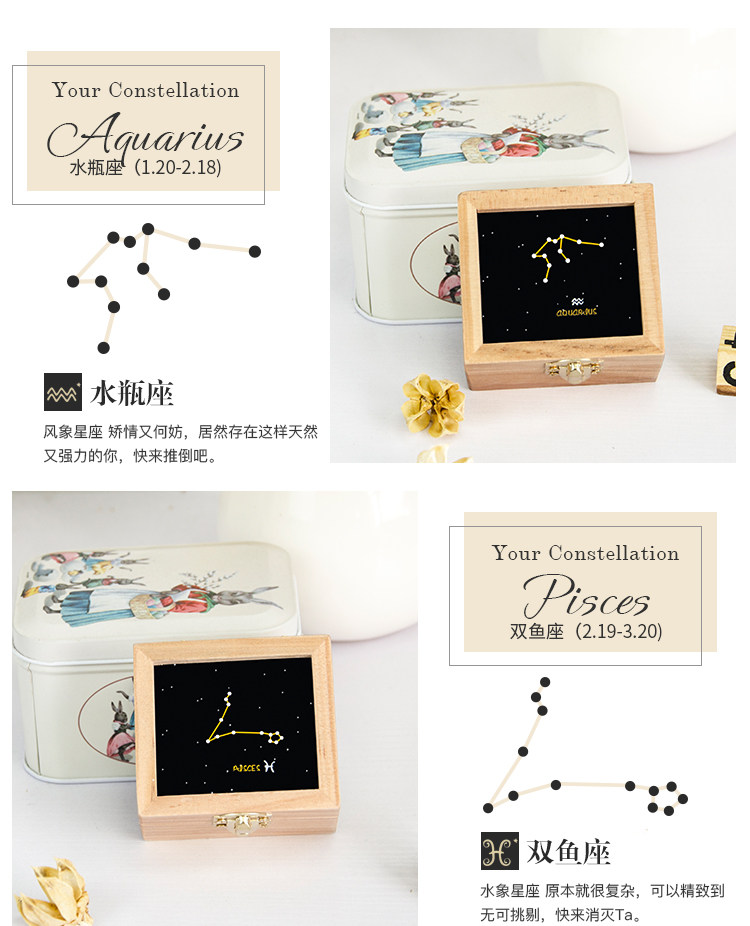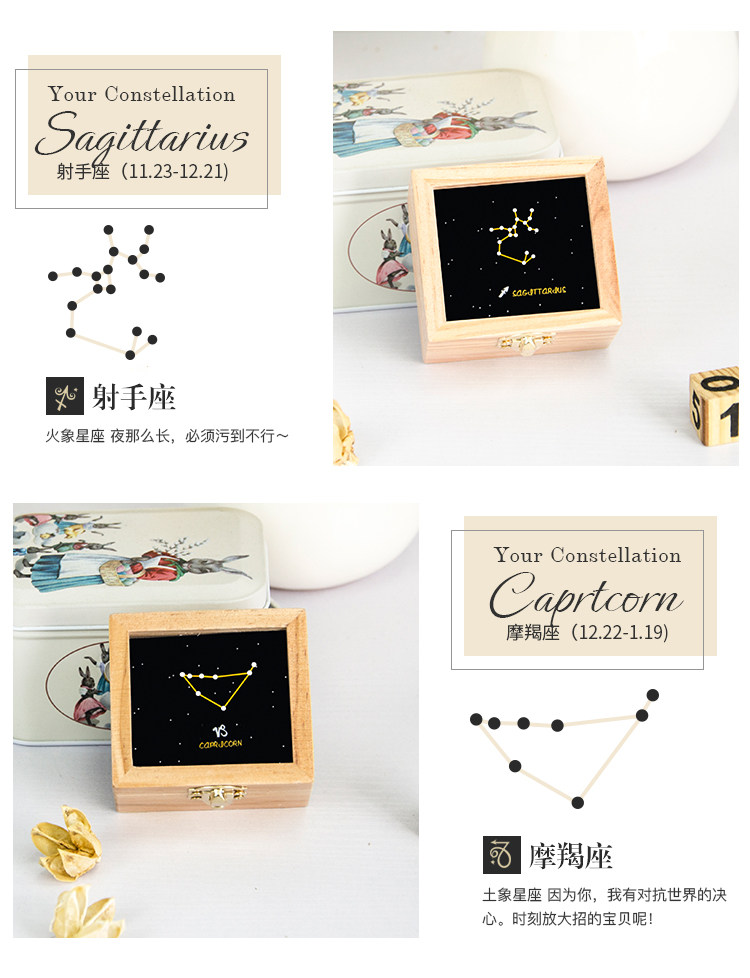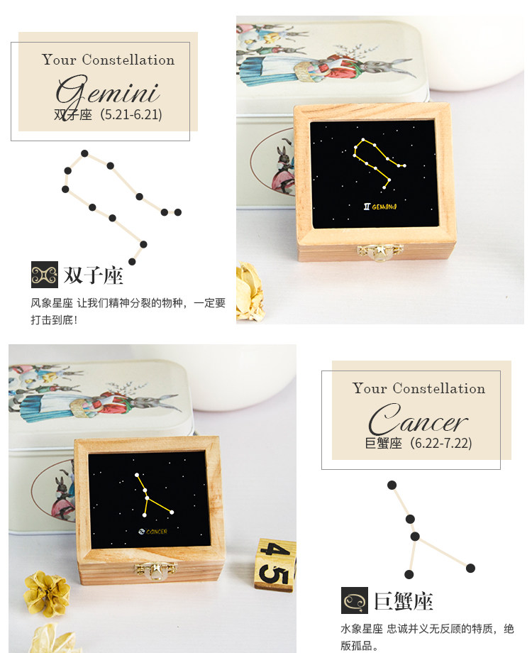 zakka创意十二星座音乐盒木质发条手摇旋转八音生日礼物厂家直销