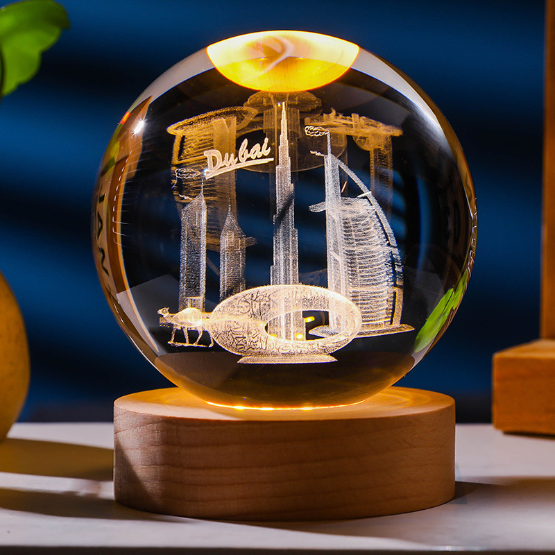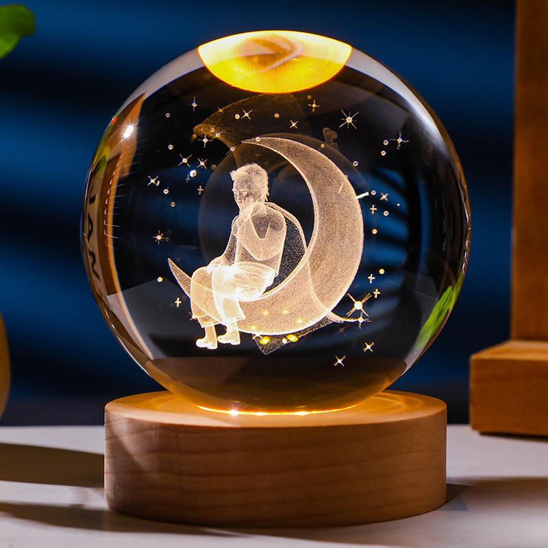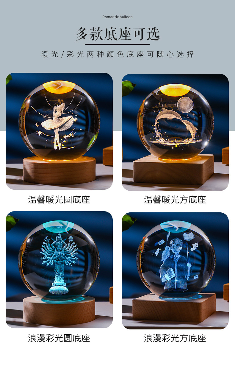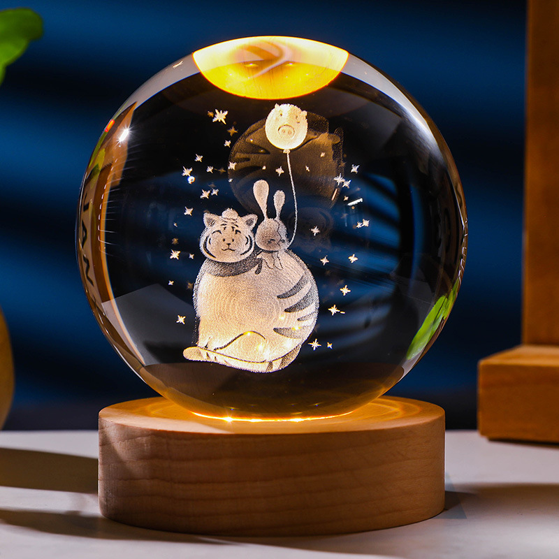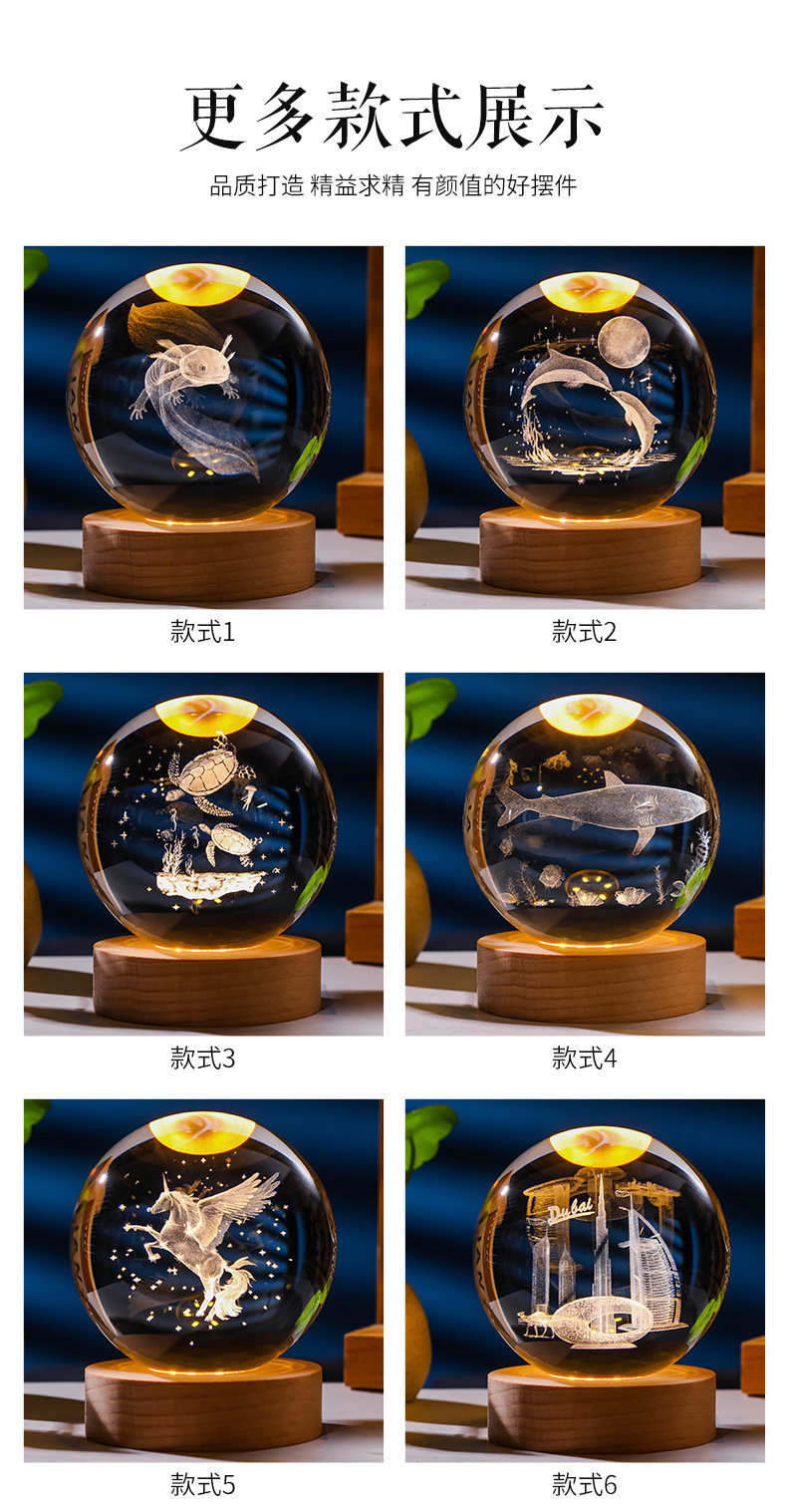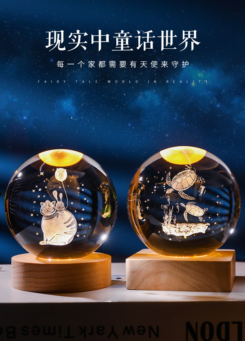 发光水晶球小夜灯usb接口实木底座3D内雕送学生送男生创意小摆件