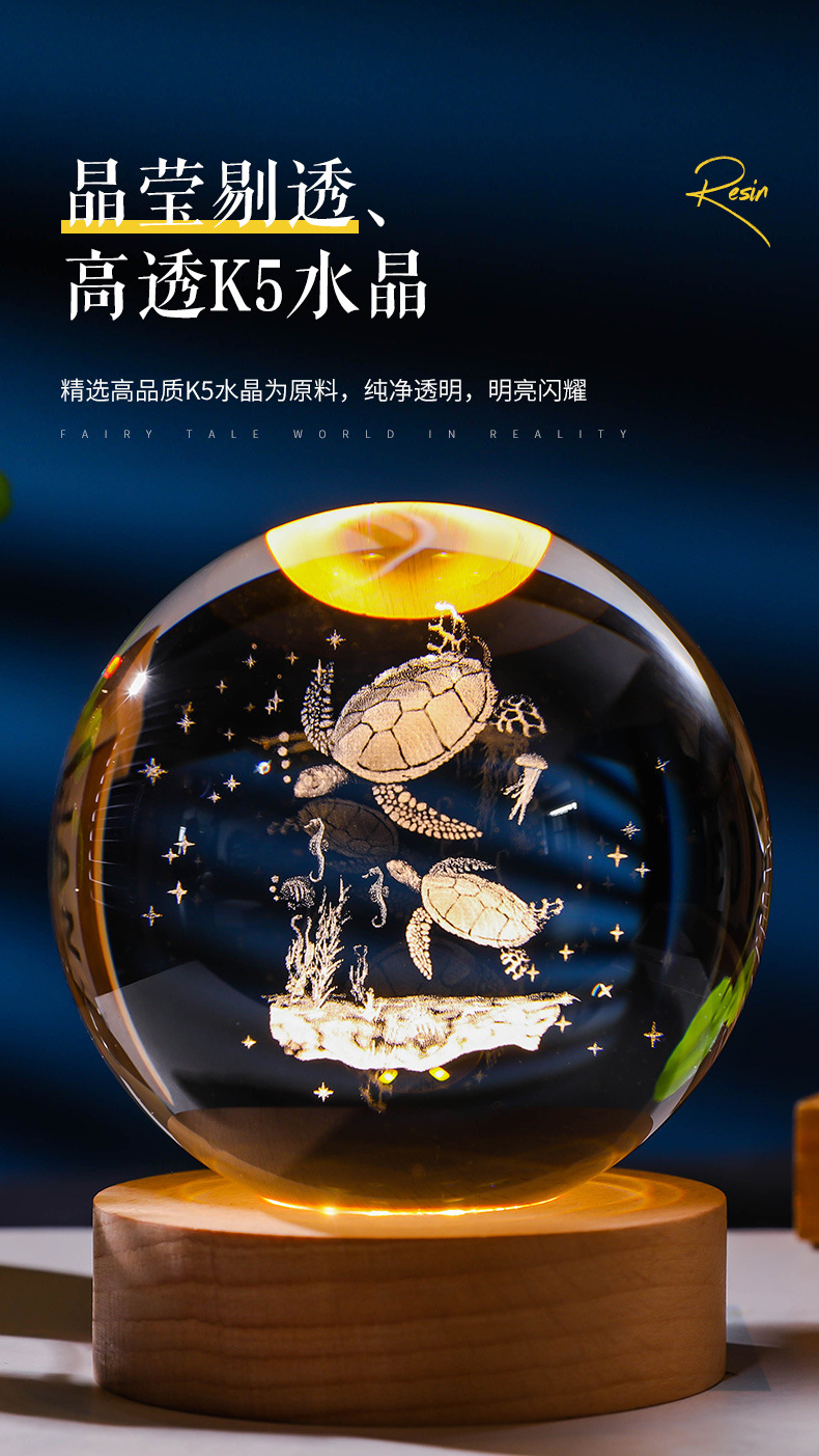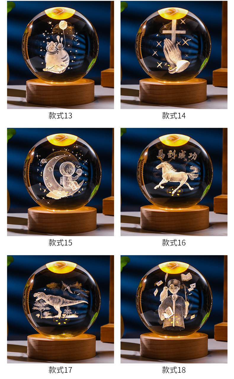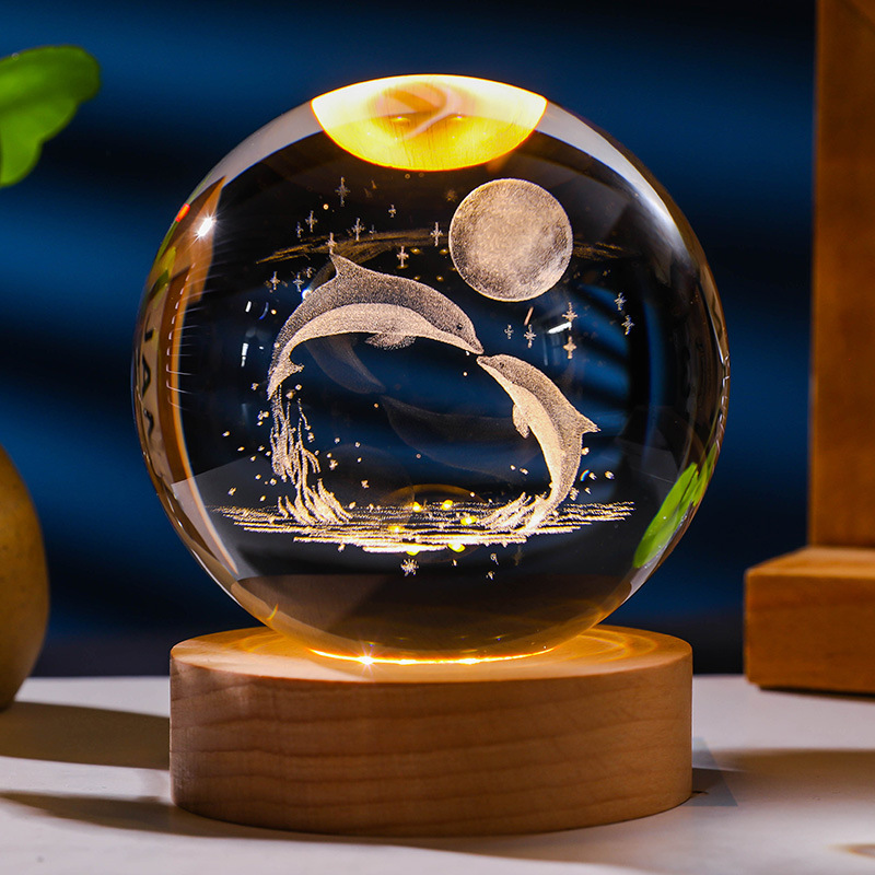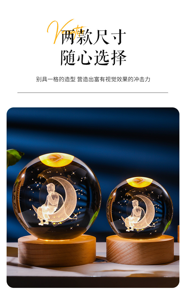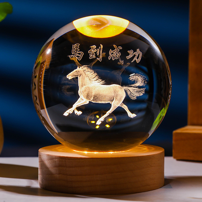 发光水晶球小夜灯usb接口实木底座3D内雕送学生送男生创意小摆件