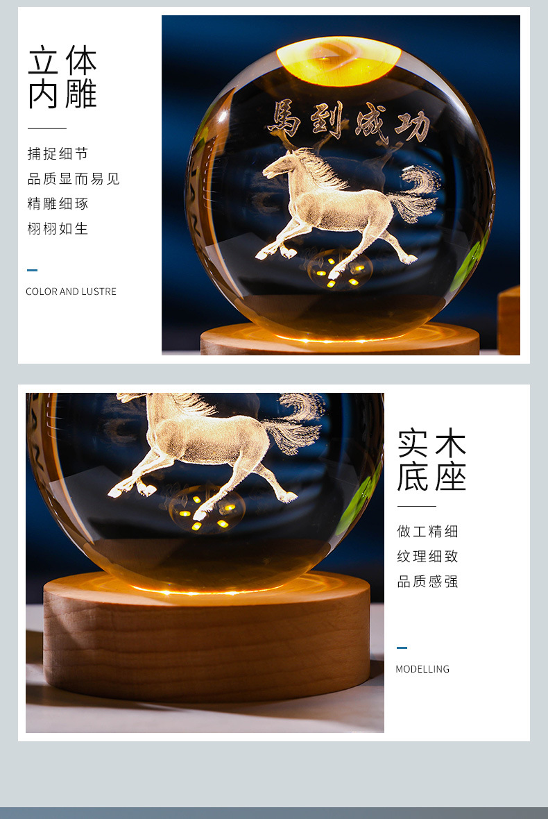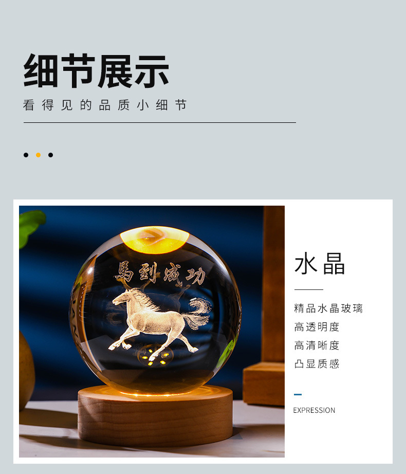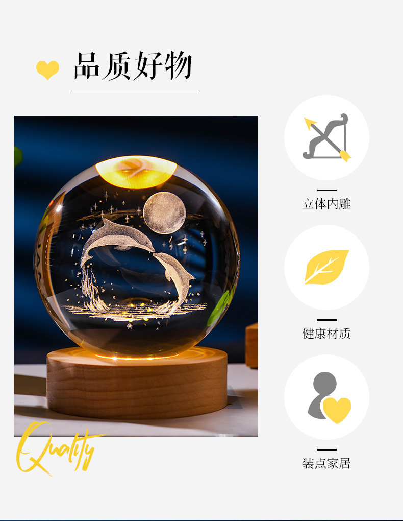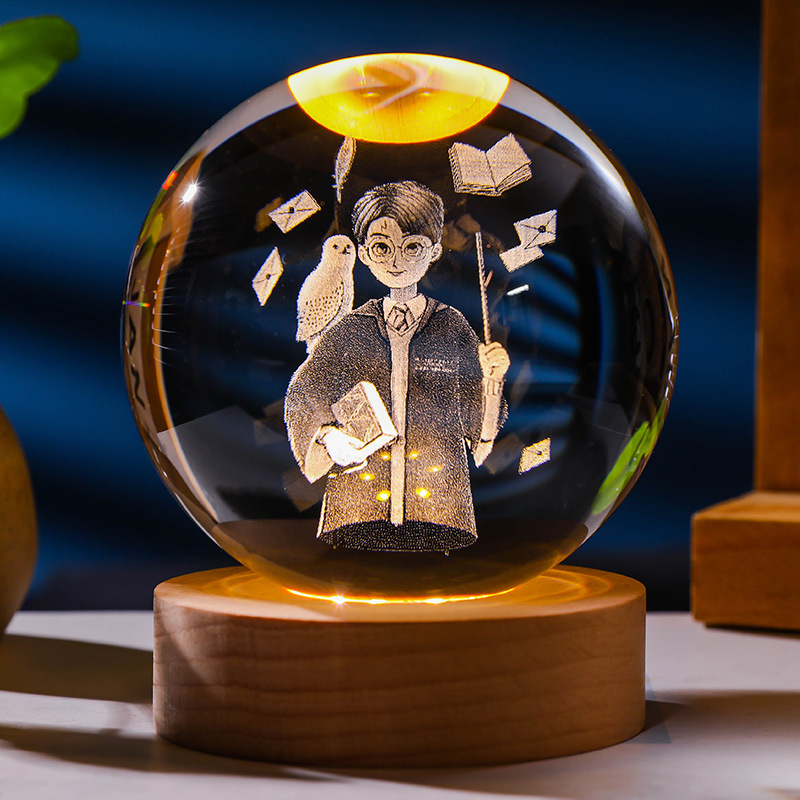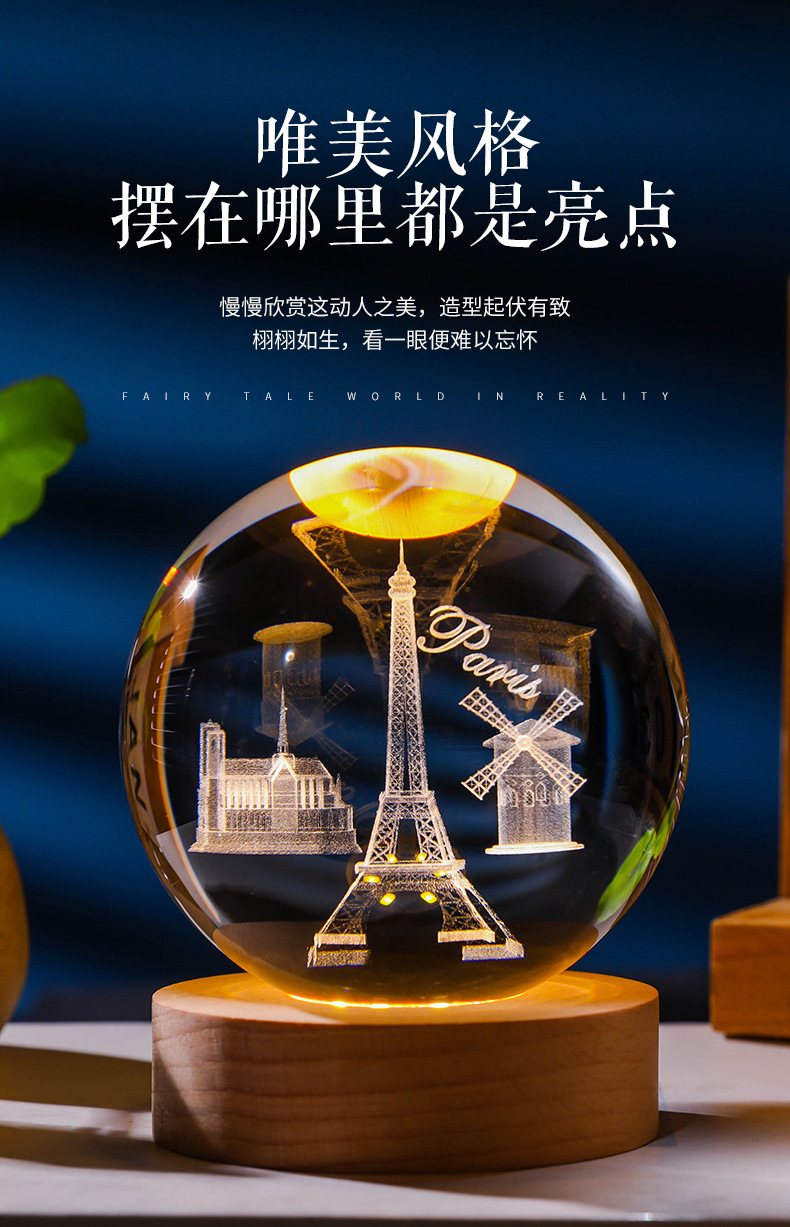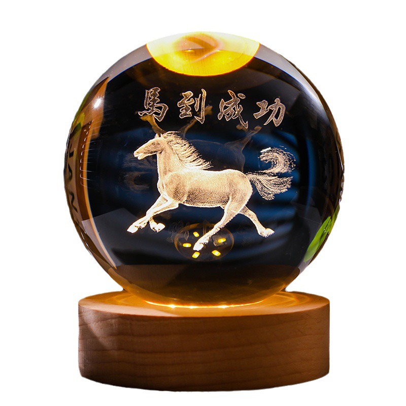 发光水晶球小夜灯usb接口实木底座3D内雕送学生送男生创意小摆件