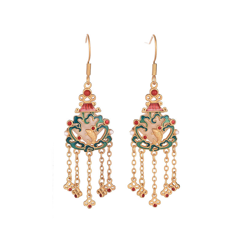 艾尔缘首饰国潮古法镀金仿和田玉鱼跃龙门流苏古风旗袍汉服耳环女