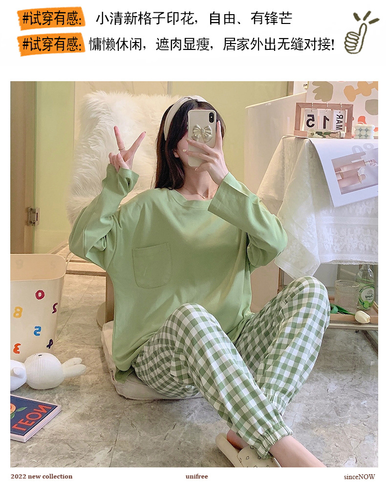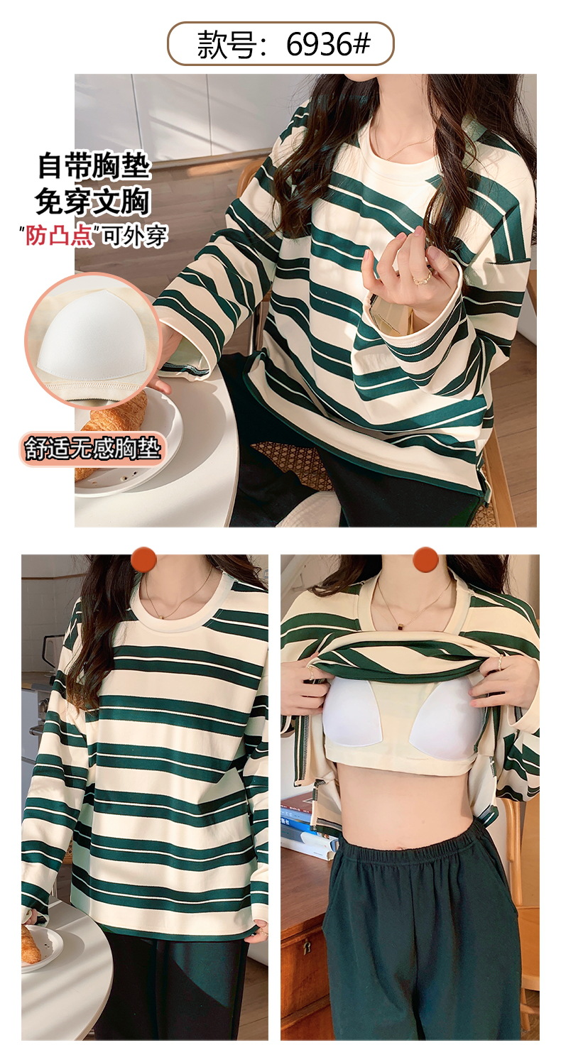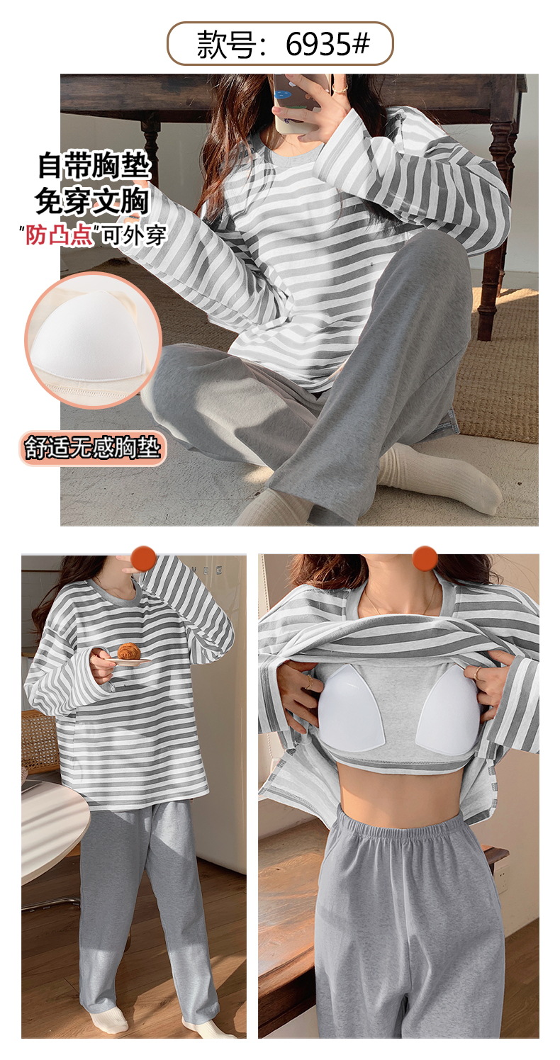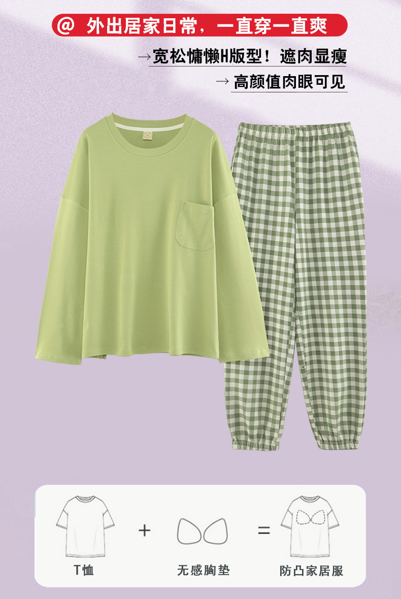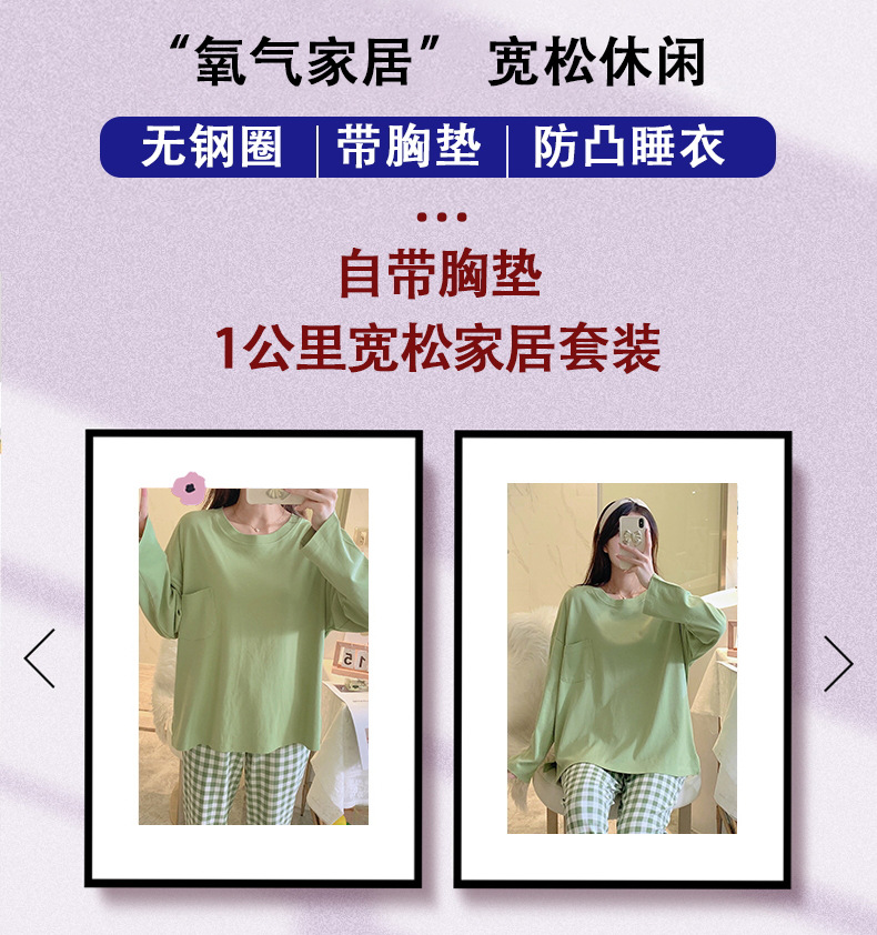 棉女士春秋季睡衣女长袖带胸垫宽松棉质韩版家居服套装可外穿无印