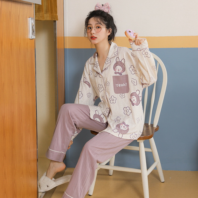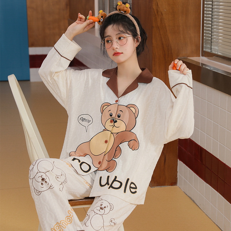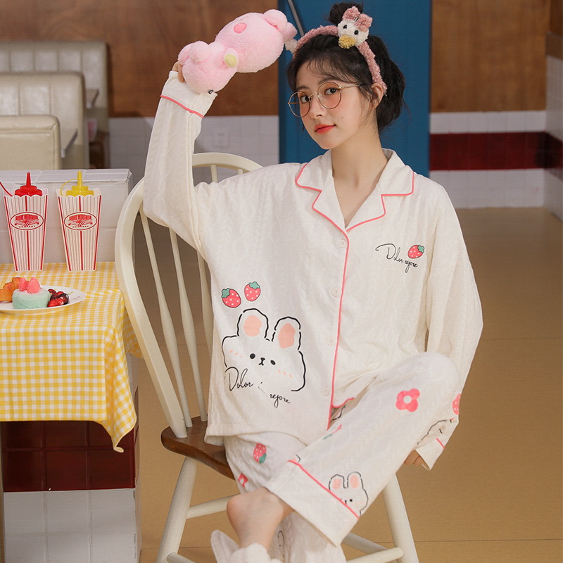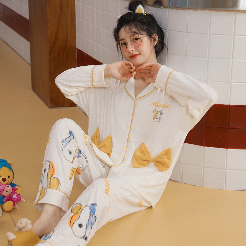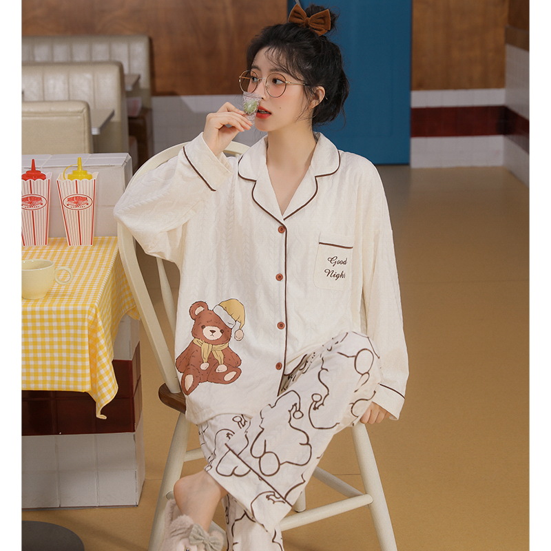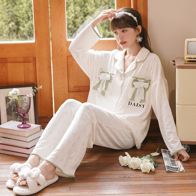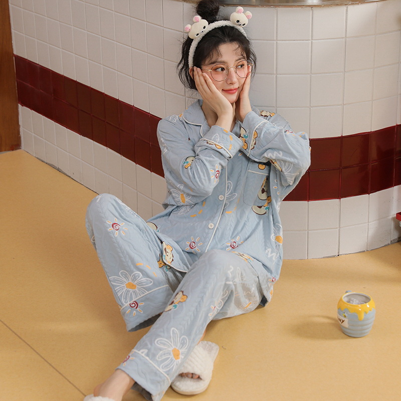 2023年新款春秋季长袖仿棉提花睡衣女甜美韩版开衫家居服套装外穿