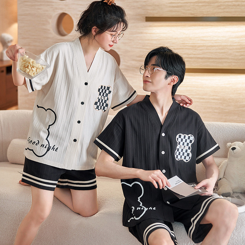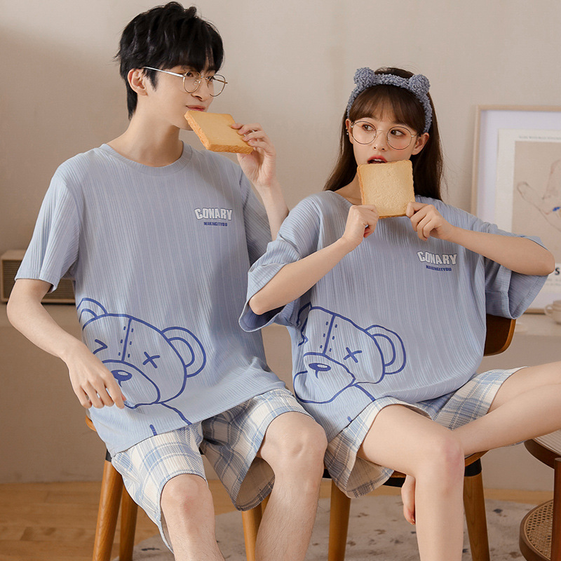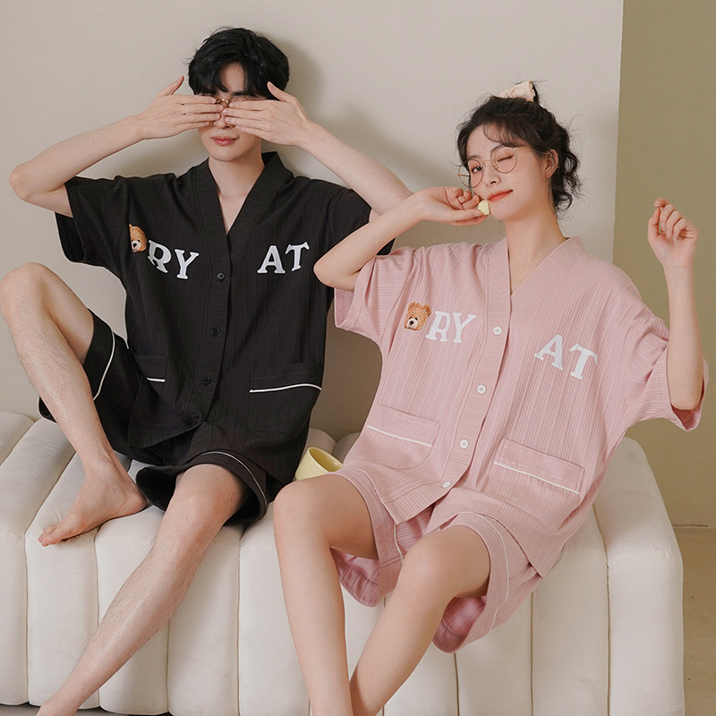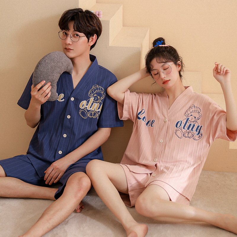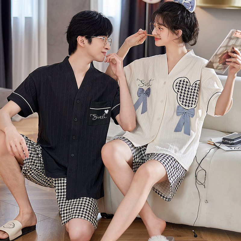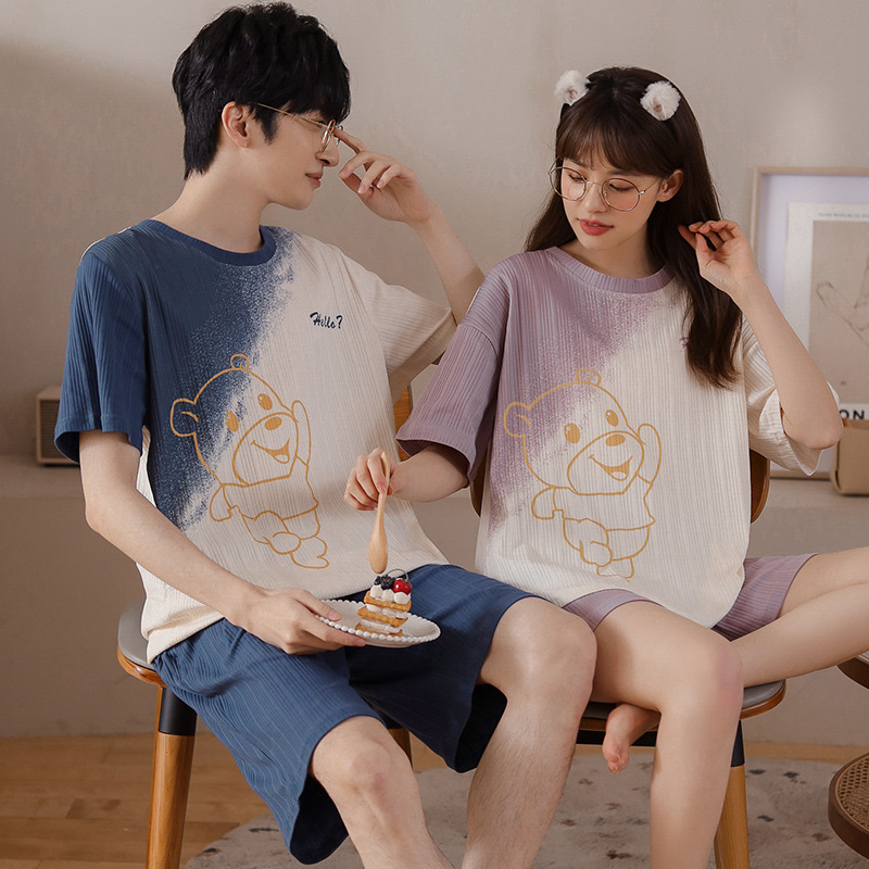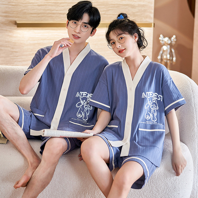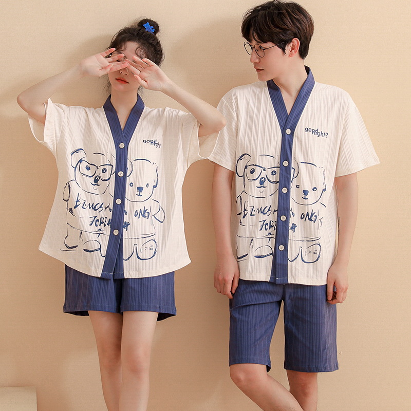 2023新款短袖情侣睡衣女夏季棉质家居服可爱卡通开衫男士大码套装