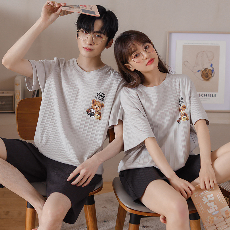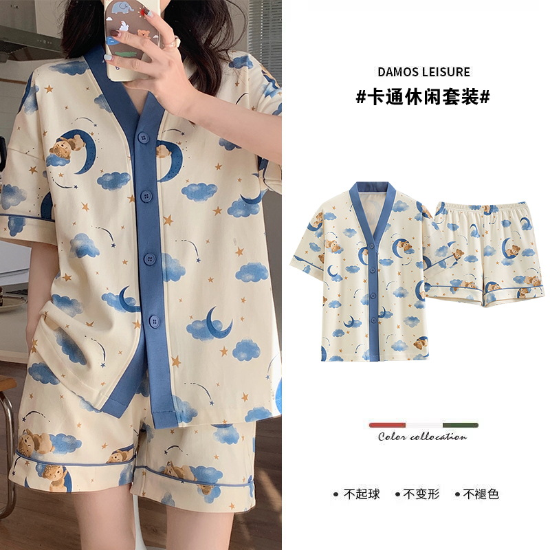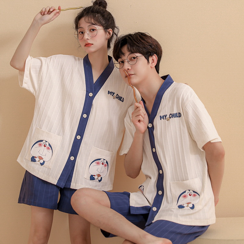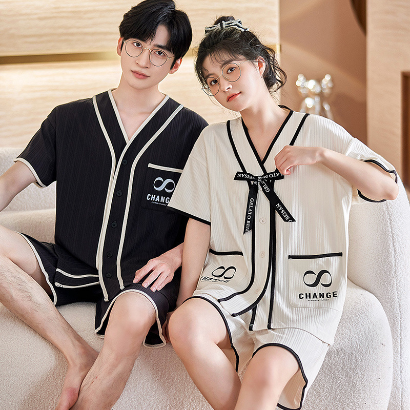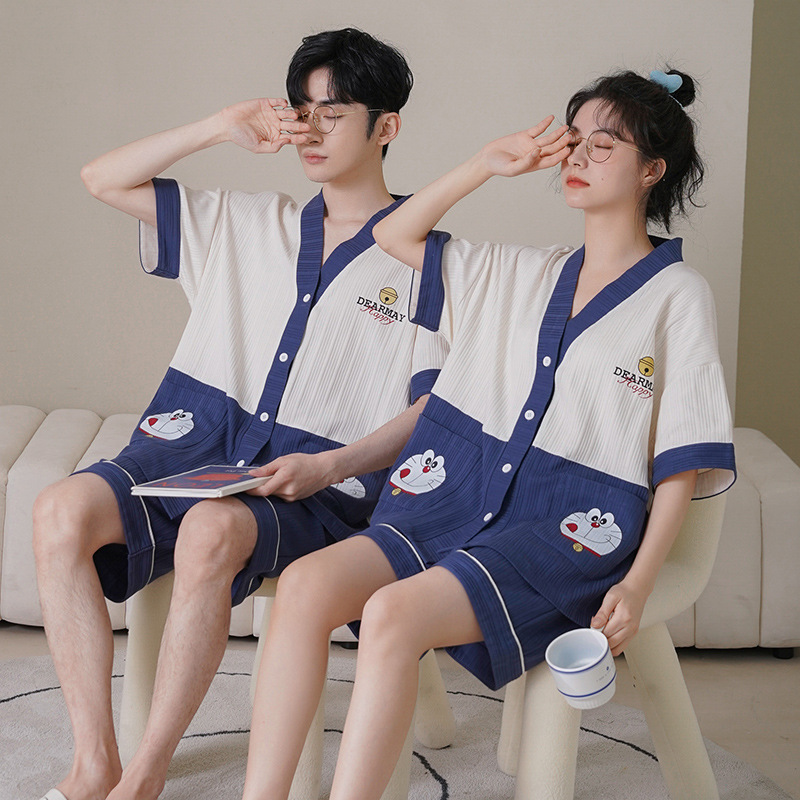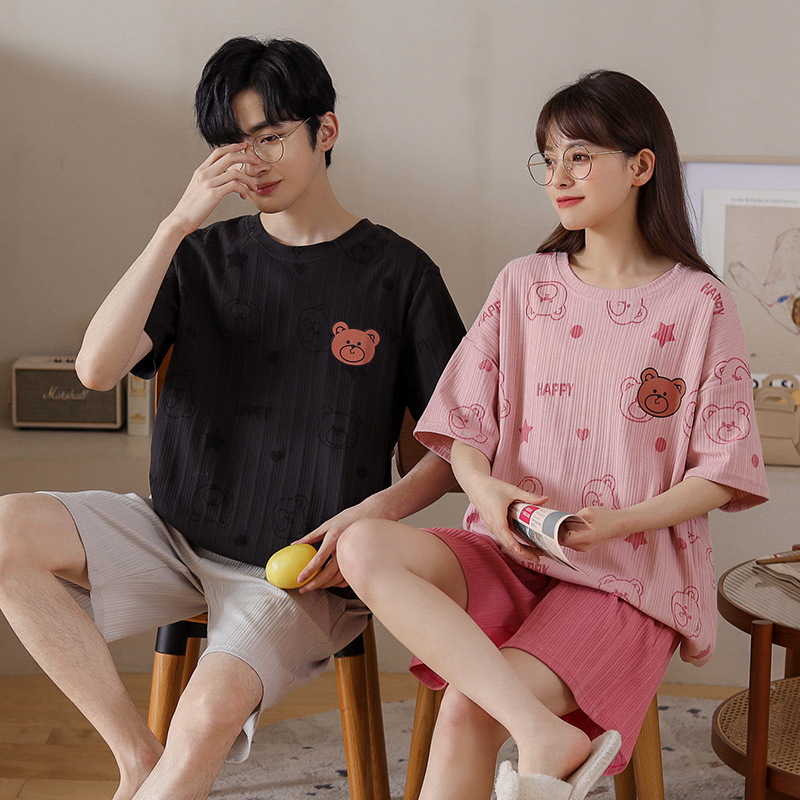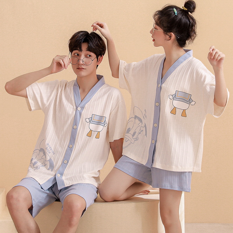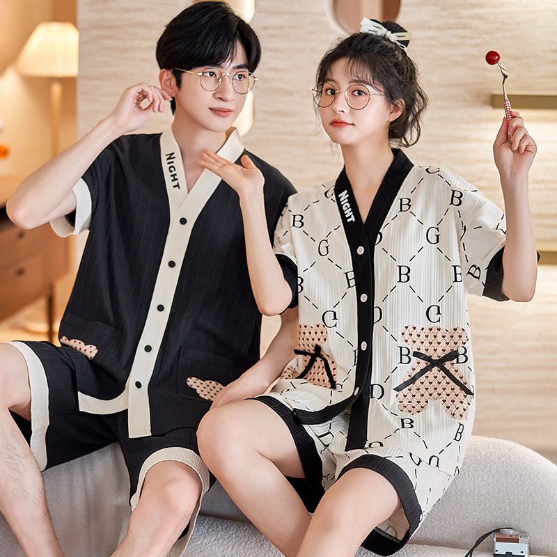 2023新款短袖情侣睡衣女夏季棉质家居服可爱卡通开衫男士大码套装