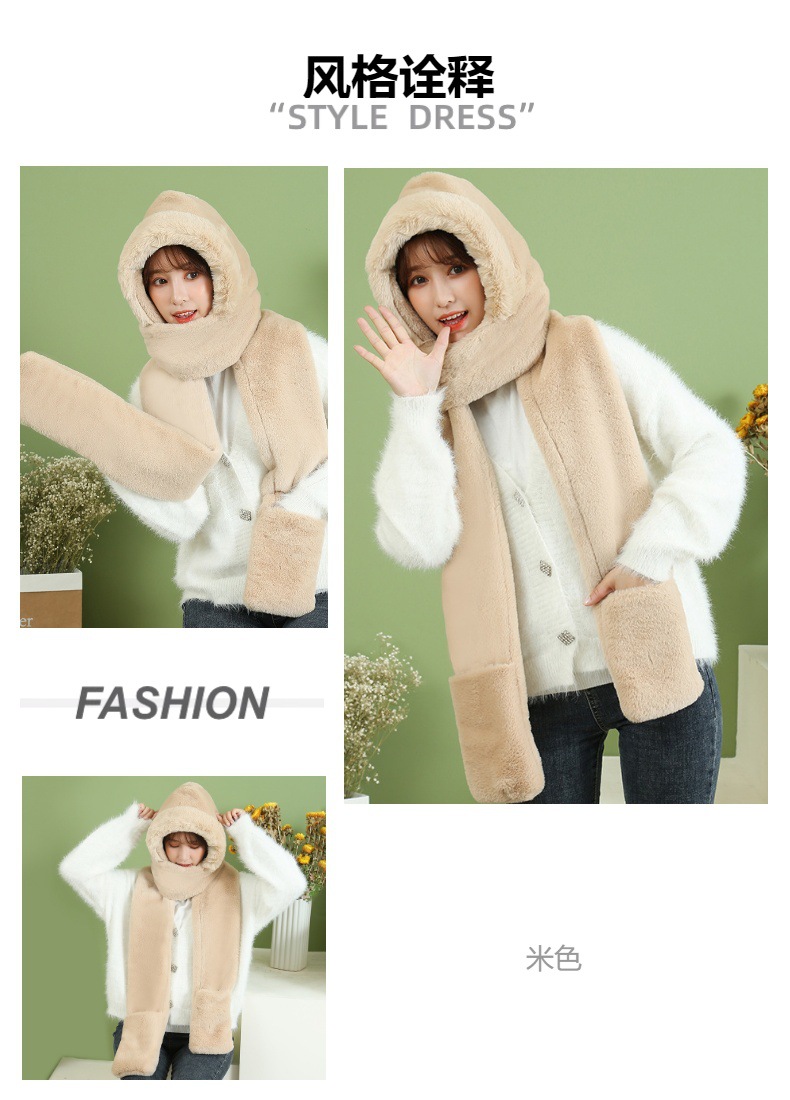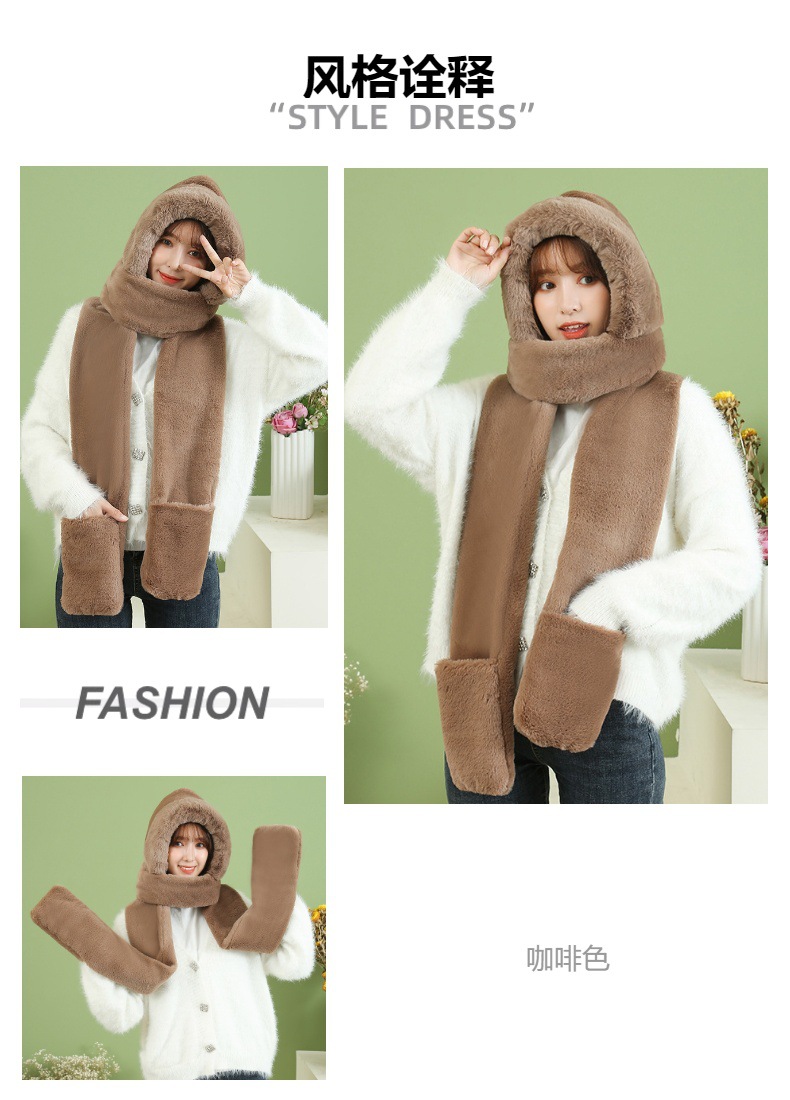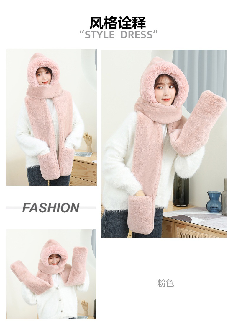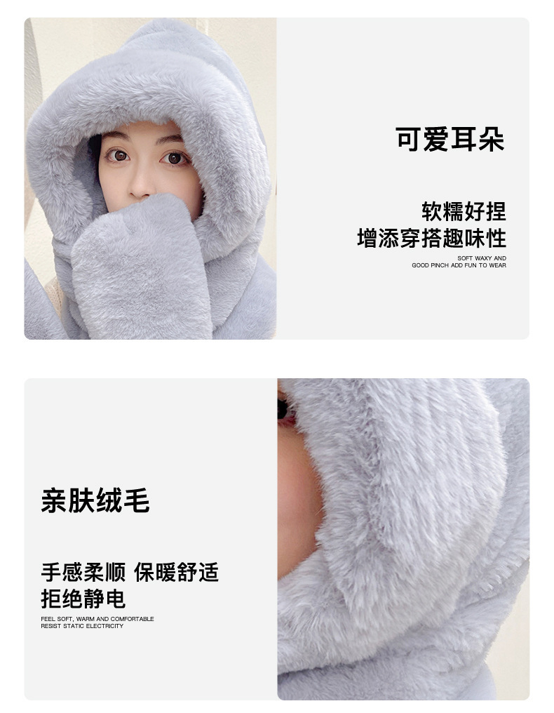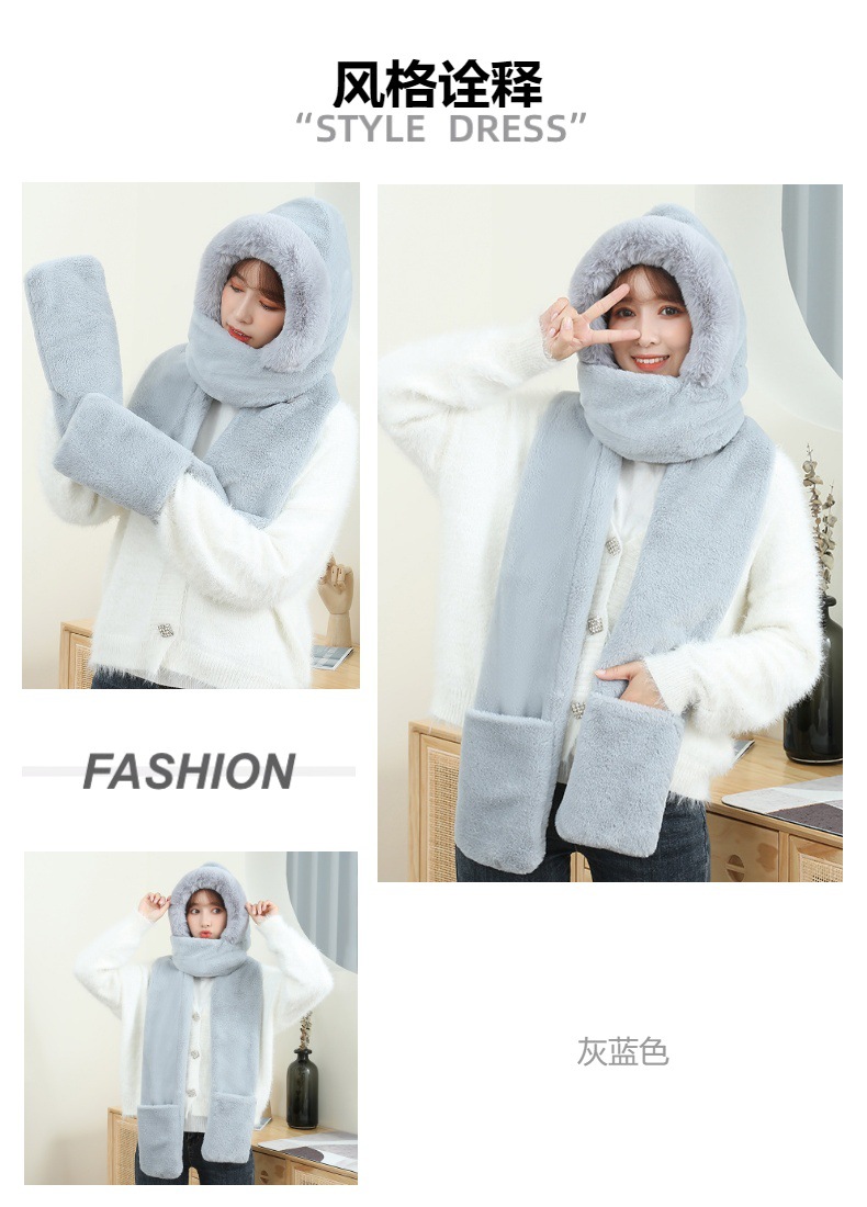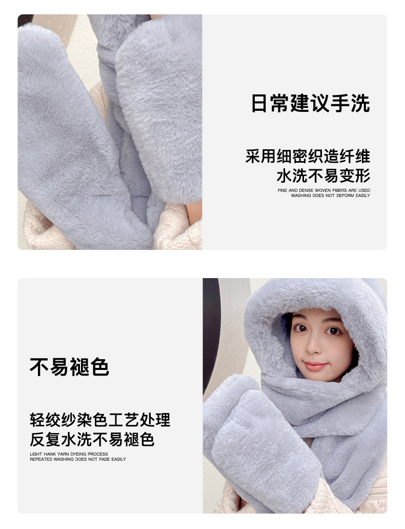 仿兔毛纯色大毛领帽子围巾手套一体保暖三件套冬男女通用网红加厚