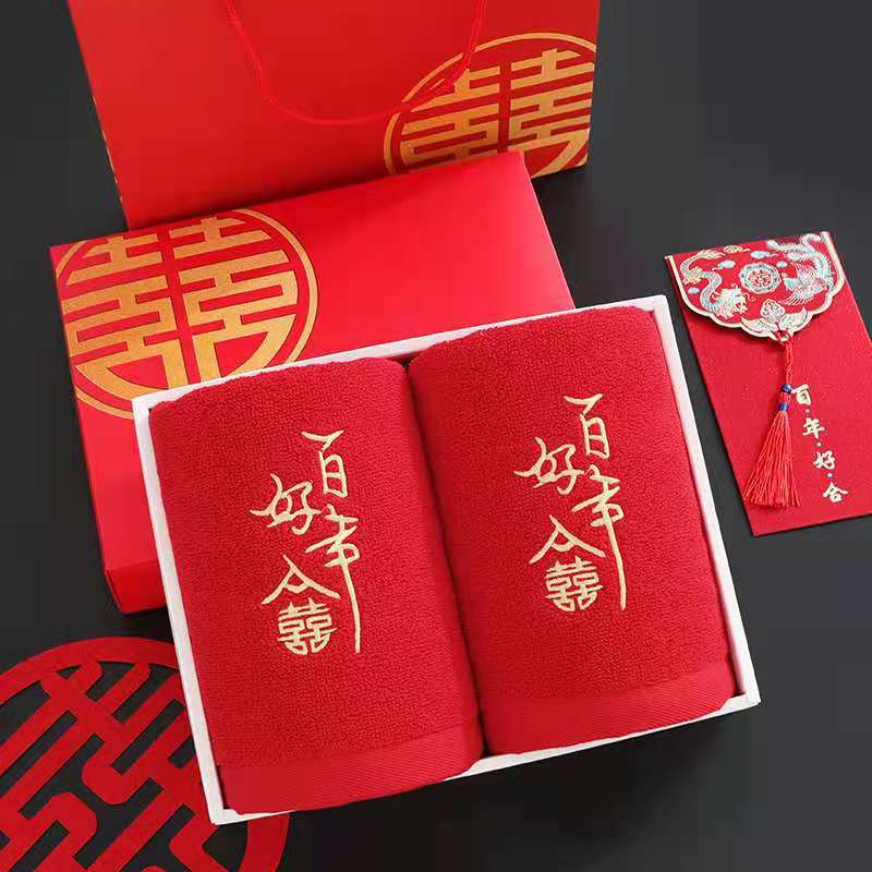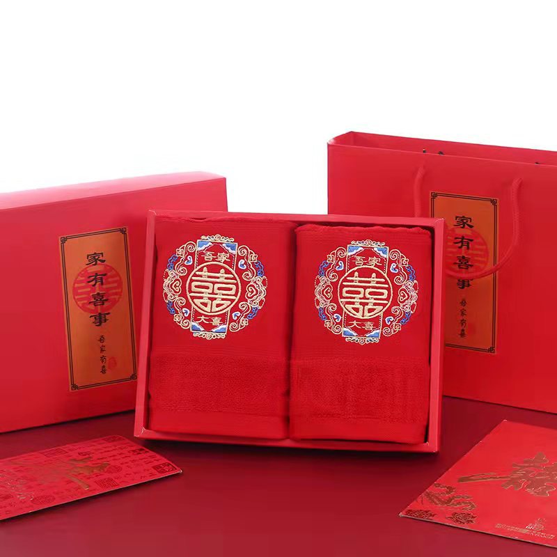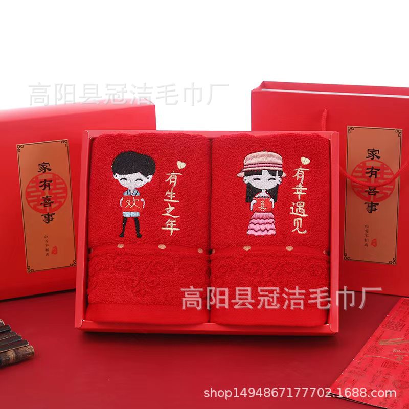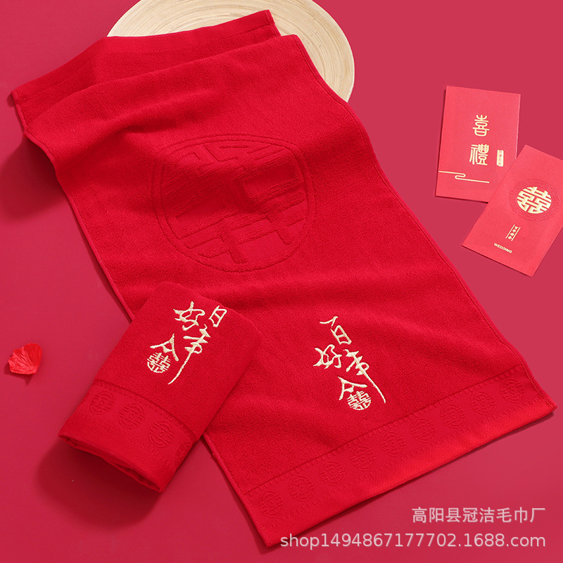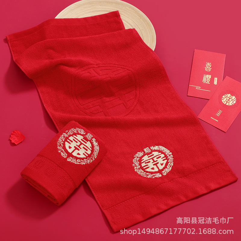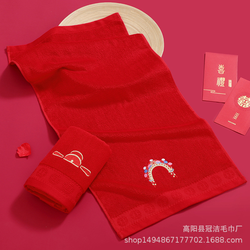 厂家批发结婚毛巾加厚刺绣大红喜字婚庆毛巾棉喜帕回礼logo刺绣