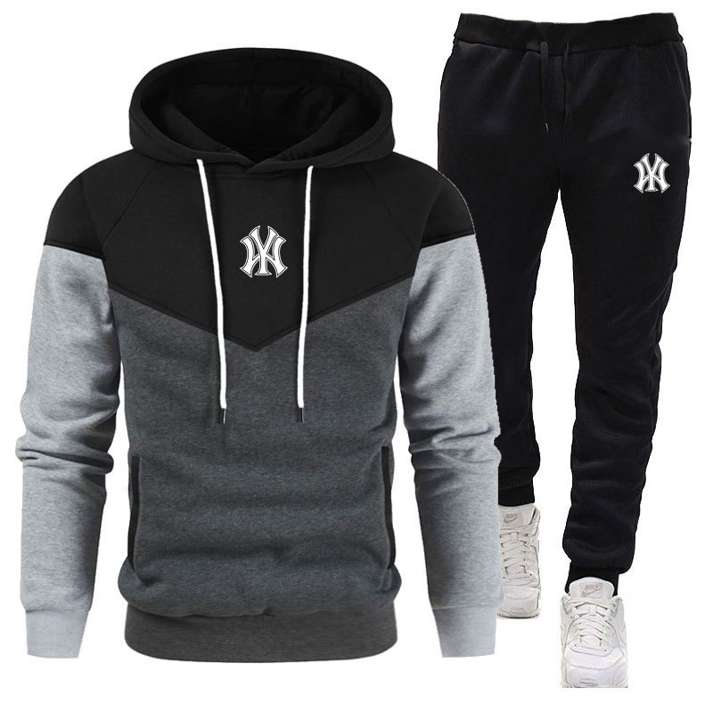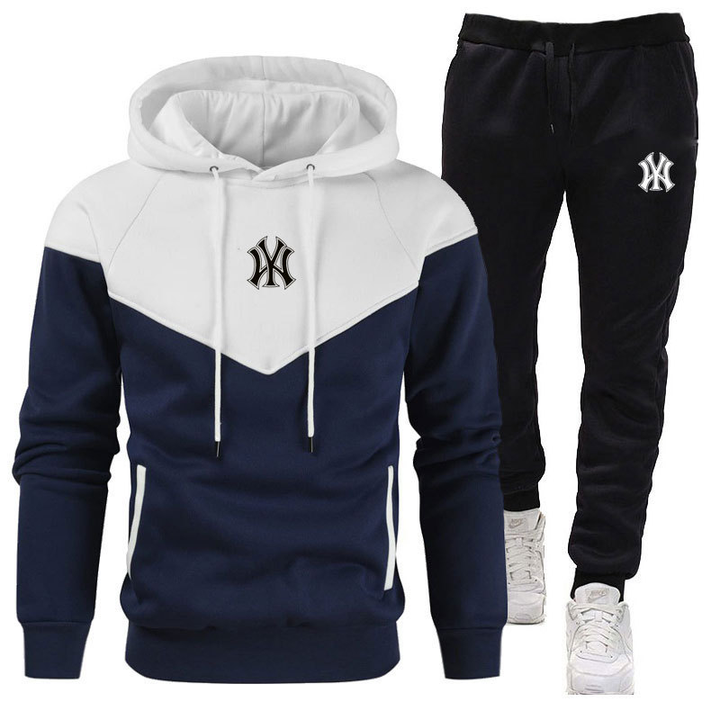 跨境新品男士加绒拼接连帽衫卫衣套装拼接印花休闲运动套装2件套