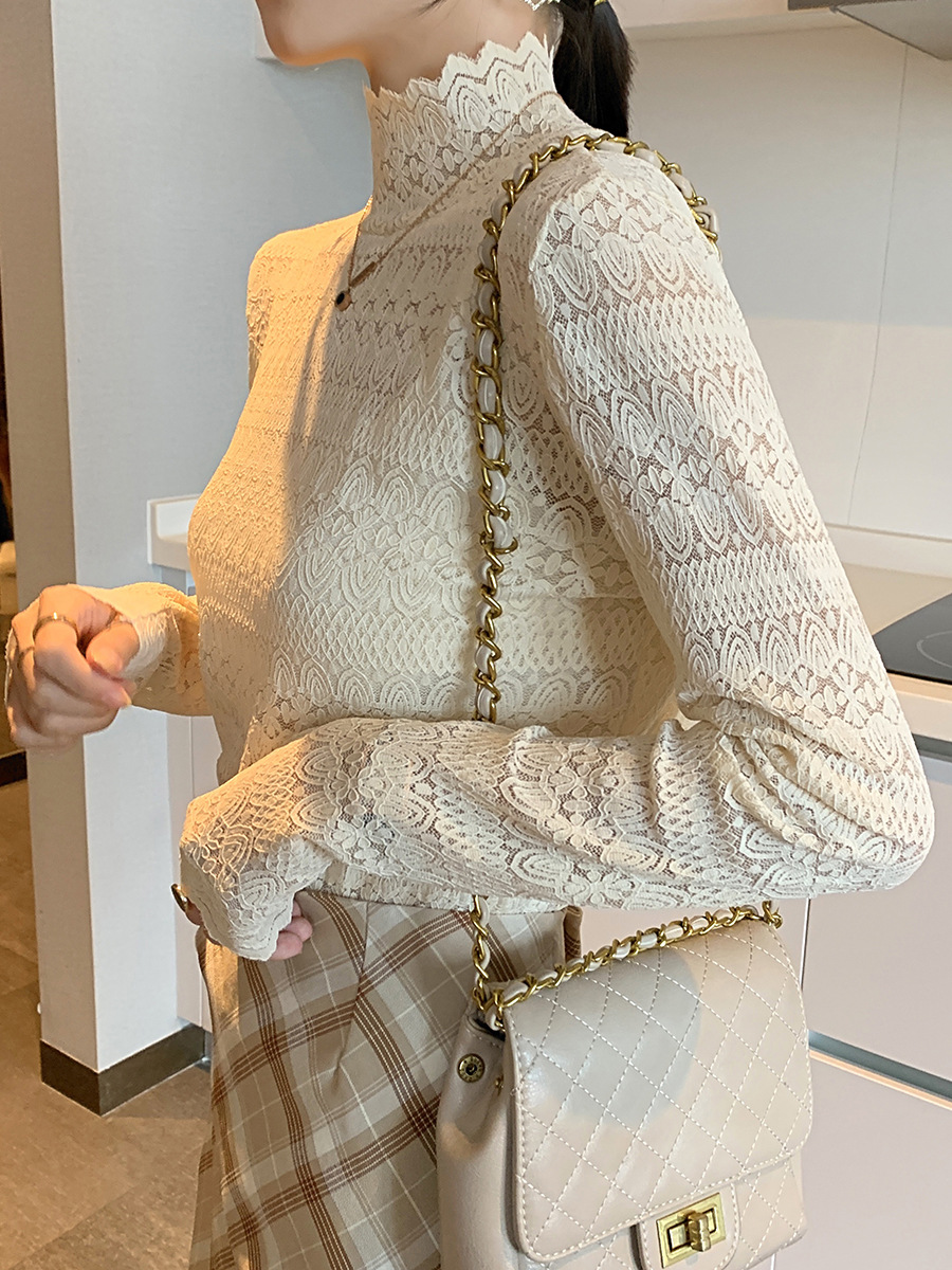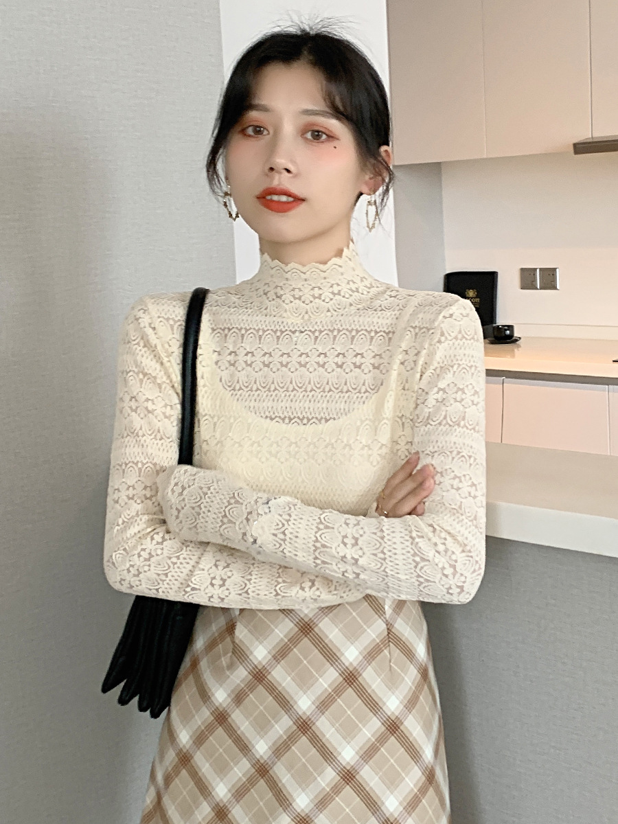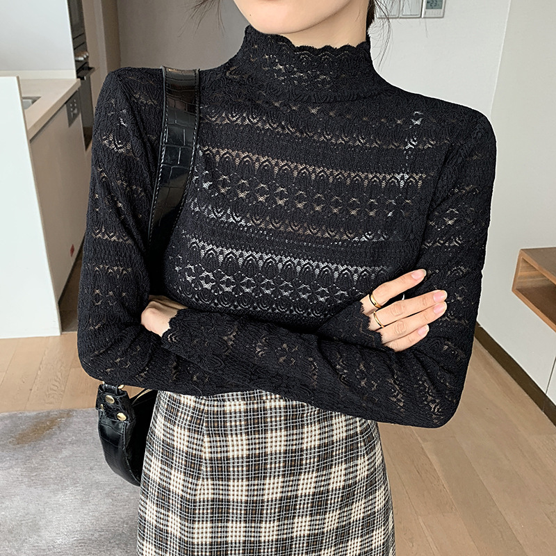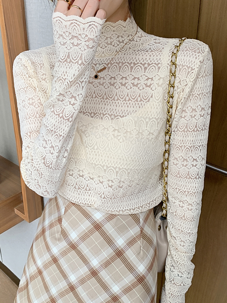 蕾丝网纱内搭仙女清新甜美上衣镂空打底衫女长袖秋装新款外穿大码