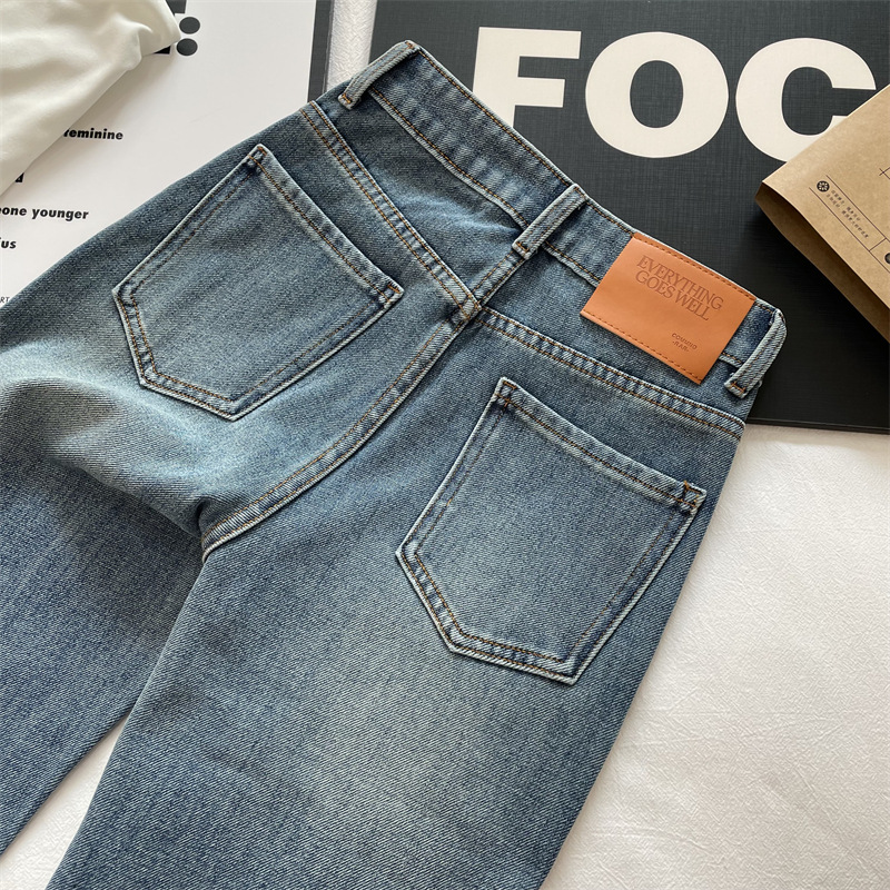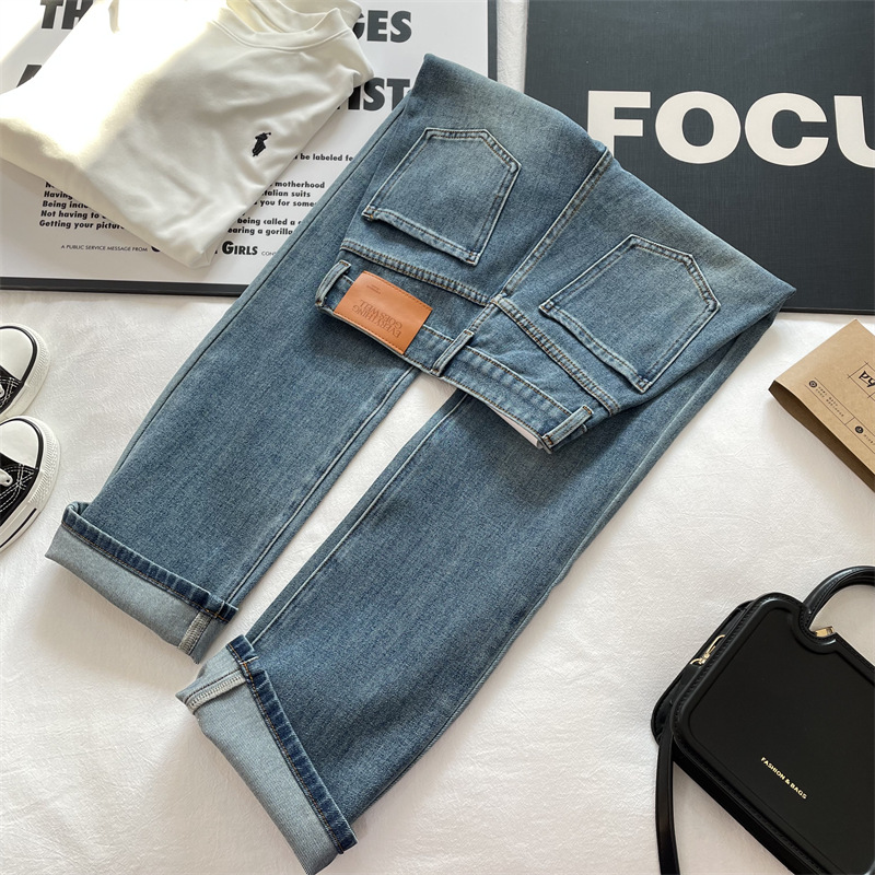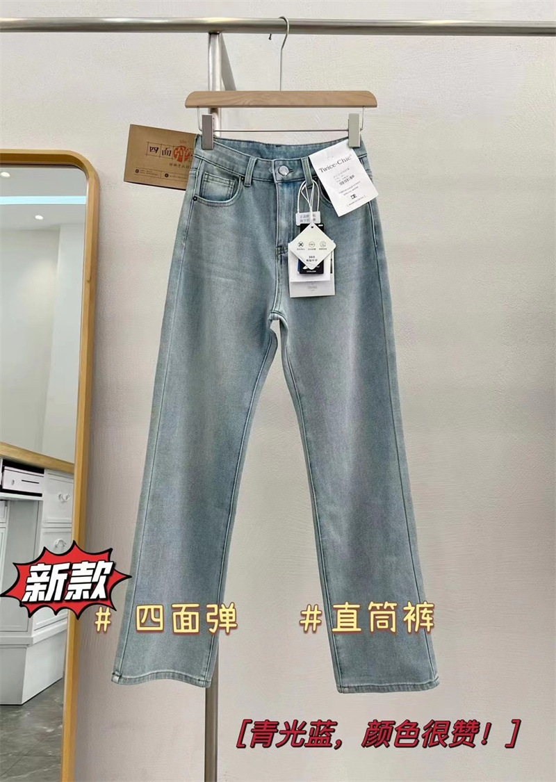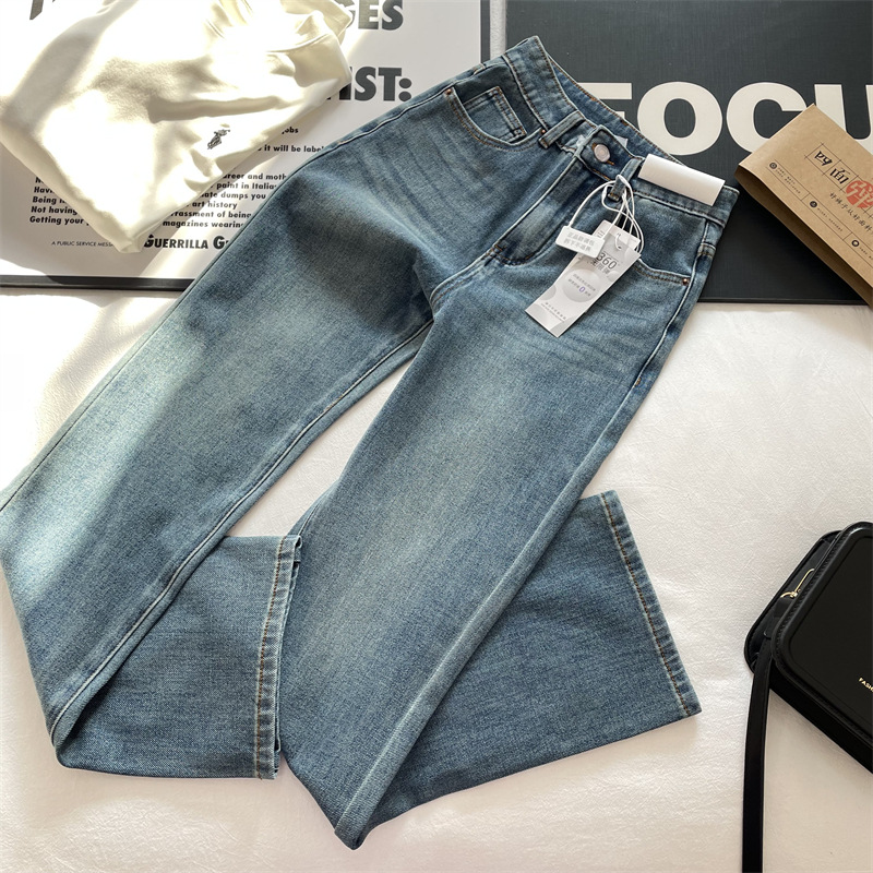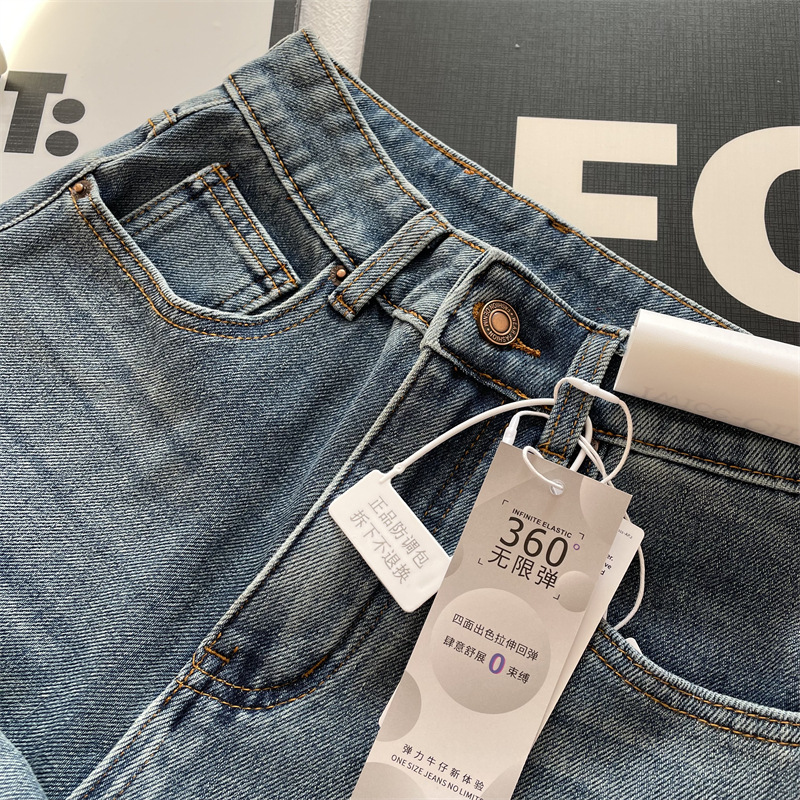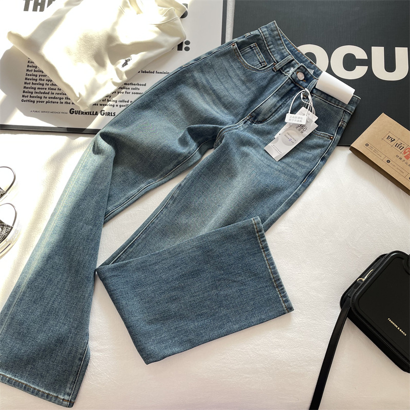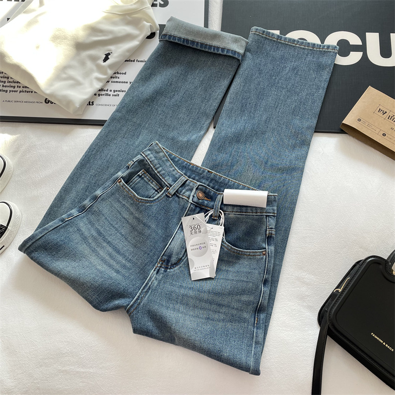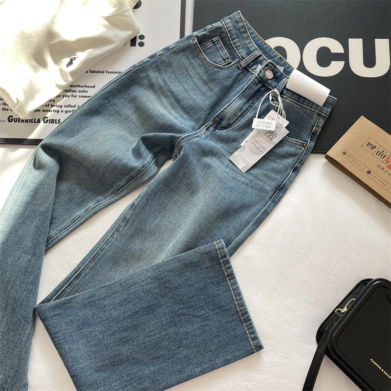 四面弹窄版超柔纱直筒长裤高腰显瘦百搭怀旧蓝弹力牛仔裤女春秋新