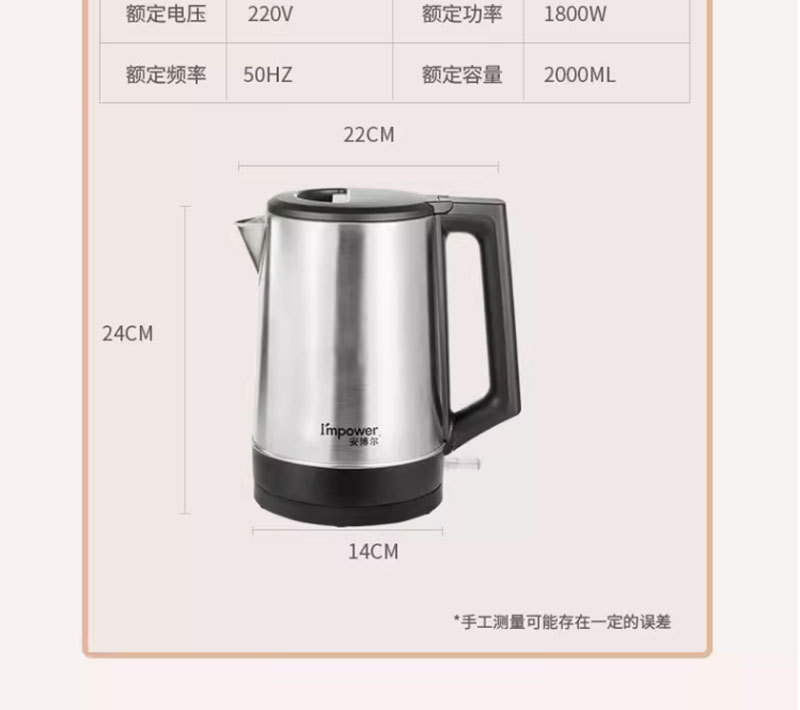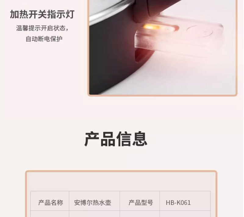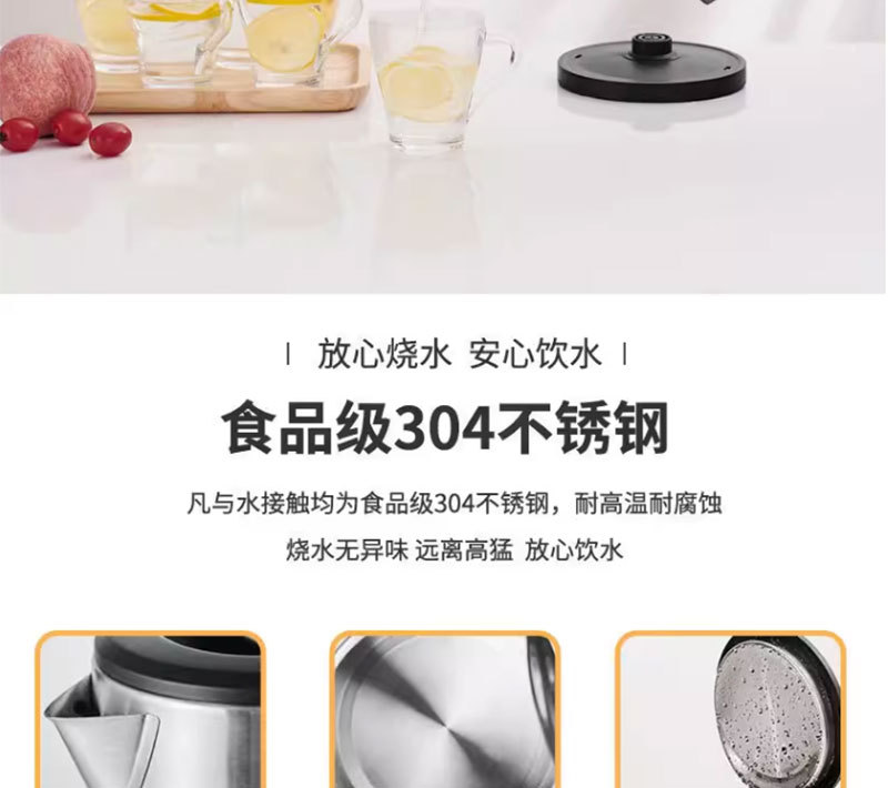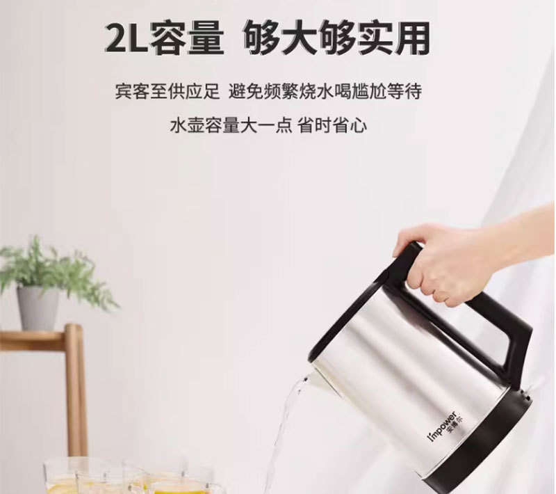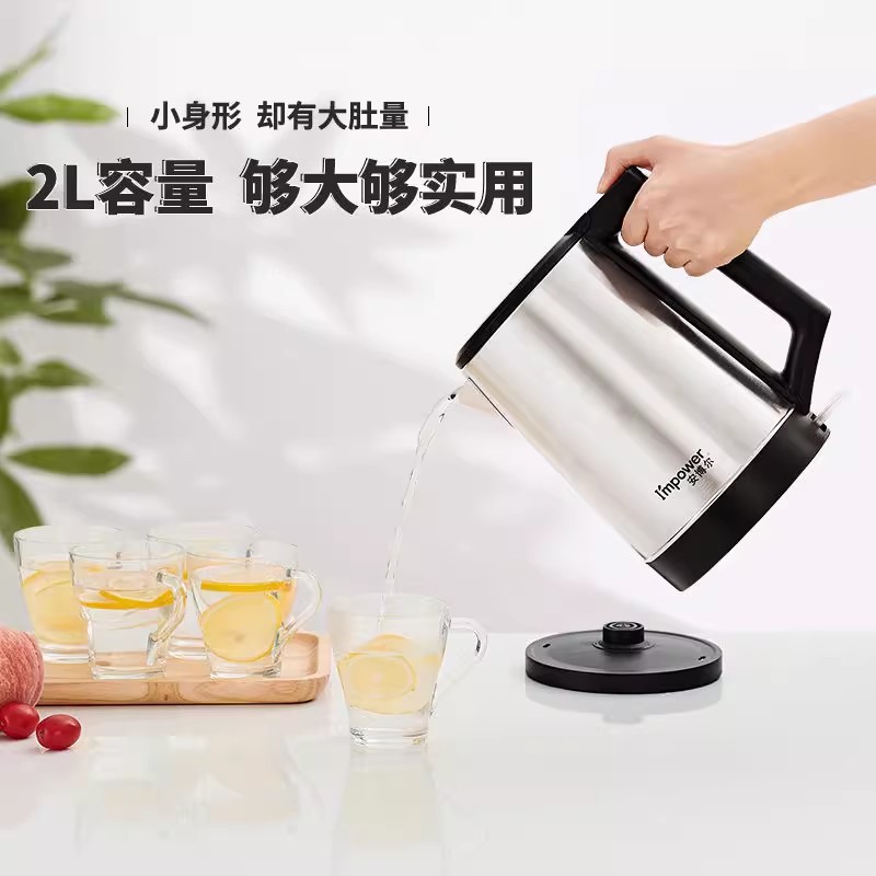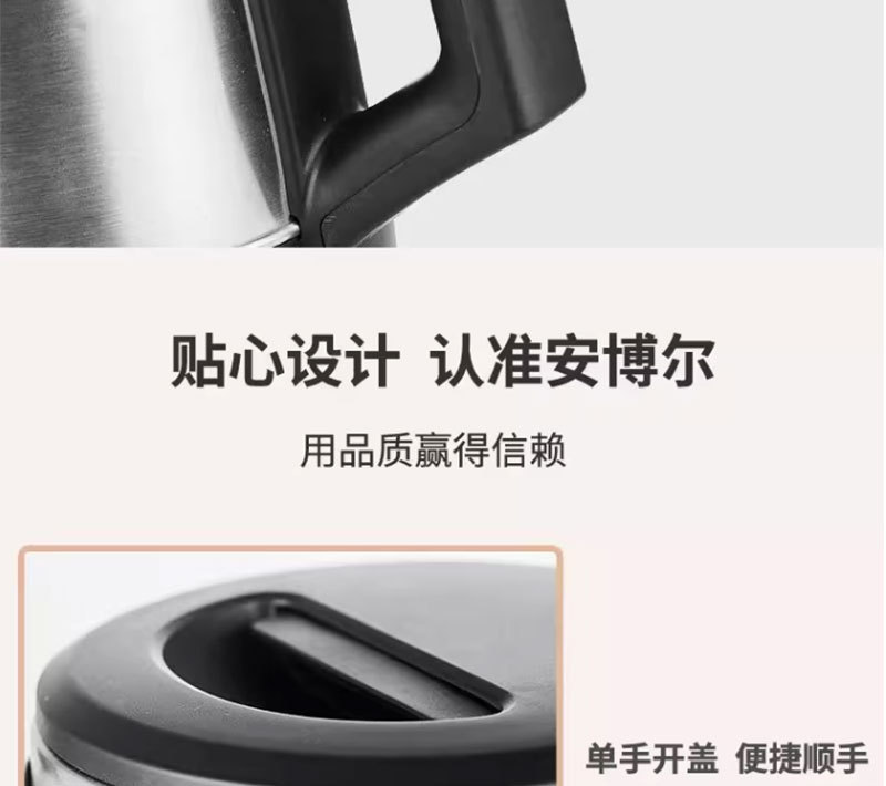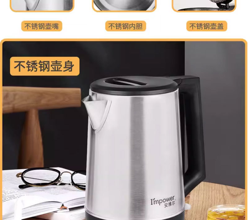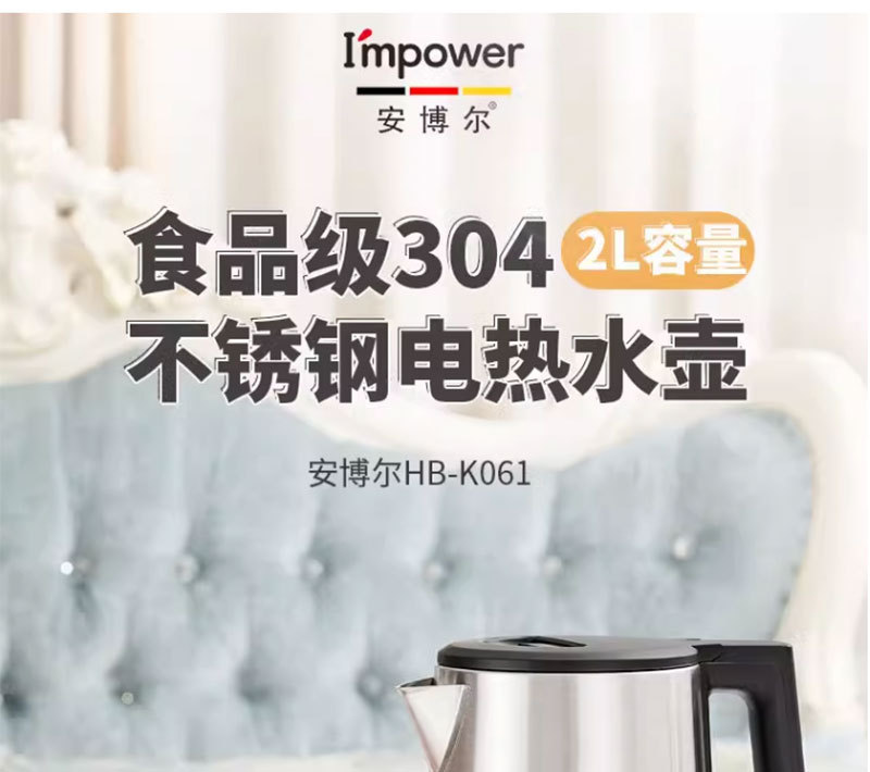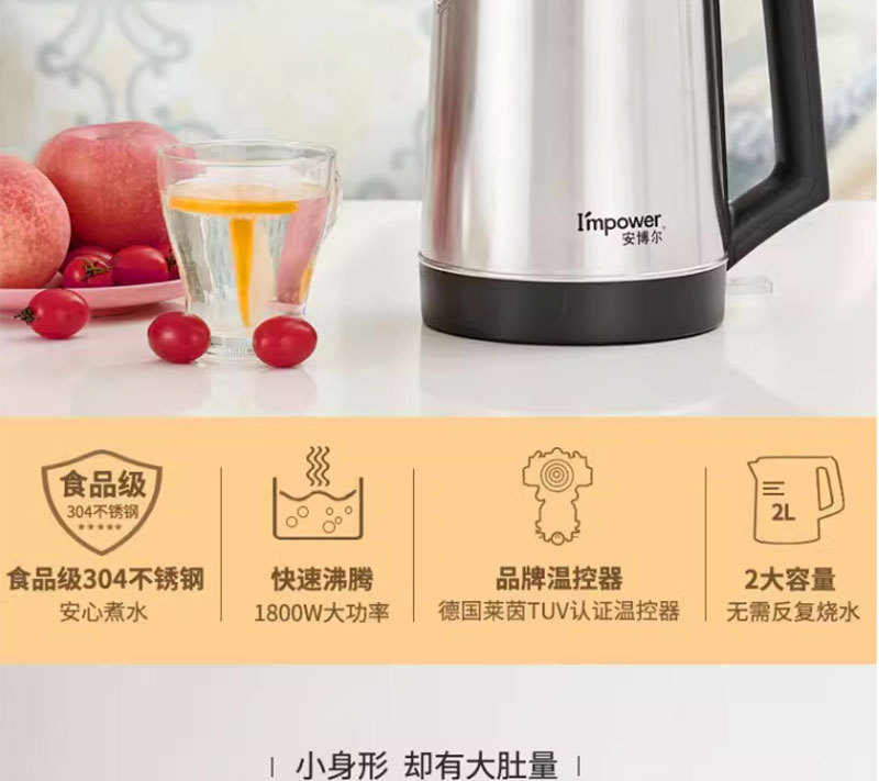 安博尔304不锈钢厚家用快烧电热水壶2升大容量自动断电HB-K061