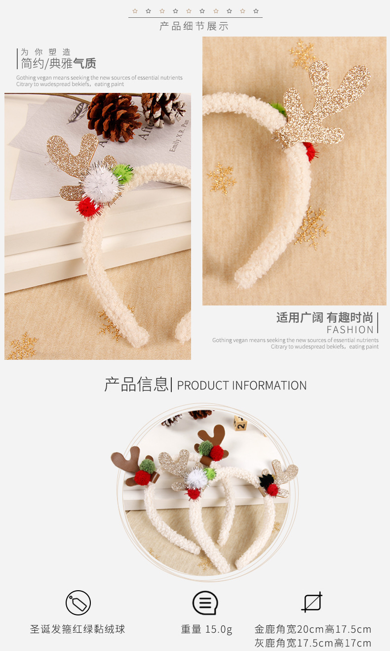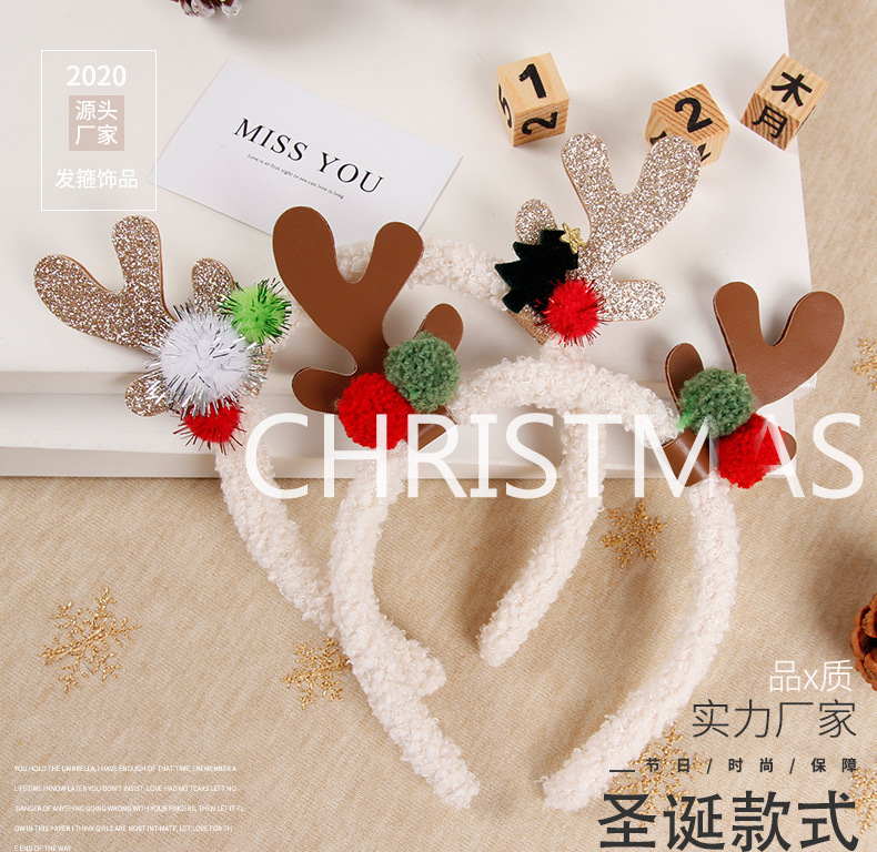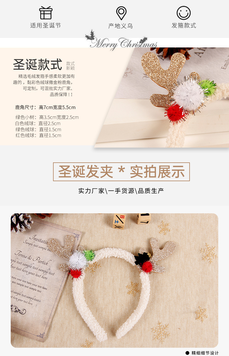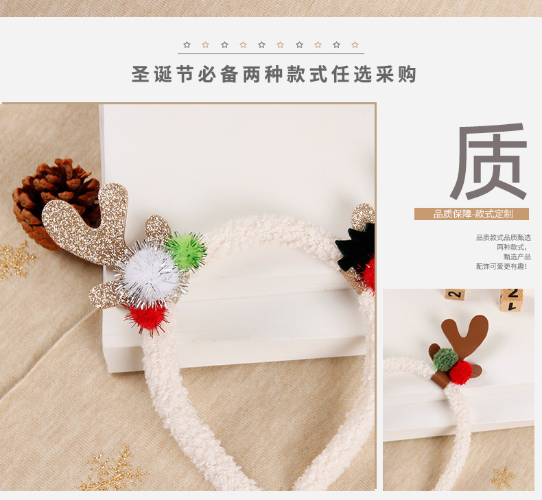 跨境圣诞节新款头箍箍麋鹿毛绒彩色可爱女毛粘球发箍圣诞装饰品