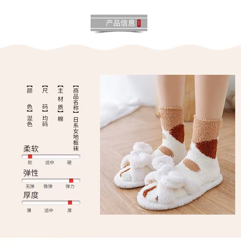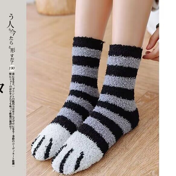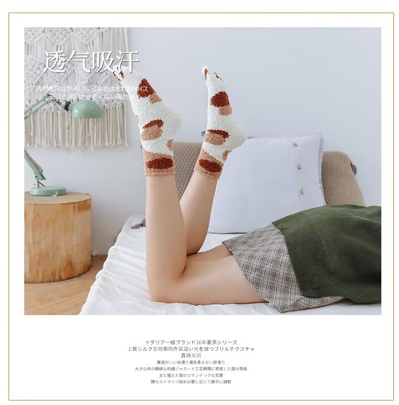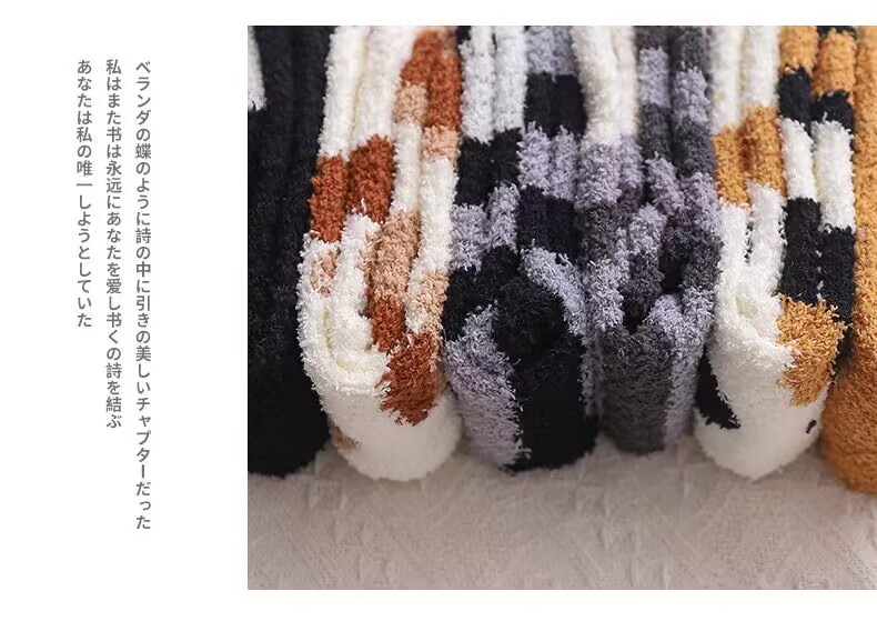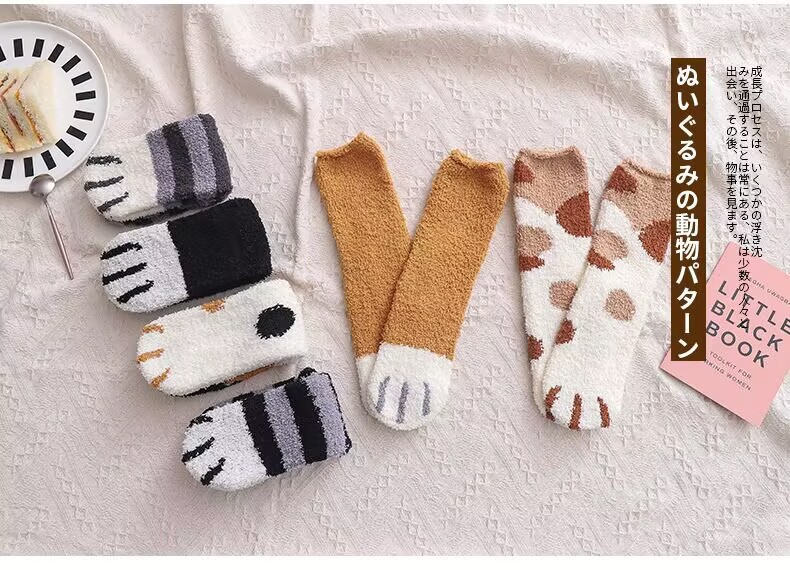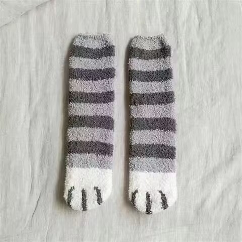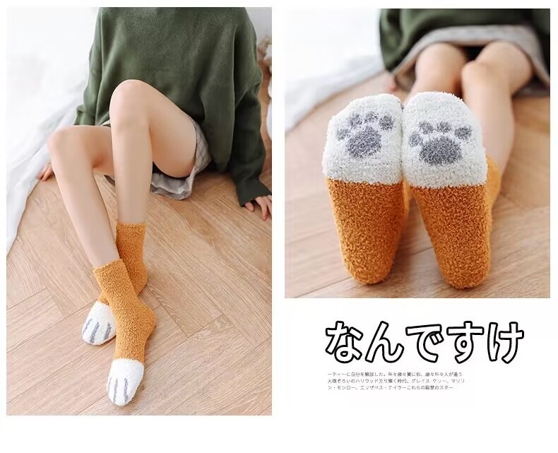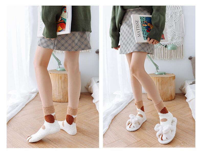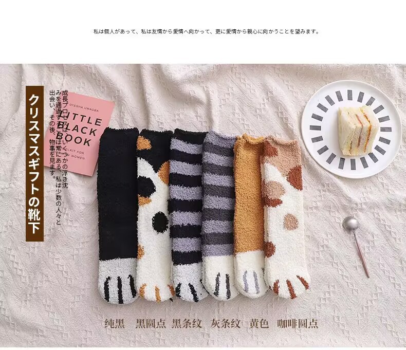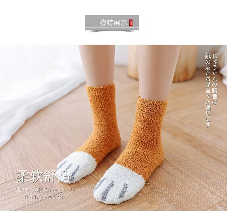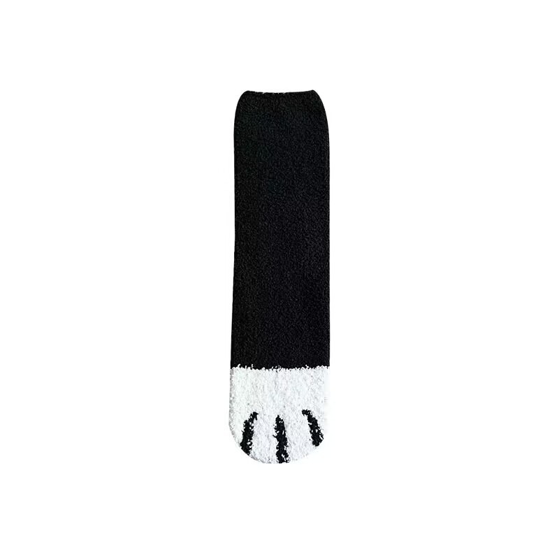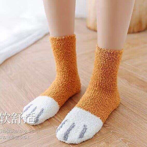 女款秋冬季节珊瑚绒中筒袜可爱猫爪袜子加绒加厚女袜睡眠袜月子袜